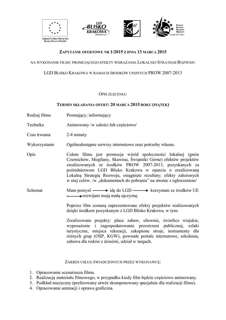 ZAPYTANIE OFERTOWE NR 1/2015 Z DNIA 13 MARCA 2015 NA WYKONANIE FILMU PROMUJĄCEGO EFEKTY WDRAŻANIA LOKALNEJ STRATEGII ROZWOJU LGD BLISKO KRAKOWA W RAMACH ŚRODKÓW UNIJNYCH PROW 2007-2013 OPIS ZLECENIA: TERMIN SKŁADANIA OFERT: 20 MARCA 2015 ROKU (PIĄTEK) Rodzaj filmu Promujący; informujący Technika Animowany /w całości lub częściowo/ Czas trwania 2-4 minuty Wykorzystanie Ogólnodostępne serwisy internetowe oraz potrzeby własne. Opis Celem filmu jest promocja wśród społeczności lokalnej (gmin Czernichów, Mogilany, Skawina, Świątniki Górne) efektów projektów zrealizowanych ze środków PROW 2007-2013, pozyskanych za pośrednictwem LGD Blisko Krakowa w oparciu o zrealizowaną Lokalną Strategię Rozwoju, osiągnięte rezultaty; efekty założonych w niej celów. /w „dokumentach do pobrania” na stronie z ogłoszeniem/ Schemat Mam pomysł idę do LGD – rozwijam moją małą ojczyznę. korzystam ze środków UE Poprzez film zostaną zaprezentowane efekty projektów realizowanych dzięki środkom pozyskanym z LGD Blisko Krakowa, w tym: Zrealizowane projekty: place zabaw, siłownie, świetlice wiejskie, wyposażenie i zagospodarowanie przestrzeni publicznej, szlaki turystyczne, miejsca rekreacji, zakupione stroje, instrumenty dla różnych grup (OSP, KGW), powstałe portale internetowe, szkolenia, zabawa dla rodzin z dziećmi, udział w targach. ZAKRES USŁUG ŚWIADCZONYCH PRZEZ WYKONAWCĘ: 1. 2. 3. 4. Opracowanie scenariusza filmu. Realizację materiału filmowego, w przypadku kiedy film będzie częściowo animowany. Podkład muzyczny (preferowany utwór skomponowany specjalnie dla realizacji filmu). Opracowanie animacji i oprawa graficzna. 5. Przygotowanie filmu do publikacji w Internecie. 6. Szczegółowe zasady realizacji filmu określać będzie umowa. OFERTA POWINNA ZAWIERAĆ: 7. Nazwę oferenta. 8. Dane teleadresowe: adres, e-mail, telefon kontaktowy, stronę internetową. 9. Pieczęć i podpis osoby upoważnionej. 10. Datę sporządzenia. 11. Nie więcej niż 3 propozycje, z czego każda powinna zawierać: a. Wstępną koncepcję scenariusza (pomysł na film); b. Przynajmniej po 1 przykładzie realizacji, z podaniem informacji czy realizacja jest wykonana przez oferenta (preferowane). c. Opis techniki lub technik wykonania. d. Proponowany czas trwania. e. Cena brutto. f. Wykaz elementów, na które składa się proponowana realizacja. 12. Termin wykonania. 13. Termin ważności oferty. PROCEDURA OCENY I WYBORU: Oferty należy dostarczyć do Biura LGD Blisko Krakowa do dnia 20 marca 2015 roku w formie elektronicznej (mail) lub papierowej (osobiście/pocztą/kurierem). Liczy się data wpływu oferty do Biura LGD. Zarząd dokona oceny ofert, które wpłynęły w terminie, na podstawie poniższych kryteriów: 1. Wartość merytoryczna – 0-10 pkt (ocena na podstawie pkt 11a i 11c oferty), 2. Doświadczenie – 0-6 pkt (ocena na podstawie pkt 11b. oferty), 3. Cena – 0-4 pkt (ocena na podstawie pkt 11e oferty), według wzoru: najniższa cena brutto spośród złożonych ofert C= x 4 pkt cena brutto ocenianej oferty Zarząd może poprosić wybranych oferentów o podanie dodatkowych informacji odnośnie złożonej oferty. W przypadku kiedy kilka ofert uzyska tę samą ilość punktów, wybrana zostanie oferta z najniższą ceną. Dane teleadresowe: ul. Żwirki i Wigury 23, 32-050 Skawina (pon.-pt. g. 8.00-16.00) mail. [email protected] tel. 12-256-02-31, 537-022-729 www.bliskokrakowa.pl www.skarby.bliskokrakowa.pl Europejski Fundusz Rolny Rozwoju na rzecz Rozwoju Obszarów Wiejskich: Europa inwestująca w obszary wiejskie. Realizacja filmu współfinansowana ze środków Unii Europejskiej w ramach Działania 4.31 Funkcjonowanie LGD, objętego Programem Rozwoju Obszarów Wiejskich na lata 2007-2013. Instytucja Zarządzająca Programem Rozwoju Obszarów Wiejskich na lata 2007-2013 – Minister Rolnictwa i Rozwoju Wsi.