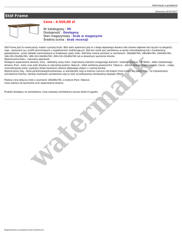 Informacje o produkcie Utworzono 02-03-2017 Stół Frame Cena : 4.550,00 zł Nr katalogowy : MI Dostępność : Dostępny Stan magazynowy : brak w magazynie Średnia ocena : brak recenzji er m ar k Stół Frame jest to nowoczesny mebel o prostej bryle. Blat stołu wykonany jest w z litego dębowego drewna (lite drewno dębowe bez łączeń na długość), nogi - wykonane są z profili aluminiowych z wypełnieniem stabilizującym. Stół ten może być zamówiony w wersji nierozkładanej lub z możliwością powiększenia - przez wkładki zamontowane w środkowej części stołu. Stół blox można zamówić w rozmiarach: 160x80x76h; 180x90x76h; 200x90x76h; 160+50+50x90x76h; 180+50+50x90x76h; 200+50+50x90x76h lub w dowolnym wymiarze klienta. Wykończenie blatu - naturalny olejowosk. Dostępne wybarwienie drewna: Grey - delikatny szary kolor, inspirowany kolorem smaganego słońcem i wiatrem drewna; Off White - efekt rozbielonego drewna; Pure - kolor oraz wzór drewna w naturalnej postaci; Natural - efekt zwilżenia powierzchni; Tabacco - odcień złotego brązu i miedzi; Cacao - ciepły, ciemnobrązowy kolor uzyskany dzięki barwieniu drewna dębowego olejem o czarnej barwie. Wykończenie nóg - farba poliestrowa/poliuretanowa, w standardzie nogi w kolorze czarnym lub białym (inne kolory wg palety RAL - na indywidualne zamówienie klienta). Istnieje możliwość zamówienia nóg ze stali szczotkowanej nierdzewnej (dopłata 300zł). Podana cena dotyczy stołu o wymiarze 160x80x76h, w kolorze Pure i Natural. Cena zależna od wymiarów oraz wybarwienia drewna. w at Produkt dostępny na zamówienie. Czas realizacji zamówienia wynosi około 6 tygodni. Wygenerowano w programie www.oscGold.com