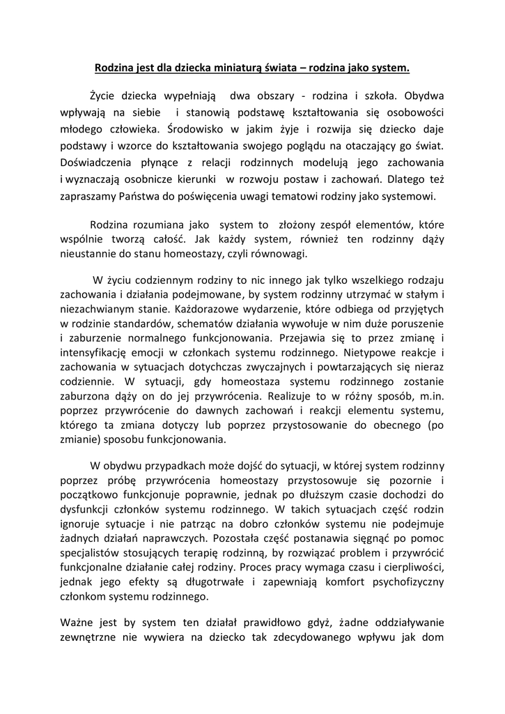 Rodzina jest dla dziecka miniaturą świata – rodzina jako system. Życie dziecka wypełniają dwa obszary - rodzina i szkoła. Obydwa wpływają na siebie i stanowią podstawę kształtowania się osobowości młodego człowieka. Środowisko w jakim żyje i rozwija się dziecko daje podstawy i wzorce do kształtowania swojego poglądu na otaczający go świat. Doświadczenia płynące z relacji rodzinnych modelują jego zachowania i wyznaczają osobnicze kierunki w rozwoju postaw i zachowań. Dlatego też zapraszamy Państwa do poświęcenia uwagi tematowi rodziny jako systemowi. Rodzina rozumiana jako system to złożony zespół elementów, które wspólnie tworzą całość. Jak każdy system, również ten rodzinny dąży nieustannie do stanu homeostazy, czyli równowagi. W życiu codziennym rodziny to nic innego jak tylko wszelkiego rodzaju zachowania i działania podejmowane, by system rodzinny utrzymać w stałym i niezachwianym stanie. Każdorazowe wydarzenie, które odbiega od przyjętych w rodzinie standardów, schematów działania wywołuje w nim duże poruszenie i zaburzenie normalnego funkcjonowania. Przejawia się to przez zmianę i intensyfikację emocji w członkach systemu rodzinnego. Nietypowe reakcje i zachowania w sytuacjach dotychczas zwyczajnych i powtarzających się nieraz codziennie. W sytuacji, gdy homeostaza systemu rodzinnego zostanie zaburzona dąży on do jej przywrócenia. Realizuje to w różny sposób, m.in. poprzez przywrócenie do dawnych zachowań i reakcji elementu systemu, którego ta zmiana dotyczy lub poprzez przystosowanie do obecnego (po zmianie) sposobu funkcjonowania. W obydwu przypadkach może dojść do sytuacji, w której system rodzinny poprzez próbę przywrócenia homeostazy przystosowuje się pozornie i początkowo funkcjonuje poprawnie, jednak po dłuższym czasie dochodzi do dysfunkcji członków systemu rodzinnego. W takich sytuacjach część rodzin ignoruje sytuacje i nie patrząc na dobro członków systemu nie podejmuje żadnych działań naprawczych. Pozostała część postanawia sięgnąć po pomoc specjalistów stosujących terapię rodzinną, by rozwiązać problem i przywrócić funkcjonalne działanie całej rodziny. Proces pracy wymaga czasu i cierpliwości, jednak jego efekty są długotrwałe i zapewniają komfort psychofizyczny członkom systemu rodzinnego. Ważne jest by system ten działał prawidłowo gdyż, żadne oddziaływanie zewnętrzne nie wywiera na dziecko tak zdecydowanego wpływu jak dom rodzinny. Tylko w rodzinie w prawidłowo funkcjonującej rodzinie istnieją warunki do nauczania i przekazywania wartości kulturowych, etycznych, społecznych, duchowych i religijnych. Życie w rodzinie kształtuje postawy dziecka, kieruje prawidłowym rozwojem fizycznym, intelektualnym, uczuciowym i społecznym. To ona zapewnia właściwe warunki zabawy, snu, pracy. Rozwija zainteresowania i dostarcza nowych bodźców do permanentnego kształcenia. Każdy człowiek idąc przed siebie podąża ku przyszłości. Idąc ma wyznaczony cel. Ale przecież nikt nie posiada takiego zasobu sił, by starczyło na przebycie tej drogi w samotności. Człowiek potrzebuje rady, czyjejś pomocy, wsparcia i miłości. Tym bardziej potrzebuje tego dziecko stojące dopiero na początku swojej drogi. Dziecko oczekuje tego wszystkiego od rodziny. W prawidłowo działającym systemie rodzinnym działają poprawne postawy rodzicielskie, warunkują one styl wychowania. Wpływają również na kształtowanie się więzi uczuciowej między jej członkami, od której zależy w znacznej mierze ogólna atmosfera życia rodzinnego. Atmosfera domu rodzinnego wpływa na dzieci w większym stopniu niż bezpośrednio czynione im uwagi. Atmosfera zaufania ułatwia rozwój, postęp, wysiłek. Dziecko czuje się wtedy moralnie zobowiązane, do jak najlepszego postępowania. Nieufność natomiast powoduje, że dziecko zamyka się w sobie, staje się niezręczne, a co gorsze - klimat nieufności często pobudza je do złego. Dom rodzinny nie może być dla dziecka miejscem, gdzie mu z reguły zwracają uwagę. Od najmłodszych lat dziecko ujawnia potrzebę nieustannego przekraczania swego aktualnego stanu rozwojowego, ciągłego przewyższania samego siebie pod różnymi względami, a więc chce być większe, silniejsze, zręczniejsze, mądrzejsze. Jest to objaw wrodzonego pędu do rozwoju. Zła atmosfera rodzinna blokuje w dziecku możliwość prawidłowego rozwoju. Ponadto całkowicie wypacza obraz samego siebie. Dziecko szybko traci poczucie wartości, nabiera przekonania, że jest gorsze lub ,,mniej udane", przeżywa lęk, uczucie zagrożenia, ośmieszenia i upokorzenia, od których uwolnienie się w tym wieku jest ponad jego siły. Ważnym czynnikiem wpływającym na uczucia dzieci jest zachowanie się obojga rodziców w domu. Chcąc określić, czym jest uczucie, możemy powiedzieć, że jest to nasz stosunek do świata, doświadczeń, jest stanem świadomości człowieka przeżywającym różne stany: przyjemność lub przykrość, odrazę lub sympatię. Korzystną atmosferę dla rozwoju uczuć tworzy rzeczowe, zrównoważone zachowanie się rodziców, nieprzesadnie czuły sposób postępowania. W wadliwie działającym systemie brak jest jedności między rodzicami. Stan ten staje się dla dziecka bardzo bolesny i wywołuje urazy, które często pozostają na całe życie. W atmosferze chłodu i obojętności dziecko traci wrodzoną serdeczność, staje się niezdolne do prawdziwych reakcji uczuciowych. Budząca się w nim tęsknota do środowiska, w którym jego uczucia mogłyby się rozwijać w radości, wytwarza w nim obcość i niechęć wobec rodziny. Gdy wzajemna obojętność rodziców przemieni się we wrogość, podatny grunt w dziecku znajdują bunt i okrucieństwo. Patrząc na kłótnie rodziców, stanie się ono nieżyczliwe i wojownicze w stosunkach z ludźmi.. Kiedy z czasem dziecko zacznie się zastanawiać nad problemem miłości. 