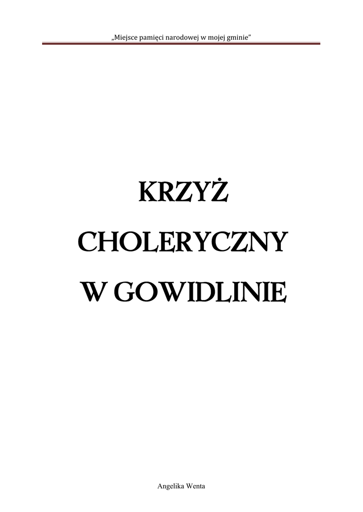 „Miejsce pamięci narodowej w mojej gminie” KRZYŻ CHOLERYCZNY W GOWIDLINIE Angelika Wenta „Miejsce pamięci narodowej w mojej gminie” „Ojczyzna to wielki zbiorowy Obowiązek" /Cyprian Kamil Norwid/ Jestem mieszkanką Gowidlina (kaszb. Gòwidlëno) – dużej kaszubskiej wsi położonej w województwie kartuskim, w pomorskim, gminie w Sierakowice, powiecie nad północnym brzegiem jeziora Gowidlińskiego. Miejscowość jest siedzibą sołectwa. krzyż Niedaleko za miejscowością znajduje się choleryczny, upamiętniający tragedię z początku XIX wieku. straszną Krzyż choleryczny, dawniej nazywany również karawaką, został wybudowany pod Kawlami, zaraz za Gowidlinem, ponieważ w obawie przed rozszerzeniem się choroby zorganizowano cmentarz poza wsią. Krzyż upamiętnia epidemię cholery, która miała miejsce w Gowidlinie 1831 r. Na początku był inny krzyż. Miał on dwie poprzeczne belki (górną – krótszą i nieco niżej – dłuższą). Gdy w naturalny sposób spróchniał, na początku XX wieku ustawiono krzyż, który stoi do dziś. Ma on podstawę betonową z metalowym mocowaniem. Jest wykonany z drewna dębowego. Cholera to ostra i zaraźliwa choroba zakaźna przewodu pokarmowego. Przyczyną może być spożycie pokarmu lub wody skażonej Gram – ujemną bakterią – szczepami przecinkowca cholery produkującego enterotoksynę. W książce pt. „Amtsblatt für den Regierungsbezirk” opublikowanej jesienią 1831 r. jest napisane, że w sierpniu tego roku w Gowidlinie zachorowało ponad 120 osób, z czego 84 osoby przeżyły, a 42 zmarły. Zarażeni byli izolowani i leczeni w tzw. „organistówce” w Sierakowicach. Byli to: Maciek Woźniak, Ewa Woźniak i jej siostra. Od 29 lipca w tym samym miejscu była odizolowana wdowa Koesler i sześciomiesięczne dziecko o imieniu Maciej. Niektórzy zostali wyleczeni, inni zmarli. Angelika Wenta „Miejsce pamięci narodowej w mojej gminie” W okresie od 24 lipca do 19 września 1831 r. na cholerę zmarły 44 osoby (38 katolików i 6 ewangelików). Dane dotyczące gowidlińskich ofiar epidemii cholery zostały odnotowane w księgach zgonów parafii sierakowickiej, które obecnie znajdują się w Archiwum Diecezji Pelplińskiej w Pelplinie. W Gowidlinie było 21 pogrzebów zmarłych na cholerę. Na początku kopano głęboki dół, w którym kładziono zmarłego, następnie sypano warstwę wapna w celu dezynfekcji, a na koniec warstwę ziemi. Ofiary epidemii cholery: 24 lipca 1831 r.: 1 ofiara – Chrystine Koesler, ewangeliczka, wiek 80 lat, (pogrzeb 1 sierpnia) 27 lipca 1831 r.: 2 ofiara – Maciej Ozniak (Woźniak), katolik, wiek 42 lata, (pogrzeb 30 lipca) 31 lipca 1831 r.: 3 ofiara – Jan, syn Michała Brzeskiego i Ewy z d. Flis, katolik, wiek 1 rok i 6 miesięcy 3 sierpnia 1831 r.: 4 ofiara – Albrecht Zblewski, katolik, wiek 18 lat 5 ofiara – Anna Wendt, katoliczka, wiek 59 lat 6 ofiara – Michał Brzeski, katolik, wiek 30 lat 7 ofiara – Jan Zielke, ewangelik, wiek 34 lat, (pogrzeb 4 sierpnia) 8 ofiara – Jan Gneba, katolik, wiek 43 lat, (pogrzeb 4 sierpnia) 9 ofiara – Johann Schmidke, ewangelik, wiek 48 lat, (pogrzeb 4 sierpnia) 5 sierpnia 1831 r.: 10 ofiara – Michał Zblewski, katolik, wiek 40 lat 6 sierpnia 1831 r.: 11 ofiara – Marianna Manck, katoliczka, wiek 40 lat 12 ofiara – Marianna, córka Michała Brzeskiego i Ewy z d. Flis, katoliczka, wiek 6 lat, (pogrzeb 7 sierpnia) 13 ofiara – Dorota Zielke z d. Koesler, ewangeliczka, wiek 34lat, (pogrzeb 7 sierpnia) 14 ofiara – Maciej Cichosz, katolik, wiek 34 lat, (pogrzeb 7 sierpnia) Angelika Wenta „Miejsce pamięci narodowej w mojej gminie” 7 sierpnia 1831 r.: 15 ofiara – Albrecht Labuda, katolik, wiek 35 lat 16 ofiara – Jan Labuda, katolik, wiek 40 lat, (pogrzeb 9 sierpnia) 8 sierpnia 1831 r.: 17 ofiara – Zuzanna Kreft, katoliczka, wiek 23 lat 18 ofiara – Józefina, córka Andrzeja Wolskiego i Anny z d. Szymanowskiej, katoliczka, wiek 8 lat 19 ofiara – Marianna Labuda z d. Zaborowska, katoliczka, wiek 48 lat 20 ofiara – Ewa, córka Marcina Bigusa i Jadwigi z d. Wendt, katoliczka, wiek 18 lat 9 sierpnia 1831 r.: 21 ofiara – Marianna, córka Marcina Bigusa i Jadwigi z d. Wendt, katoliczka, wiek 16 lat 22 ofiara – Anna, córka Franciszka Bielawy i Katarzyny z d. Maszk, katoliczka, wiek 14 dni 23 ofiara – Józef, syn Marianny Mielewczyk, katolik, wiek 6 lat 24 ofiara – Jan Zielke, ewangelik, wiek 50 lat, ( pogrzeb 10 sierpnia) 10 sierpnia 1831 r.: 25 ofiara – Marianna Stolz z d. Dawidowska, katoliczka, wiek 22 lat, (pogrzeb 11 sierpnia) 26 ofiara – Julianna, córka Franciszka Jereczka i Anny z d. Dawidowskiej, katoliczka, wiek 6 lat, (pogrzeb 11 sierpnia) 27 ofiara – August, syn Franciszka Jereczka i Anny z d. Dawidowskiej, katolik, wiek 7 lat i 6 miesięcy, (pogrzeb 11 sierpnia) 28 ofiara – Franciszek, syn Franciszka Jereczka i Anny z d. Dawidowskiej, katolik, wiek 1 rok i 6 miesięcy, (pogrzeb 11 sierpnia) 29 ofiara – Ewa, córka Andrzeja Woslkiego i Anny z d. Szymanowskiej, katoliczka, wiek 7 lat, (pogrzeb 11 sierpnia) 30 ofiara – Franciszek, syn (panieński) Jadwigi Kotłowskiej, katolik, wiek 7 lat, (pogrzeb 11 sierpnia) 31 ofiara – Jakub Płotka, syn Georga Lamke i Marianny z d. Dawidowskiej, katolik, wiek 22 lat, (pogrzeb 11 sierpnia) Angelika Wenta „Miejsce pamięci narodowej w mojej gminie” 12 sierpnia 1831 r.: 32 ofiara – Jakub, syn Marcina Bigusa i Jadwigi z d. Wendt, katolik, wiek 6 miesięcy, (pogrzeb 13 sierpnia) 18 sierpnia 1831 r.: 33 ofiara – Carl Schmidtke, ewangelik, wiek 30 lat 34 ofiara – Marianna Lamke z d. Dawidowska, katoliczka, wiek 52 lat 19 sierpnia 1831 r.: 35 ofiara – Marianna, córka Georga Lamke i Marianny z d. Dawidowskiej, katoliczka, wiek 10 lat 22 sierpnia 1831 r.: 36 ofiara – Franciszek, syn Macieja Malinowskiego z d. Dawidowskiej, katolik, wiek 13 lat, (pogrzeb 23 sierpnia) i Marianny 23 sierpnia 1831 r.: 37 ofiara – Adam, syn Michała Brzeskiego i M