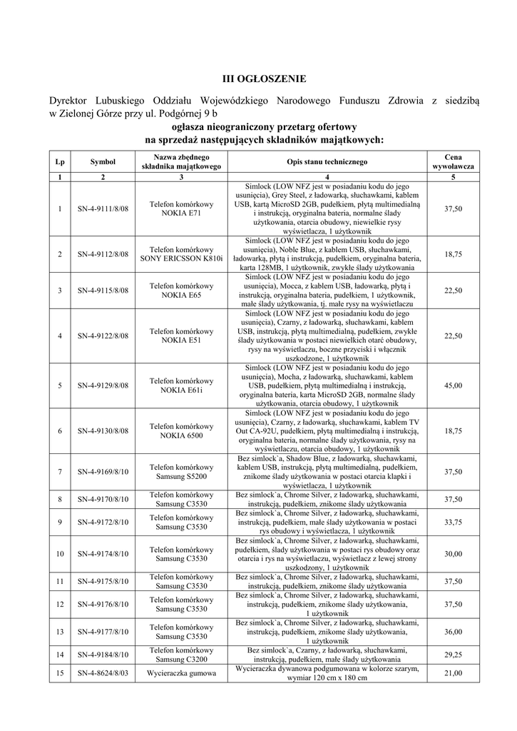 III OGŁOSZENIE Dyrektor Lubuskiego Oddziału Wojewódzkiego Narodowego Funduszu Zdrowia z siedzibą w Zielonej Górze przy ul. Podgórnej 9 b ogłasza nieograniczony przetarg ofertowy na sprzedaż następujących składników majątkowych: Nazwa zbędnego składnika majątkowego 3 Lp Symbol 1 2 1 SN-4-9111/8/08 Telefon komórkowy NOKIA E71 2 SN-4-9112/8/08 Telefon komórkowy SONY ERICSSON K810i 3 SN-4-9115/8/08 Telefon komórkowy NOKIA E65 4 SN-4-9122/8/08 Telefon komórkowy NOKIA E51 5 SN-4-9129/8/08 Telefon komórkowy NOKIA E61i 6 SN-4-9130/8/08 Telefon komórkowy NOKIA 6500 7 SN-4-9169/8/10 Telefon komórkowy Samsung S5200 8 SN-4-9170/8/10 Telefon komórkowy Samsung C3530 9 SN-4-9172/8/10 Telefon komórkowy Samsung C3530 10 SN-4-9174/8/10 Telefon komórkowy Samsung C3530 11 SN-4-9175/8/10 Telefon komórkowy Samsung C3530 12 SN-4-9176/8/10 Telefon komórkowy Samsung C3530 13 SN-4-9177/8/10 Telefon komórkowy Samsung C3530 14 SN-4-9184/8/10 Telefon komórkowy Samsung C3200 15 SN-4-8624/8/03 Wycieraczka gumowa Opis stanu technicznego 4 Simlock (LOW NFZ jest w posiadaniu kodu do jego usunięcia), Grey Steel, z ładowarką, słuchawkami, kablem USB, kartą MicroSD 2GB, pudełkiem, płytą multimedialną i instrukcją, oryginalna bateria, normalne ślady użytkowania, otarcia obudowy, niewielkie rysy wyświetlacza, 1 użytkownik Simlock (LOW NFZ jest w posiadaniu kodu do jego usunięcia), Noble Blue, z kablem USB, słuchawkami, ładowarką, płytą i instrukcją, pudełkiem, oryginalna bateria, karta 128MB, 1 użytkownik, zwykłe ślady użytkowania Simlock (LOW NFZ jest w posiadaniu kodu do jego usunięcia), Mocca, z kablem USB, ładowarką, płytą i instrukcją, oryginalna bateria, pudełkiem, 1 użytkownik, małe ślady użytkowania, tj. małe rysy na wyświetlaczu Simlock (LOW NFZ jest w posiadaniu kodu do jego usunięcia), Czarny, z ładowarką, słuchawkami, kablem USB, instrukcją, płytą multimedialną, pudełkiem, zwykłe ślady użytkowania w postaci niewielkich otarć obudowy, rysy na wyświetlaczu, boczne przyciski i włącznik uszkodzone, 1 użytkownik Simlock (LOW NFZ jest w posiadaniu kodu do jego usunięcia), Mocha, z ładowarką, słuchawkami, kablem USB, pudełkiem, płytą multimedialną i instrukcją, oryginalna bateria, karta MicroSD 2GB, normalne ślady użytkowania, otarcia obudowy, 1 użytkownik Simlock (LOW NFZ jest w posiadaniu kodu do jego usunięcia), Czarny, z ładowarką, słuchawkami, kablem TV Out CA-92U, pudełkiem, płytą multimedialną i instrukcją, oryginalna bateria, normalne ślady użytkowania, rysy na wyświetlaczu, otarcia obudowy, 1 użytkownik Bez simlock`a, Shadow Blue, z ładowarką, słuchawkami, kablem USB, instrukcją, płytą multimedialną, pudełkiem, znikome ślady użytkowania w postaci otarcia klapki i wyświetlacza, 1 użytkownik Bez simlock`a, Chrome Silver, z ładowarką, słuchawkami, instrukcją, pudełkiem, znikome ślady użytkowania Bez simlock`a, Chrome Silver, z ładowarką, słuchawkami, instrukcją, pudełkiem, małe ślady użytkowania w postaci rys obudowy i wyświetlacza, 1 użytkownik Bez simlock`a, Chrome Silver, z ładowarką, słuchawkami, pudełkiem, ślady użytkowania w postaci rys obudowy oraz otarcia i rys na wyświetlaczu, wyświetlacz z lewej strony uszkodzony, 1 użytkownik Bez simlock`a, Chrome Silver, z ładowarką, słuchawkami, instrukcją, pudełkiem, znikome ślady użytkowania Bez simlock`a, Chrome Silver, z ładowarką, słuchawkami, instrukcją, pudełkiem, znikome ślady użytkowania, 1 użytkownik Bez simlock`a, Chrome Silver, z ładowarką, słuchawkami, instrukcją, pudełkiem, znikome ślady użytkowania, 1 użytkownik Bez simlock`a, Czarny, z ładowarką, słuchawkami, instrukcją, pudełkiem, małe ślady użytkowania Wycieraczka dywanowa podgumowana w kolorze szarym, wymiar 120 cm x 180 cm Cena wywoławcza 5 37,50 18,75 22,50 22,50 45,00 18,75 37,50 37,50 33,75 30,00 37,50 37,50 36,00 29,25 21,00 16 SN-4-8625/8/03 Wycieraczka gumowa 17 E-4-3602/09 Słuchawka Bluetooth Nokia BH-800 18 E-4-3603/09 Słuchawka Bluetooth Nokia BH-800 Wycieraczka dywanowa podgumowana w kolorze brązowym, wymiar 120 cm x 240 cm W komplecie: ładowarka, instrukcja, etui do przechowywania i łańcuszek do noszenia na szyi; kolor: Coffee Black W komplecie: ładowarka, instrukcja, etui do przechowywania i łańcuszek do noszenia na szyi; kolor: Coffee Black 22,50 15,00 15,00 1. Postępowanie jest prowadzone z zastosowaniem przepisów w art. 66-721 ustawy z dnia 23 kwietnia 1964 r. Kodeks cywilny (Dz.U. z 1964 r. nr 16, poz. 93 z późn. zm.). 2. Sprzedawane składniki majątku można oglądać w Oddziale LOW NFZ w Zielonej Górze przy ul. Podgórnej 9B w dniach od 21.05.2015r. do 08.06.2015r. (oprócz soboty i niedzieli) w godzinach od 9.00 do 15.00. Wszelkich informacji udziela Pani Anna Massier tel. 068 32 87 660. 3. Oferta powinna zostać złożona zgodnie ze wzorem stanowiącym załącznik nr 1 do ogłoszenia. 4. W przypadku osób prawnych, spółek cywilnych, spółek osobowych lub osób fizycznych prowadzących działalność gospodarczą, oferta powinna być podpisana przez osoby upoważnione do składania oświadczeń woli w imieniu Oferenta, tj. wymienione w Krajowym Rejestrze Sądowym lub wypisie z ewidencji działalności gospodarczej lub osoby posiadające pisemne pełnomocnictwo w tym zakresie. W takiej sytuacji pełnomocnictwo musi zostać dołączone do oferty. W przypadku Oferentów wspólnie składających ofertę (konsorcja, spółki cywilne, itp.), do oferty powinno zostać dołączone pełnomocnictwo dla osoby uprawnionej do reprezentowania Oferenta. 5. Ofertę należy złożyć osobiście lub przesłać pocztą do Lubuskiego Oddziału Wojewódzkiego Narodowego Funduszu Zdrowia, ul Podgórna 9b, 65-057 Zielona Góra, punkt podawczy w pom. 02 (przyziemie) w terminie do 08.06.2015 roku do godz. 11.00 (liczy się data i godzina wpływu). 6. Ofertę należy złożyć w zamkniętej kopercie z oznaczeni