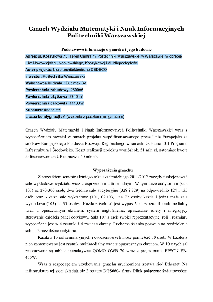Gmach Wydziału Matematyki i Nauk Informacyjnych Politechniki Warszawskiej Podstawowe informacje o gmachu i jego budowie Adres: ul. Koszykowa 75, Teren Centralny Politechniki Warszawskiej w Warszawie, w obrębie ulic: Nowowiejskiej, Noakowskiego, Koszykowej i Al. Niepodległości Autor projektu: biuro architektoniczne DEDECO Inwestor: Politechnika Warszawska Wykonawca budynku: Budimex SA Powierzchnia zabudowy: 2600m² Powierzchnia użytkowa: 9746 m² Powierzchnia całkowita: 11100m² Kubatura: 46223 m³ Liczba kondygnacji : 6 (włącznie z podziemnym garażem) Gmach Wydziału Matematyki i Nauk Informacyjnych Politechniki Warszawskiej wraz z wyposażeniem powstał w ramach projektu współfinansowanego przez Unię Europejską ze środków Europejskiego Funduszu Rozwoju Regionalnego w ramach Działania 13.1 Programu Infrastruktura i Środowisko. Koszt realizacji projektu wyniósł ok. 51 mln zł, natomiast kwota dofinansowania z UE to prawie 40 mln zł. Wyposażenia gmachu Z początkiem semestru letniego roku akademickiego 2011/2012 zaczęły funkcjonować sale wykładowe wydziału wraz z osprzętem multimedialnym. W tym duże audytorium (sala 107) na 270-300 osób, dwa średnie sale audytoryjne (328 i 329) na odpowiednio 124 i 135 osób oraz 3 duże sale wykładowe (101,102,103) na 72 osoby każda i jedna mała sala wykładowa (105) na 33 osoby. Każda z tych sal jest wyposażona w rzutnik multimedialny wraz z opuszczanym ekranem, system nagłośnienia, opuszczane rolety i integrujący sterowanie całością panel dotykowy. Sala 107 z racji swojej reprezentacyjnej roli i rozmiaru wyposażona jest w 4 rzutniki i 4 zwijane ekrany. Ruchoma ścianka pozwala na rozdzielenie sali na 2 niezależne audytoria. Każda z 15 sal seminaryjnych i ćwiczeniowych może pomieścić 30 osób. W każdej z nich zamontowany jest rzutnik multimedialny wraz z opuszczanym ekranem. W 10 z tych sal zmontowane są tablice interaktywne QOMO QWB 70 wraz z projektorami EPSON EB450W. Wraz z rozpoczęciem użytkowania gmachu uruchomiona została sieć Ethernet. Na infrastrukturę tej sieci składają się 2 routery DGS6604 firmy Dlink połączone światłowodem 10Gbit oraz 9 przełączników sieciowych Cisco Catalyst 2960. Za bezpieczeństwo sieci i podział wewnętrznej sieci odpowiada firewall Dlink DFL-1660. Wraz z uruchomieniem infrastruktury sieciowej możliwe stało się przeniesienie serwerów wydziałowych z do nowej serwerowni. W maju 2012 uruchomiono wydziałową sieć bezprzewodową opartą na 47 punktach dostępowych oraz kontrolerze Cisco WLC4404 oraz 2 specjalnych przełącznikach sieciowych Dlink DGS 3120 z zasilaniem serwowanym poprzez kabel Ethernet bezpośrednio do punktów dostępowych. Pod koniec semestru letniego roku akademickiego 2011/2012 oddane zostały do użytku pokoje pracownicze i administracyjne w których podłączonych zostało 126 nowych zestawów komputerowych oraz 47 zestawów przeniesionych ze starego gmachu. Nowe zestawy cechują się mocną konfiguracją sprzętową na którą składa się procesor Intel i7-2600, 8 GB RAM, grafika NVIDIA 560, 1TB dysku i 24 calowy monitor. W tym samym czasie co pokoje pracownicze uruchomione zostały drukarki dla pracowników i studentów: 3 x Canon IR3245 15 x Canon IR3225 1 x Canon ADV C202 W 10 salach laboratoriów komputerowych rozlokowano łącznie 182 nowe komputery do użytku dla studentów i prowadzących zajęcia. Nowe zestawy cechują się mocną konfiguracją sprzętową na którą składa się procesor Intel i7-2600, 8/16 GB RAM, grafika NVIDIA 580/Quadro2000/Quadro4000, 1TB dysku i 24 calowy monitor. Jedna z tych sal (304) została dodatkowo wyposażona w zestawy do grafiki 3D, manipulatory i sensory ruchu oraz kamery HD. Jedna duża (25 osób) sala (218) przeznaczona jest całkowicie do pracy indywidualnej studentów. Dodatkowo każda z tych sal wyposażona jest w rzutnik multimedialny wraz ze zwijanym ekranem. Dwie z tych sal (219 i 201) posiadają tablice interaktywne QOMO QWB 70 wraz z projektorami EPSON EB-450W. Z początkiem semestru zimowego roku akademickiego 2012/2013 uruchomione zostały serwery zakupione na potrzeby działania wydziału oraz na potrzeby projektowe wydziału. Serwery te to bardzo mocne sprzętowe konfiguracje: Do zaspokojenia potrzeb dydaktycznych i administracyjnych uruchomiono 14 serwerów IBM x3550 M3 z jednym procesorem Intel Xeon X5650, 4 dyskami SAS 300Gb i 60 Gb pamięci RAM Do zaspokojenia potrzeb projektowych uruchomiono 6 serwerów IBM x3650 M3 z dwoma procesorami Intel Xeon X5650, 8 dyskami SATA 500Gb i 96 Gb pamięci RAM oraz 3 serwery do obliczeń GPU każdy wyposażony w 3 karty NVIDIA Tesla M2070/6Gb Ponadto w gmachu, do dyspozycji studentów, są klub studencki, pokój samorządu studenckiego, pomieszczenia kół naukowych, dwie czytelnie. Budynek jest całkowicie dostosowany do potrzeb osób niepełnosprawnych. Kalendarium najważniejszych wydarzeń, które miały miejsce w gmachu lub go dotyczyły 1 stycznia 2007 – rozpoczęcie projektu „Wydział Matematyki i Nauk Informacyjnych” 1 września 2009 - podpisanie przez Rektora Politechniki Warszawskiej, prof. dr hab. inż. Włodzimierza Kurnika, umowy o dofinansowanie projektu pt. „Wydział Matematyki i Nauk Informacyjnych Politechniki Warszawskiej”. 17 maja 2010 – zawarcie przez Politechnikę Warszawską umowy z firmą Budimex SA o budowę budynku Wydziału Matematyki i Nauk Informacyjnych 20 grudnia 2011 – przekazanie gmachu do użytku przez wykonawcę 20 lutego 2012 – pierwszy wykład w gmachu - od tego dnia w salach wykładowych w nowym gmachu odbywają się zajęcia 23 kwietnia 2012 – uroczystość otwarcia gmachu - oddanie do użytku w pełni wyposażonych pokoi pracowniczych oraz administracyjnych 1 października 2012 – pierwsza inauguracja roku akademickiego na Wydziale MiNI w nowym gmachu - oddanie do użytki w pełni wyposażonych sal ćwiczeniowych, seminaryjnych oraz laboratoriów komputerowych, od początku semest