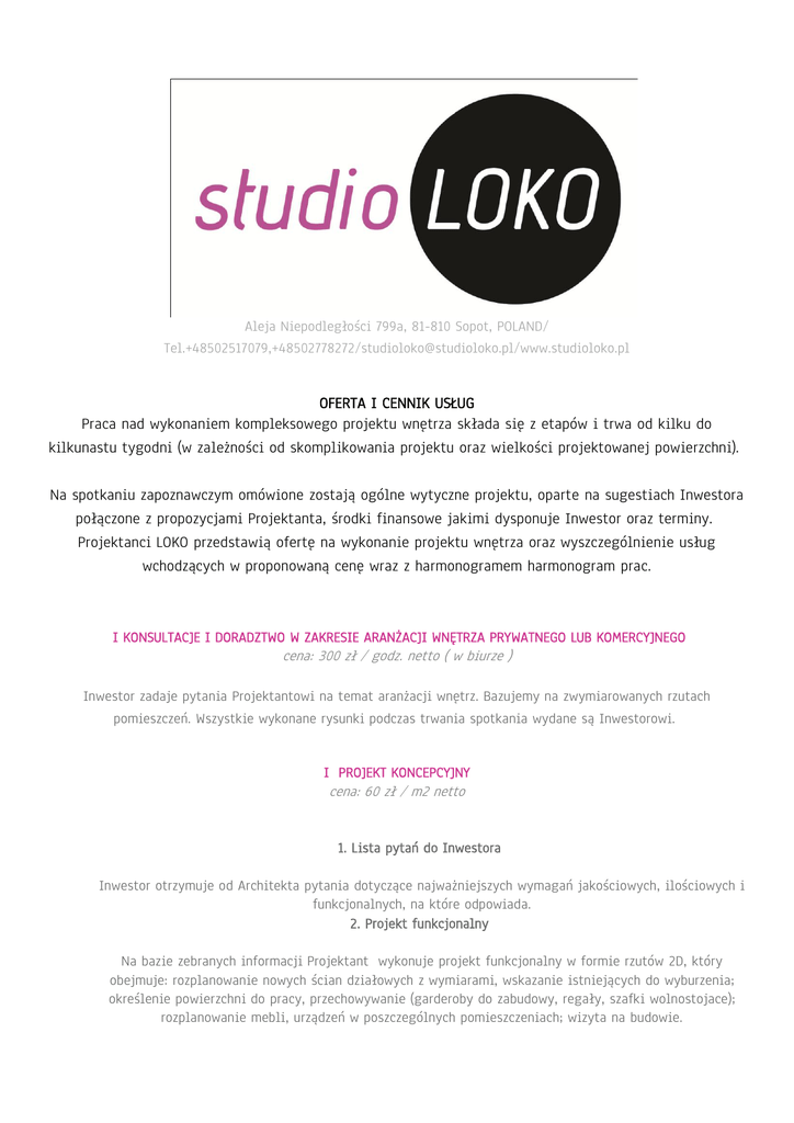 Aleja Niepodległości 799a, 81-810 Sopot, POLAND/ Tel.+48502517079,+48502778272/[email protected]/www.studioloko.pl OFERTA I CENNIK USŁUG Praca nad wykonaniem kompleksowego projektu wnętrza składa się z etapów i trwa od kilku do kilkunastu tygodni (w zależności od skomplikowania projektu oraz wielkości projektowanej powierzchni). Na spotkaniu zapoznawczym omówione zostają ogólne wytyczne projektu, oparte na sugestiach Inwestora połączone z propozycjami Projektanta, środki finansowe jakimi dysponuje Inwestor oraz terminy. Projektanci LOKO przedstawią ofertę na wykonanie projektu wnętrza oraz wyszczególnienie usług wchodzących w proponowaną cenę wraz z harmonogramem harmonogram prac. I KONSULTACJE I DORADZTWO W ZAKRESIE ARANŻACJI WNĘTRZA PRYWATNEGO LUB KOMERCYJNEGO cena: 300 zł / godz. netto ( w biurze ) Inwestor zadaje pytania Projektantowi na temat aranżacji wnętrz. Bazujemy na zwymiarowanych rzutach pomieszczeń. Wszystkie wykonane rysunki podczas trwania spotkania wydane są Inwestorowi. I PROJEKT KONCEPCYJNY cena: 60 zł / m2 netto 1. Lista pytań do Inwestora Inwestor otrzymuje od Architekta pytania dotyczące najważniejszych wymagań jakościowych, ilościowych i funkcjonalnych, na które odpowiada. 2. Projekt funkcjonalny Na bazie zebranych informacji Projektant wykonuje projekt funkcjonalny w formie rzutów 2D, który obejmuje: rozplanowanie nowych ścian działowych z wymiarami, wskazanie istniejących do wyburzenia; określenie powierzchni do pracy, przechowywanie (garderoby do zabudowy, regały, szafki wolnostojace); rozplanowanie mebli, urządzeń w poszczególnych pomieszczeniach; wizyta na budowie. 3. Koncepcja stylu wnętrza/ MoodBoards Etap obejmuje przygotowanie jednej koncepcji na aranżację wnętrz w formie planszy Moodboard bazując na zdjęciach inspiracyjnych, które będą podstawą do opracowania Projektu, w tym: Elementy stałe: Wybór podłóg- konkretne materiały wykończeniowe, wymagania jakościowe i wizualne, materiały wykończeniowe okien, drzwi, schodów, szklanych ścianek, wnęk ściennych, dobór mebli stałych (zabudowa) i ruchomych Materiały wykończeniowe mebli, tapicerki na sofy, pufy, łóżka, Sprzęt AGD - wybór konkretnych modeli, Łazienki -wybór ceramiki i armatury, dekoracje i akcesoria, Kuchnia -wybór wykończenia frontów, blatów, uchwytów, Jadalnia, Salon, Korytarze, Sypialnie, Pokoje dziecięce -rozwiązania na meble tv, rozwiązania kolorystyczne i materiałowe, oświetlenie Powyższe materiały klient otrzymuje w formie Plansz Moodboards, wg ponizszych przykładów, oraz w wordzie II Projekt wykonawczy cena: 120 zł / m2 netto Zawiera rysunki, na których ekipa remontowa powinna wzorować się podczas wykonywania prac związanych z wykończeniem wnętrza. Klienci otrzymują również wizualizacje trójwymiarowe pomieszczeń oraz projekty mebli pod zabudowę. Ten typ usługi dzielimy na etapy: projekt koncepcyjny ( lista pytań do inwestora, projekt funkcjonalny, moodboards) rozrysowanie elementów stolarki wraz z doborem materiałów wizualizacje 3D pomieszczeń Projekt podłóg z cokołami we wszystkich pomieszczeniach- rzuty płaskie podłóg (gresy, kamień, deska podłogowa itp.) wraz z konkretnymi rozwiązaniami materiałowymi i kolorystycznymi, układ, rozmieszczenie, Projekt sufitów - rzuty sufitów podwieszanych, otworów dekoracyjnych, detali, sztukaterii, ramp, karniszy, Projekt aranżacji meblowej - układ mebli w pomieszczeniach, określenie wielkości, gabarytów, Projekty mebli do zabudowy (kuchnia, garderoba, meble łazienkowe, szafy) lub wolnostojących na zamówienie (stoliki kawowe, szafki telewizyjne), Dobór opraw świetlnych sufitowych, ściennych, LED, miejscowych, wolnostojących, Wybór drzwi wewnętrznych oraz szklanych ścianek działowych i prysznicowych, Lista elementów wyposażenia zawartych w Projekcie: armatura, ceramika, zlewozmywak kuchenny, baterie łazienkowe, sprzęt AGD, oświetlenie, dekoracje, farby, podłogi, sztukaterie. wykonanie rysunków dla ekipy niezbędnych do przeprowadzenia remontu sporządzenie szacunkowego kosztorysu W pakiecie jest 10 godzin spotkań w biurze lub na zakupach – do wyboru przez klienta. OPCJONALNIE: wykonanie projektu mebla przez wykwalifikowanego konstruktora, wraz z opisem i specyfikacją techniczną - wycena indywidualna. Opcjonalnie wizualizacje fotorealistyczne ( wycena indywidualna ) Do tej wersji dołączamy również projekty mebli pod zabudowę. Czas realizacji ok. 8 tygodni. III Projekt wykonawczy z nadzorem ekipy budowlanej mieszkanie pod klucz 180 zł netto / m2 Projekt z nadzorem to najczęściej wybierana opcja, gdyż : Uwalnia Państwa od problemów związanych z remontem. Studioloko przejmujemy na siebie koordynowanie ekipy budowlanej i nadzoruje ich prace. Współpracujemy z naszymi wykonawcami od lat. Do naszych obowiązków należy dopilnowanie, aby prace zrealizowane były precyzyjnie i na czas. Państwo mogą przyjechać do gotowego mieszkania, nie muszą codziennie wpuszczać ekipy i pilnować o której wyjdą z budowy. Często ten typ usługi jest zwany 'mieszkaniem pod klucz' Co zyskują Państwo decydując się na taki typ usługi: - Oszczędność czasu jaki niewątpliwie trzeba poświęcić na znalezienie i nadzorowanie ekipy. - Oszczędność czasu i pieniędzy – nie muszą Państwo robić zakupów, wszystko scalamy i organizujemy we własnym zakresie. Realizacje wykonawców, z którymi współpracujemy dostępne są na naszej stronie internetowej www.studioloko.pl. Dodatkowo jeśli zdecydują się Państwo na realizację projektów mebli w naszej stolarni i tapicerni gwarantujemy nie tylko konkurencyjne ceny, ale również pełen nadzór nad pracami naszego podwykonawcy. Jego realizacje widoczne są na www.studioloko.pl. Czas realizacji w tym przypadku uzależniony jest od postępu prac budowlanych. SERDECZNIE ZAPRASZAMY DO WSPÓŁPRACY Beata Kwiatkowska Joanna Real-Studzińska www.studioloko.pl