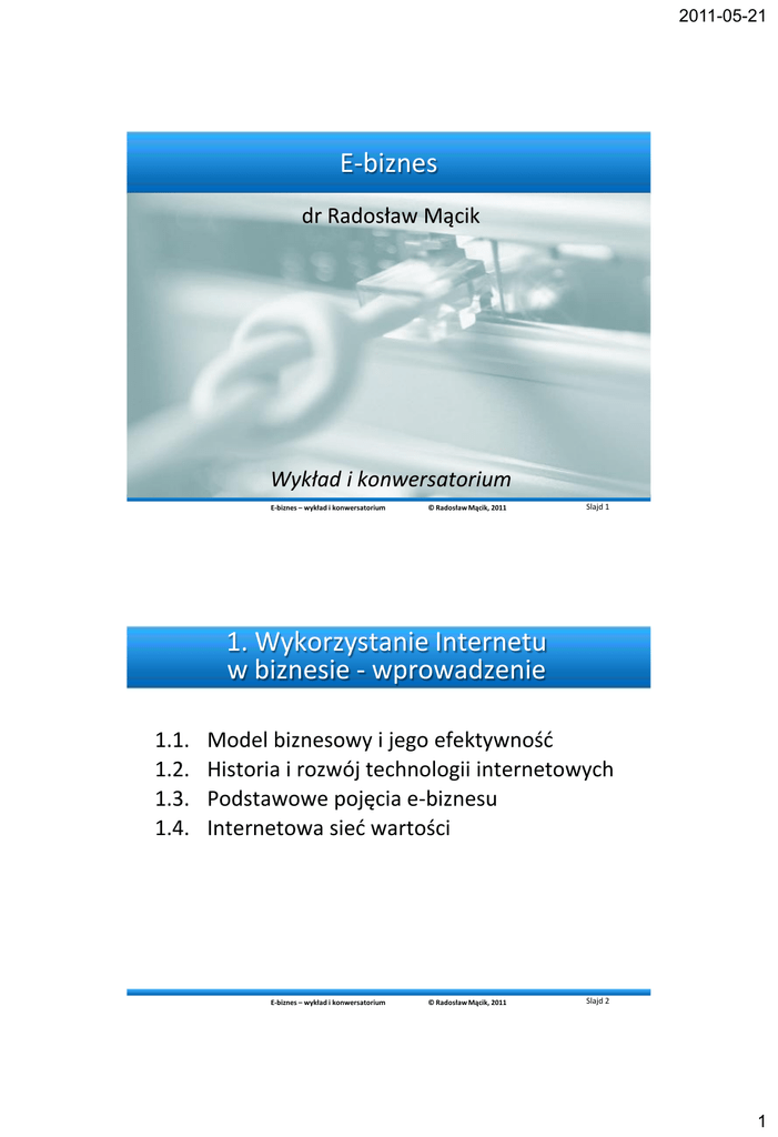 2011-05-21 E-biznes dr Radosław Mącik Wykład i konwersatorium E-biznes – wykład i konwersatorium © Radosław Mącik, 2011 Slajd 1 1. Wykorzystanie Internetu w biznesie - wprowadzenie 1.1. 1.2. 1.3. 1.4. Model biznesowy i jego efektywnośd Historia i rozwój technologii internetowych Podstawowe pojęcia e-biznesu Internetowa sied wartości E-biznes – wykład i konwersatorium © Radosław Mącik, 2011 Slajd 2 1 2011-05-21 1.1. Model biznesowy i jego efektywnośd E-biznes – wykład i konwersatorium © Radosław Mącik, 2011 Slajd 3 Model biznesowy (1) Model biznesowy to przyjęta przez firmę metoda powiększania i wykorzystywania zasobów w celu zaoferowania klientom oferty o wartości przewyższającej wartośd ofert konkurentów, która jednocześnie zapewnia dochodowośd oraz uzyskanie i utrzymanie trwałej przewagi konkurencyjnej. W skrócie można traktowad model biznesowy jako sposób tzw. przechwytywania wartości przez firmę. E-biznes – wykład i konwersatorium © Radosław Mącik, 2011 Slajd 4 2 2011-05-21 Model biznesowy (2) Dobry model biznesowy jest modelem, który: – Oferuje klientom unikalną wartośd, – Jest trudny do skopiowania, – Jest łatwy do redefiniowania. Które z tych cech są łatwe, a które – trudne – do uzyskania w e-biznesie? Dlaczego? E-biznes – wykład i konwersatorium © Radosław Mącik, 2011 Slajd 5 Konkurencja Firmy rozpoczynające działalnośd (wejścia do sektora) Na konkurencję najlepiej patrzed przez pryzmat tzw. „5 sił” M. E. Portera Siła przetargowa dostawców Konkurenci Siła przetargowa odbiorców Produkty substytucyjne E-biznes – wykład i konwersatorium © Radosław Mącik, 2011 Slajd 6 3 2011-05-21 Przewaga konkurencyjna Przedsiębiorstwo osiąga przewagę konkurencyjną, kiedy – przy uwzględnieniu własnych zasobów – zaspokaja potrzeby konsumentów w sposób bardziej efektywny, niż robi to konkurencja E-biznes – wykład i konwersatorium © Radosław Mącik, 2011 Slajd 7 Przewaga konkurencyjna i jej uwarunkowania Zasoby marketingowe Wiedza Zasoby produkcyjne Pracownicy Zasoby Zasoby finansowe rzeczowe E-biznes – wykład i konwersatorium © Radosław Mącik, 2011 Slajd 8 4 2011-05-21 Model biznesowy jako determinanta efektywności firmy Model biznesowy • Elementy i relacje między nimi • Zmiennośd w czasie (dynamika) Czynnik zmiany • Charakterystyka • Przyczyny Wyniki Otoczenie • Otoczenie konkurencyjne • Otoczenie makroekonomiczne Źródło: A. Afuah, C. L. Tucci, Biznes internetowy - strategie i modele, Oficyna Ekonomiczna, Kraków 2003, s. 20 E-biznes – wykład i konwersatorium © Radosław Mącik, 2011 Slajd 9 Skutecznośd a efektywnośd działao biznesowych Wyznaczone cele, efekty działao Skutecznośd działao Dostępne zasoby Działania Efektywnośd działao E-biznes – wykład i konwersatorium Stopieo, w jakim podjęte działania pozwalają zrealizowad wyznaczone cele Pożądane wyniki Stopieo, w jakim dostępne zasoby są przekształcane poprzez podjęte działania na pożądane wyniki © Radosław Mącik, 2011 Slajd 10 5 2011-05-21 Przykład: Funkcja reakcji sprzedaży na budżet marketingowy „Górny” próg wrażliwości Sprzedaż „Dolny” próg wrażliwości Akceptowalny budżet marketingowy Budżet marketingowy E-biznes – wykład i konwersatorium Slajd 11 © Radosław Mącik, 2011 Elementy modelu i relacje między nimi Wartośd oferowana klientom Jakośd wdrożenia modelu biznesowego Rynek docelowy i jego segmenty Zakres oferty dla poszczególnych segmentów rynku Utrzymania przewagi konkurencyjnej Możliwości organizacyjne Źródła przychodów Działania udostępniające oferowaną wartośd E-biznes – wykład i konwersatorium Ceny oferowanej wartości © Radosław Mącik, 2011 Slajd 12 6 2011-05-21 1.2. Historia i rozwój technologii internetowych 00:42:45: *…+ Chcę wiedzied wszystko, co się do tej pory wydarzyło. 00:42:48: Najpierw przyszło oziębienie, potem pojawiły się dinozaury. 00:42:51: Ale za bardzo utyły, więc wyginęły i zamieniły się w ropę. 00:42:55: Potem przyszli Arabowie i kupili mercedesy *…+ Airplane 2 E-biznes – wykład i konwersatorium © Radosław Mącik, 2011 Slajd 13 „Prehistoria Internetu” E-biznes – wykład i konwersatorium © Radosław Mącik, 2011 Slajd 14 7 2011-05-21 Maszyna analityczna Ch. Babbage’a Z tekstu A. Lovelace opublikowanego w „Taylors Scientific Memoirs” w 1843: „Można powiedzied, ze maszyna analityczna tkad będzie wzory algebraiczne, tak jak krosna Jacquarda tkają liście i kwiaty” „...maszyna analityczna nie rości sobie pretensji do tworzenia czegoś sama z siebie. Może wykonywad wszystko, co będziemy umieli jej polecid. Może dokonywad analiz, nie jest wszelako zdolna dochodzid do związków analitycznych czy prawd. Zadaniem jej jest pomagad nam wykonywad to, co już opanowaliśmy.” E-biznes – wykład i konwersatorium © Radosław Mącik, 2011 Slajd 15 Pierwsze komputery Z3, K. Zuse (1941, Niemcy, binarny, zniszczony w 1944) Colossus – u góry (1944, UK, zbudowano 10) ENIAC – na dole (1945, US, dziesiętny, raczej kalkulator) E-biznes – wykład i konwersatorium © Radosław Mącik, 2011 Slajd 16 8 2011-05-21 „Historia Internetu” E-biznes – wykład i konwersatorium © Radosław Mącik, 2011 Slajd 17 Pierwotna konfiguracja ARPANET’u (4 węzły, 1969) E-biznes – wykład i konwersatorium © Radosław Mącik, 2011 Slajd 18 9 2011-05-21 E-biznes – wykład i konwersatorium © Radosław Mącik, 2011 Slajd 19 E-biznes – wykład i konwersatorium © Radosław Mącik, 2011 Slajd 20 10 2011-05-21 Hosty* Internetu (w latach 1969-2009) *Host internetowy – komputer posiadający zarejestrowany numer IP E-biznes – wykład i konwersatorium © Radosław Mącik, 2011 Slajd 21 Wzrost WWW (w latach 1990-2009) E-biznes – wykład i konwersatorium © Radosław Mącik, 2011 Slajd 22 11 2011-05-21 Przykładowa droga pakietów w Internecie Wykorzystujemy narzędzie systemow