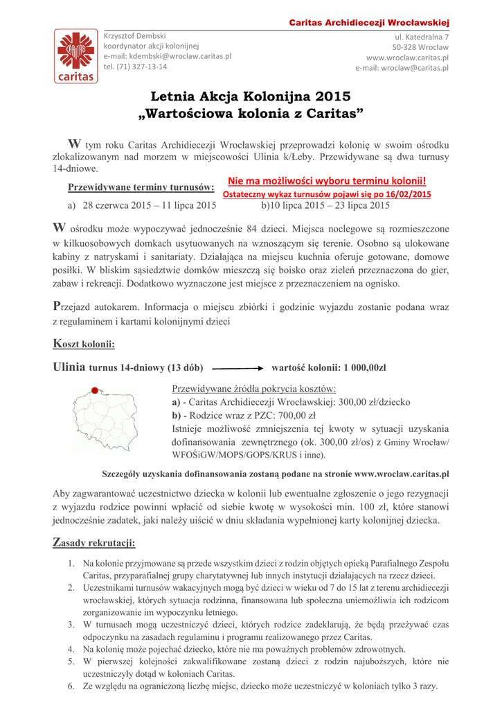 Caritas Archidiecezji Wrocławskiej Krzysztof Dembski koordynator akcji kolonijnej e-mail: [email protected] tel. (71) 327-13-14 ul. Katedralna 7 50-328 Wrocław www.wroclaw.caritas.pl e-mail: [email protected] Letnia Akcja Kolonijna 2015 „Wartościowa kolonia z Caritas” W tym roku Caritas Archidiecezji Wrocławskiej przeprowadzi kolonię w swoim ośrodku zlokalizowanym nad morzem w miejscowości Ulinia k/Łeby. Przewidywane są dwa turnusy 14-dniowe. Przewidywane terminy turnusów: a) 28 czerwca 2015 – 11 lipca 2015 Nie ma możliwości wyboru terminu kolonii! Ostateczny wykaz turnusów pojawi się po 16/02/2015 b)10 lipca 2015 – 23 lipca 2015 W ośrodku może wypoczywać jednocześnie 84 dzieci. Miejsca noclegowe są rozmieszczone w kilkuosobowych domkach usytuowanych na wznoszącym się terenie. Osobno są ulokowane kabiny z natryskami i sanitariaty. Działająca na miejscu kuchnia oferuje gotowane, domowe posiłki. W bliskim sąsiedztwie domków mieszczą się boisko oraz zieleń przeznaczona do gier, zabaw i rekreacji. Dodatkowo wyznaczone jest miejsce z przeznaczeniem na ognisko. Przejazd autokarem. Informacja o miejscu zbiórki i godzinie wyjazdu zostanie podana wraz z regulaminem i kartami kolonijnymi dzieci Koszt kolonii: Ulinia turnus 14-dniowy (13 dób) wartość kolonii: 1 000,00zł Przewidywane źródła pokrycia kosztów: a) - Caritas Archidiecezji Wrocławskiej: 300,00 zł/dziecko b) - Rodzice wraz z PZC: 700,00 zł Istnieje możliwość zmniejszenia tej kwoty w sytuacji uzyskania dofinansowania zewnętrznego (ok. 300,00 zł/os) z Gminy Wrocław/ WFOŚiGW/MOPS/GOPS/KRUS i inne). Szczegóły uzyskania dofinansowania zostaną podane na stronie www.wroclaw.caritas.pl Aby zagwarantować uczestnictwo dziecka w kolonii lub ewentualne zgłoszenie o jego rezygnacji z wyjazdu rodzice powinni wpłacić od siebie kwotę w wysokości min. 100 zł, które stanowi jednocześnie zadatek, jaki należy uiścić w dniu składania wypełnionej karty kolonijnej dziecka. Zasady rekrutacji: 1. Na kolonie przyjmowane są przede wszystkim dzieci z rodzin objętych opieką Parafialnego Zespołu Caritas, przyparafialnej grupy charytatywnej lub innych instytucji działających na rzecz dzieci. 2. Uczestnikami turnusów wakacyjnych mogą być dzieci w wieku od 7 do 15 lat z terenu archidiecezji wrocławskiej, których sytuacja rodzinna, finansowana lub społeczna uniemożliwia ich rodzicom zorganizowanie im wypoczynku letniego. 3. W turnusach mogą uczestniczyć dzieci, których rodzice zadeklarują, że będą przeżywać czas odpoczynku na zasadach regulaminu i programu realizowanego przez Caritas. 4. Na kolonię może pojechać dziecko, które nie ma poważnych problemów zdrowotnych. 5. W pierwszej kolejności zakwalifikowane zostaną dzieci z rodzin najuboższych, które nie uczestniczyły dotąd w koloniach Caritas. 6. Ze względu na ograniczoną liczbę miejsc, dziecko może uczestniczyć w koloniach tylko 3 razy. HARMONOGRAM Lp. Etapy organizacji kolonii: 1. Rozesłanie listów do parafii/PZC o terminach kolonii; 2. Oficjalne ogłoszenie terminów kolonii na stronie internetowej; Terminy: 13 -15 luty 2015 r. 16 luty 2015 r. Udostępnienie na stornie internetowej wzorów wniosków; 4. 5. 6. 7. Składanie poprawnie wypełnionych wniosków (złożenie osobiście przez rodzica/członka PZC lub wysłanie pocztą) 16 luty – 20 marca 2015 r. Ogłoszenie listy dzieci zakwalifikowanych na kolonię z odgórnym przydziałem na turnusy; 23 marca 2015 r. Wydawanie dokumentów uczestnika kolonii, które należy wypełnić i złożyć w określonym terminie (karta kolonijna, regulamin kolonii, informator kolonijny); 24 marca – 30 kwietnia 2015 r. Przyjmowanie dokładnie wypełnionych dokumentów wraz z wpłatą rodzica w wysokości 100,00 zł (zadatek); 7 kwietnia – 15 maja 2015 r. Wpłacanie należności za kolonię (Rodzice, Parafia/PZC, MOPS, GOPS, KRUS); 18 maj – 15 czerwca 2015 r.* *termin wpłat może ulec zmianie w zależności od terminów uzyskania ostatecznych informacji o przyznanej kwocie dofinansowania zewnętrznego. Informacje takie będą przekazywane na bieżąco w procesie rekrutacji Procedury: ZGODNIE Z HARMONOGRAMEM 3. 1. Wypełnienie wniosku o przyjęcie dziecka na kolonię i dostarczenie do Caritas (ul. Katedralna 7, 50-328 Wrocław). Wniosek w załączniku. Bardzo prosimy o rzetelne wypełnienie wniosku. W opisie sytuacji rodzinnej nie jest wystarczający wpis: „trudna sytuacja materialna”! 2. Rozpatrzenie wniosku, ogłoszenie listy dzieci przyjętych na kolonię. 3. Odbiór kart kwalifikacyjnych dziecka: w siedzibie Caritas przy ul. Katedralnej 7, Wrocław. 4. Zwrot wypełnionych kart kolonijnych wraz z opłatą minimalną (zadatek) W przypadku braku wniesienia opłaty bez podania zrozumiałego powodu ze strony zgłaszającego dziecko, Caritas Archidiecezji Wrocławskiej zastrzega sobie prawo do przekazania miejsca zostaną innym osobom oczekującym na liście rezerwowej. 5. Wpłata pozostałej kwoty (po uwzględnieniu zadatku i wartości dofinansowania zewnętrznego) Jeśli zaistnieje sytuacja, w której po wpłacie zaliczki dziecko z przyczyn uzasadnionych (potwierdzonych zaświadczeniem lekarskim lub na skutek wypadku) nie będzie mogło wziąć udziału w wyjeździe należy zgłosić to niezwłocznie do siedziby Caritas. W przypadku braku zgłoszenia, wpłacony zadatek nie ulega zwrotowi! Sposób dokonywania wpłaty zostanie podany wraz z kartami kwalifikacyjnymi dzieci i na stronie www.wroclaw.caritas.pl.