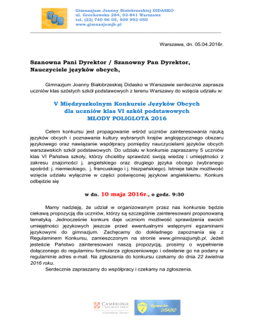 Gimnazjum Joanny Białobrzeskiej DIDASKO ul. Grochowska 284, 03-841 Warszawa tel. (22) 740 96 05, 509 993 050 www.gimnazjumjb.pl ________________________________________________________________ Warszawa, dn. 05.04.2016r. Szanowna Pani Dyrektor / Szanowny Pan Dyrektor, Nauczyciele języków obcych, Gimnazjum Joanny Białobrzeskiej Didasko w Warszawie serdecznie zaprasza uczniów klas szóstych szkół podstawowych z terenu Warszawy do wzięcia udziału w: V Międzyszkolnym Konkursie Języków Obcych dla uczniów klas VI szkół podstawowych MŁODY POLIGLOTA 2016 Celem konkursu jest propagowanie wśród uczniów zainteresowania nauką języków obcych i poznawania kultury wybranych krajów anglojęzycznego obszaru językowego oraz nawiązanie współpracy pomiędzy nauczycielami języków obcych warszawskich szkół podstawowych. Do udziału w konkursie zapraszamy 5 uczniów klas VI Państwa szkoły, którzy chcieliby sprawdzić swoją wiedzę i umiejętności z zakresu znajomości j. angielskiego oraz drugiego języka obcego (wybranego spośród: j. niemieckiego, j. francuskiego i j. hiszpańskiego). Istnieje także możliwość wzięcia udziału wyłącznie w części poświęconej językowi angielskiemu. Konkurs odbędzie się w dn. 10 maja 2016r., o godz. 9:30 Mamy nadzieję, że udział w organizowanym przez nas konkursie będzie ciekawą propozycją dla uczniów, którzy są szczególnie zainteresowani proponowaną tematyką. Jednocześnie konkurs daje uczniom możliwość sprawdzenia swoich umiejętności językowych jeszcze przed ewentualnymi wstępnymi egzaminami językowymi do gimnazjum. Zachęcamy do dokładnego zapoznania się z Regulaminem Konkursu, zamieszczonym na stronie www.gimnazjumjb.pl. Jeżeli jesteście Państwo zainteresowani naszą propozycją, prosimy o wypełnienie dołączonego do regulaminu formularza zgłoszeniowego i odesłanie go na podany w regulaminie adres e-mail. Na zgłoszenia do konkursu czekamy do dnia 22 kwietnia 2016 roku. Serdecznie zapraszamy do współpracy i czekamy na zgłoszenia. Gimnazjum Joanny Białobrzeskiej DIDASKO ul. Grochowska 284, 03-841 Warszawa tel. (22) 740 96 05, 509 993 050 www.gimnazjumjb.pl ________________________________________________________________ Regulamin V Międzyszkolnego Konkursu Języków Obcych dla uczniów klas VI szkół podstawowych MŁODY POLIGLOTA 2016 I. Organizatorzy Organizatorem konkursu jest Gimnazjum Joanny Białobrzeskiej Didasko, ul. Grochowska 284, 03-841 Warszawa. Instytucje wspierające: - Wydawnictwo Didasko, - Wydawnictwo Cambridge University Press. II. Cele Konkurs ma na celu: podnoszenie poziomu umiejętności językowych oswojenie uczniów z formą konkursów i sprawdzianów wiadomości sprawdzanie wiadomości uczniów klas szóstych przygotowanie uczniów do dalszego kształcenia językowego rozbudzanie wśród uczniów szkół podstawowych zainteresowania językami obcymi wzbogacanie i doskonalenie form pracy z uczniem zdolnym III. Adresaci Konkurs jest adresowany do uczniów klas szóstych publicznych i niepublicznych szkół podstawowych z terenu Warszawy. W konkursie mogą wziąć udział uczniowie klas szóstych. Szkoła jest zobowiązana przekazać uczniom i ich rodzicom informację o organizacji Konkursu, a także ściśle stosować przepisy jego regulaminu. W konkursie nie mogą wziąć udziału uczniowie dwujęzyczni, dla których jeden z języków konkursu (angielski, niemiecki, hiszpański, francuski) jest językiem „natywnym”. Gimnazjum Joanny Białobrzeskiej DIDASKO ul. Grochowska 284, 03-841 Warszawa tel. (22) 740 96 05, 509 993 050 www.gimnazjumjb.pl ________________________________________________________________ IV. Zakres materiału Zakres programowy Konkursu jest zgodny z podstawą programową kształcenia ogólnego określoną w rozporządzeniu Ministra Edukacji Narodowej i Sportu z dnia 26 lutego 2002 r. w sprawie podstawy programowej wychowania przedszkolnego oraz kształcenia ogólnego w poszczególnych typach szkół (Dz.U. Nr51, poz. 458, z poźn. zm.) oraz z podstawą programową kształcenia ogólnego określoną w rozporządzeniu Ministra Edukacji Narodowej z dnia 23 grudnia 2008 r. w sprawie podstawy programowej wychowania przedszkolnego oraz kształcenia ogólnego w poszczególnych typach szkół (Dz. U. z 2009 r. Nr 4, poz. 17). Konkurs składa się z dwóch części: pierwszej – poświęconej językowi angielskiemu (na poziomie A2/B1 zgodnie z klasyfikacją Rady Europy) oraz drugiej – poświęconej drugiemu językowi obcemu (do wyboru: j. niemiecki, j. hiszpański, j. francuski). Poziom konkursu z drugiego języka obcego to poziom A1/A2. V. Struktura i przebieg Konkursu Konkurs składa się z dwóch części: konkursu języka angielskiego oraz konkursu z drugiego języka obcego (wybranego i wcześniej zadeklarowanego przez Uczestników). Dopuszcza się wzięcie udziału jedynie w części z j. angielskiego, która jest obowiązkowa dla wszystkich Uczestników. Obie części konkursu odbywają się w tym samym terminie i oddzielone są 15-minutową przerwą. Uczestnicy konkursu rozwiązują testy pisemne jednokrotnego wyboru zawierające: zadania na czytanie ze zrozumieniem, słuchanie ze zrozumieniem oraz test gramatyczno-leksykalny. Testy składają się z zadań zamkniętych lub półotwartych. Na starcie każdej części konkursu uczestnik dostaje 25 punktów. Za każdą poprawną odpowiedź uczeń otrzymuje dodatkowo 1 punkt, za brak odpowiedzi 0 punktów, za błędną odpowiedź odejmowane jest 0,5 punktu. Część I - konkurs języka angielskiego Za prawidłowe rozwiązanie testu uczeń może uzyskać maksymalnie 75 punktów. Czas trwania testu: 45 minut. Gimnazjum Joanny Białobrzeskiej DIDASKO ul. Grochowska 284, 03-841 Warszawa tel. (22) 740 96 05, 509 993 050 www.gimnazjumjb.pl ________________________________________________________________ Część II – konkurs drugiego języka obcego Za prawidłowe rozwiązanie testu uczeń może uzyskać 