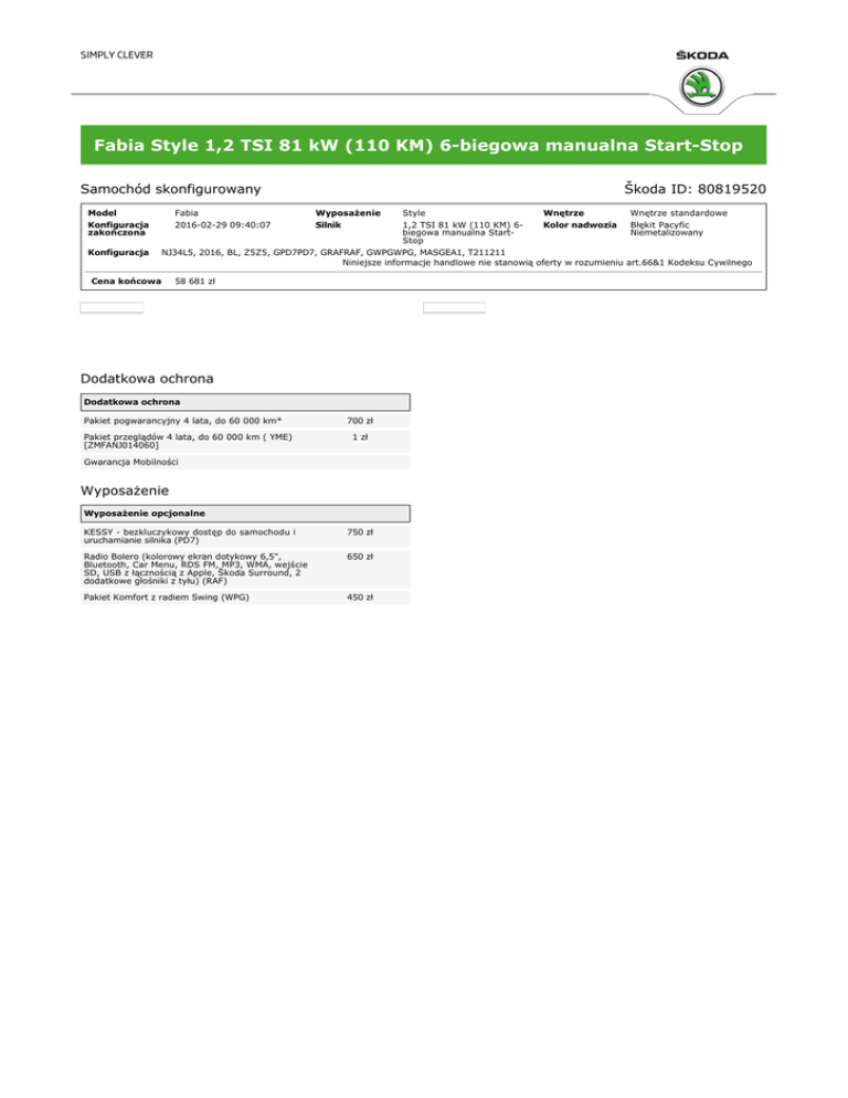 Fabia Style 1,2 TSI 81 kW (110 KM) 6-biegowa manualna Start-Stop Samochód skonfigurowany Model Konfiguracja zakończona Konfiguracja Style Wnętrze Wnętrze standardowe 1,2 TSI 81 kW (110 KM) 6Kolor nadwozia Błękit Pacyfic biegowa manualna StartNiemetalizowany Stop NJ34L5, 2016, BL, Z5Z5, GPD7PD7, GRAFRAF, GWPGWPG, MASGEA1, T211211 Niniejsze informacje handlowe nie stanowią oferty w rozumieniu art.66&1 Kodeksu Cywilnego Cena końcowa Fabia 2016-02-29 09:40:07 Škoda ID: 80819520 Wyposażenie Silnik 58 681 zł Dodatkowa ochrona Dodatkowa ochrona Pakiet pogwarancyjny 4 lata, do 60 000 km* Pakiet przeglądów 4 lata, do 60 000 km ( YME) [ZMFANJ014060] 700 zł 1 zł Gwarancja Mobilności Wyposażenie Wyposażenie opcjonalne KESSY - bezkluczykowy dostęp do samochodu i uruchamianie silnika (PD7) 750 zł Radio Bolero (kolorowy ekran dotykowy 6,5", Bluetooth, Car Menu, RDS FM, MP3, WMA, wejście SD, USB z łącznością z Apple, Škoda Surround, 2 dodatkowe głośniki z tyłu) (RAF) 650 zł Pakiet Komfort z radiem Swing (WPG) 450 zł Twoja oferta finansowania Rodzaj finansowania ŠKODA Kredyt Niskich Rat Parametry finansowe Wkład własny - kwota 17 604 zł Ubezpieczenie komunikacyjne za 1 rok (finansowane) 30 573 zł 3 opcje zakończenia kredytowania: 1) jednorazowa spłata raty finalnej 2) rozłożenie raty finalnej na raty miesięczne 3) przekazanie pojazdu do Dealera i rozliczenie raty finalnej 1 936 zł Rata miesięczna 395 zł Opcje zakończenia Rata finalna Nota prawna Podana rata miesięczna stanowi orientacyjną wysokość raty miesięcznej ŠKODA Kredytu Niskich Rat wyliczonej dla wskazanych powyżej założeń. Ilekroć mowa jest o miesięcznym koszcie elementu wyposażenia opcjonalnego rozumie się przez to zwiększenie raty miesięcznej ŠKODA Kredytu Niskich Rat wyliczonej dla wskazanych powyżej założeń w wyniku wybrania dodatkowego elementu wyposażenia. ŠKODA Kredyt Niskich Rat - reprezentatywny przykład ustalony i przekazywany zgodnie z ustawą o kredycie konsumenckim: cena samochodu: 58 435 zł; wkład własny: 11 687 zł; całkowita kwota kredytu: 46 748 zł; stopa oprocentowania kredytu: 3,99%; całkowity koszt kredytu: 12 253 zł obejmuje: prowizję bankową: 2 527 zł, odsetki: 5 932 zł, składkę ubezpieczenia komunikacyjnego: 1 590 zł, składkę ubezpieczenia spłaty kredytu: 2 204 zł; rzeczywista stopa oprocentowania 9,30%; czas obowiązywania umowy: 48 miesięcy; całkowita kwota do zapłaty przez konsumenta: 59 001 zł; wysokość raty: 823 zł. Oferta przygotowana przez Volkswagen Bank Polska S.A. przy skorzystaniu z ubezpieczenia komunikacyjnego i ubezpieczenia spłaty kredytu oferowanych przez Volkswagen Serwis Ubezpieczeniowy Sp. z o.o. Niniejsza informacja nie stanowi oferty w rozumieniu kodeksu cywilnego. Dostępność i warunki produktu mogą ulec zmianie. Warunki produktu określa umowa. © ŠKODA AUTO, Volkswagen Group Polska Sp. z o.o. Zastrzeżenie Page 2 of 2