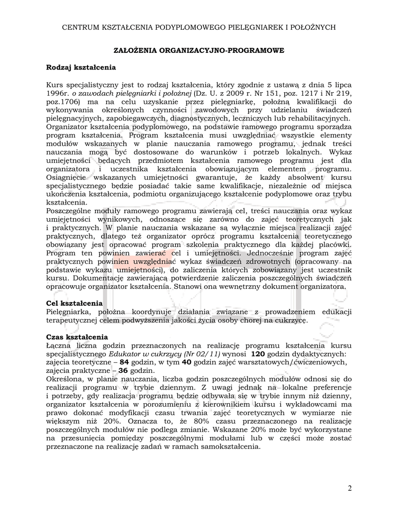 CENTRUM KSZTAŁCENIA PODYPLOMOWEGO PIELĘGNIAREK I POŁOŻNYCH ZAŁOŻENIA ORGANIZACYJNO-PROGRAMOWE Rodzaj kształcenia Kurs specjalistyczny jest to rodzaj kształcenia, który zgodnie z ustawą z dnia 5 lipca 1996r. o zawodach pielęgniarki i położnej (Dz. U. z 2009 r. Nr 151, poz. 1217 i Nr 219, poz.1706) ma na celu uzyskanie przez pielęgniarkę, położną kwalifikacji do wykonywania określonych czynności zawodowych przy udzielaniu świadczeń pielęgnacyjnych, zapobiegawczych, diagnostycznych, leczniczych lub rehabilitacyjnych. Organizator kształcenia podyplomowego, na podstawie ramowego programu sporządza program kształcenia. Program kształcenia musi uwzględniać wszystkie elementy modułów wskazanych w planie nauczania ramowego programu, jednak treści nauczania mogą być dostosowane do warunków i potrzeb lokalnych. Wykaz umiejętności będących przedmiotem kształcenia ramowego programu jest dla organizatora i uczestnika kształcenia obowiązującym elementem programu. Osiągnięcie wskazanych umiejętności gwarantuje, że każdy absolwent kursu specjalistycznego będzie posiadać takie same kwalifikacje, niezależnie od miejsca ukończenia kształcenia, podmiotu organizującego kształcenie podyplomowe oraz trybu kształcenia. Poszczególne moduły ramowego programu zawierają cel, treści nauczania oraz wykaz umiejętności wynikowych, odnoszące się zarówno do zajęć teoretycznych jak i praktycznych. W planie nauczania wskazane są wyłącznie miejsca realizacji zajęć praktycznych, dlatego też organizator oprócz programu kształcenia teoretycznego obowiązany jest opracować program szkolenia praktycznego dla każdej placówki. Program ten powinien zawierać cel i umiejętności. Jednocześnie program zajęć praktycznych powinien uwzględniać wykaz świadczeń zdrowotnych (opracowany na podstawie wykazu umiejętności), do zaliczenia których zobowiązany jest uczestnik kursu. Dokumentację zawierającą potwierdzenie zaliczenia poszczególnych świadczeń opracowuje organizator kształcenia. Stanowi ona wewnętrzny dokument organizatora. Cel kształcenia Pielęgniarka, położna koordynuje działania związane z prowadzeniem edukacji terapeutycznej celem podwyższenia jakości życia osoby chorej na cukrzycę. Czas kształcenia Łączna liczna godzin przeznaczonych na realizację programu kształcenia kursu specjalistycznego Edukator w cukrzycy (Nr 02/11) wynosi 120 godzin dydaktycznych: zajęcia teoretyczne – 84 godzin, w tym 40 godzin zajęć warsztatowych/ćwiczeniowych, zajęcia praktyczne – 36 godzin. Określona, w planie nauczania, liczba godzin poszczególnych modułów odnosi się do realizacji programu w trybie dziennym. Z uwagi jednak na lokalne preferencje i potrzeby, gdy realizacja programu będzie odbywała się w trybie innym niż dzienny, organizator kształcenia w porozumieniu z kierownikiem kursu i wykładowcami ma prawo dokonać modyfikacji czasu trwania zajęć teoretycznych w wymiarze nie większym niż 20%. Oznacza to, że 80% czasu przeznaczonego na realizację poszczególnych modułów nie podlega zmianie. Wskazane 20% może być wykorzystane na przesunięcia pomiędzy poszczególnymi modułami lub w części może zostać przeznaczone na realizację zadań w ramach samokształcenia. 2 CENTRUM KSZTAŁCENIA PODYPLOMOWEGO PIELĘGNIAREK I POŁOŻNYCH Sposób organizacji Za przebieg i organizację kursu specjalistycznego odpowiedzialny jest organizator kształcenia. Planując realizację kursu organizator powinien: 1. Opracować program kształcenia: zajęć teoretycznych, zajęć praktycznych. 2. Opracować regulamin organizacyjny kursu specjalistycznego, który w szczególności określa: organizację, zasady i sposób naboru osób, prawa i obowiązki osób uczestniczących, zakres obowiązków wykładowców i innych osób prowadzących nauczanie teoretyczne i szkolenie praktyczne, zasady przeprowadzenia egzaminu końcowego. 3. Powołać kierownika kursu specjalistycznego. Do zadań kierownika kursu oprócz zadań określonych w rozporządzeniu Ministra Zdrowia z dnia 29 października 2003 r. w sprawie kształcenia podyplomowego pielęgniarek i położnych (Dz. U. Nr 197 poz.1923) powinno należeć: współdecydowanie o doborze kadry dydaktycznej, przedstawienie uczestnikom kursu: celu, programu i organizacji szkolenia, ocenianie placówek szkolenia praktycznego wg specyfiki i organizacji zajęć, pomaganie w rozwiązywaniu problemów, udzielanie indywidualnych konsultacji uczestnikom kursu, zbieranie i analizowanie opinii o przebiegu kursu. W dniu rozpoczęcia kursu każdy uczestnik powinien otrzymać: harmonogram zajęć teoretycznych i praktycznych, wykaz umiejętności będących przedmiotem kształcenia. 4. Przeprowadzić postępowanie kwalifikacyjne. 5. Powołać w uzgodnieniu z kierownikiem kursu kadrę dydaktyczną posiadającą kwalifikacje określone w programie ramowym: wykładowców, opiekunów szkolenia praktycznego, którzy powinni być merytorycznymi pracownikami placówek, w których odbywa się szkolenie praktyczne. Do zadań opiekuna szkolenia praktycznego należy: instruktaż wstępny (zapoznanie z celem szkolenia praktycznego, z organizacją pracy, wyposażeniem placówki, jego personelem, zakresem udzielanych świadczeń i in.), instruktaż bieżący (organizacja i prowadzenie zajęć, kontrola nad ich prawidłowym przebiegiem, pomoc w rozwiązywaniu problemów i in.), instruktaż końcowy (omówienie i podsumowanie zajęć, zaliczenie świadczeń zdrowotnych określonych w programie kształcenia, ocena uzyskanych wiadomości i umiejętności). 6. Zapewnić bazę dydaktyczną dostosowaną do liczby uczestników kursu, wyposażoną w niezbędne środki dydaktyczne. 7. Zaprojektować, w odniesieniu do wybranych modułów metody/formy zajęć, ze szczególnym uwzględnieniem metod/form aktywizujących – zorganizować warsztaty/ćwiczenia w warunkach symulowanych. 8. Wskazać literaturę do poszczególnych mo