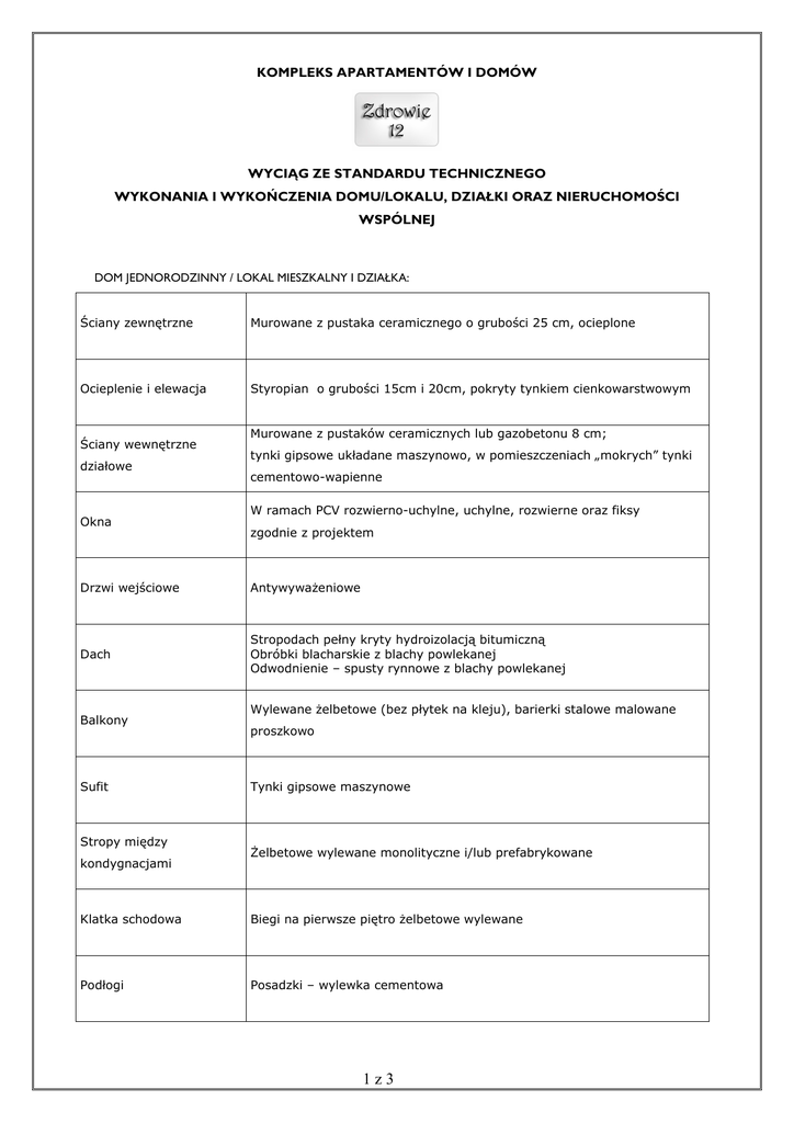 KOMPLEKS APARTAMENTÓW I DOMÓW WYCIĄG ZE STANDARDU TECHNICZNEGO WYKONANIA I WYKOŃCZENIA DOMU/LOKALU, DZIAŁKI ORAZ NIERUCHOMOŚCI WSPÓLNEJ DOM JEDNORODZINNY / LOKAL MIESZKALNY I DZIAŁKA: Ściany zewnętrzne Murowane z pustaka ceramicznego o grubości 25 cm, ocieplone Ocieplenie i elewacja Styropian o grubości 15cm i 20cm, pokryty tynkiem cienkowarstwowym Ściany wewnętrzne działowe Okna Murowane z pustaków ceramicznych lub gazobetonu 8 cm; tynki gipsowe układane maszynowo, w pomieszczeniach „mokrych” tynki cementowo-wapienne W ramach PCV rozwierno-uchylne, uchylne, rozwierne oraz fiksy zgodnie z projektem Drzwi wejściowe Antywyważeniowe Dach Stropodach pełny kryty hydroizolacją bitumiczną Obróbki blacharskie z blachy powlekanej Odwodnienie – spusty rynnowe z blachy powlekanej Balkony Sufit Stropy między kondygnacjami Wylewane żelbetowe (bez płytek na kleju), barierki stalowe malowane proszkowo Tynki gipsowe maszynowe Żelbetowe wylewane monolityczne i/lub prefabrykowane Klatka schodowa Biegi na pierwsze piętro żelbetowe wylewane Podłogi Posadzki – wylewka cementowa 1z3 Ściany fundamentowe Betonowe, grubości 24 cm z bloczka betonowego, zaizolowane przeciwwilgociowo i ocieplone Ławy fundamentowe Wylewane, ciągłe, zbrojone Kuchnia Podejścia do urządzeń zgodnie z projektem Łazienki Podejścia do urządzeń zgodne z projektem Instalacja centralnego Grzejniki stalowe płytowe z zaworami termostatycznymi lub stalowe ogrzewania drabinkowe z zaworami termostatycznymi (łazienki), zgodnie z projektem Kotłownia Kocioł gazowy dwufunkcyjny wiszący z zamkniętą komorą spalania Instalacja wodna Instalacja kanalizacyjna Rozprowadzona wewnątrz bez osprzętu i armatury, zgodnie z projektem Rozprowadzona wewnątrz bez osprzętu i armatury, zgodnie z projektem Doprowadzona do kotłowni gazowej do zasilania pieca oraz kuchni, Instalacja gazowa zgodnie z projektem. Opomiarowanie przewidziane w zewnętrznej skrzynce gazowej. Instalacja elektryczna Rozprowadzona wewnątrz bez osprzętu Instalacja TV i internetowa – zgodnie z projektem Inne instalacje Instalacja domofonowa Ogród Ogrodzenie wewnętrzne Ogród – trawniki wysiewane Ogrodzenie wewnętrzne systemowe - wysokość około 100 cm z siatki ocynkowanej 2z3 Taras naziemny i schody wejściowe Z kostki betonowej Kominek W budynku zaprojektowano trzon kominowy umożliwiający podłączenie (dotyczy tylko mieszkań kominka wewnętrznego z zamykanym wkładem wraz z systemowym dwupoziomowych) wkładem kominowym NIERUCHOMOŚĆ WSPÓLNA: Ogrodzenie zewnętrzne systemowe – siatka z paneli ocynkowanych na Ogrodzenie zewnętrzne słupkach stalowych (wysokość min 150 cm), furtki i bramy z paneli systemowych, panele osłonowe pełne z drewna kompozytowego oraz ogrodzenia murowane z bloczku silikatowego Chodniki, stopnie zewnętrzne i tarasy na Kostka brukowa betonowa gruncie Śmietnik (zewnętrzny, Wydzielone, utwardzone miejsce na odpadki, otoczone murowaną ścianą wspólny) wys. 180cm, niezadaszone, przeznaczone na 6 zamykanych pojemników Elektryczna z sieci miejskiej Wodno-kanalizacyjna z sieci miejskiej ze wspólnym przyłączem dla całego Media, instalacje zewnętrzne kompleksu Odprowadzenie ścieków do kanalizacji miejskiej grawitacyjnie Gazowa z sieci miejskiej Oświetlenie strefy wejściowej do lokali 3z3
