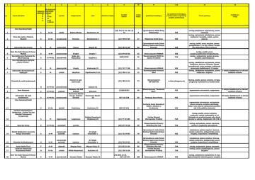 1 Lp. 2 nazwa placówki 3 4 Do kogo jest kategoria kierowana placówki: usługa: S K H K+Dz N M O K+M K+M+Dz 5 6 7 8 9 10 11 11A 12 14 powiat miejscowość ulica dzielnica miasta kontakt telefon Liczba miejsc podmiot prowadzący czy podmiot prowadzący posiada status organizacji pożytku publicznego Forma pomocy dodatkowe uwagi płocki Biała k/Płocka Sienkiewicz 18 (24) 261 32 23; 261 32 12 8 Dom Samotnej Matki 1 S K+Dz Zgromadzenie Matki Bożej Miłosierdzia NIE nocleg,całodzienne wyżywienie, pomoc rzeczowa 8 2 7 6 0 2 Dom dla matek z Dziećmi Nazaret S K+Dz pruszkowski Brwinów Sienkiewicza 4 (22) 729 62 29 27 Wspólnota Chleb Życia NIE nocleg, wyżywienie całodobowo, pomoc medyczna i socjalna, szkoła, pomoc prawna 3 Schronisko Don Orione S M wołomiński Czarna Witosa 46 (22) 787 81 00 80 Zgromadzenie małe Dzieło Boskiej Opatrzności Księża Orioniści NIE nocleg, posilki, praca socjalna, pomoc pielęgniarska 1 x w tyg. Lekarz, terapia dla alkoholików (zima-wiosna) S K+M ciechanowski Dreglin 7 (23) 674 00 26 35 S K+M+Dz żyrardowski Dreglin Gąba, gm. Mszczonów 668210263 30 4 5 Dom Dla Osób Starszych MonarMarkot Specjalistyczna Placówka Dla Ofia Przemocy Dom Odzyskanych dla Życia ,,Monar-Markot” 6 7 S Schronisko dla bezdomnych meżczyzn S M M piaseczyński miński 9 10 O Dom Kleszewo Schronisko dla osób bezdomnych Hipolitów Krakowska 29 Hipolitowska 121a Janowo 42, gm. Zakroczym Ośrodek dla osób bezdomnych 8 Grzędy Socjalna 2 S S K+M+Dz K+M+Dz K+M+Dz nowodworski (22) 727 72 98 35 Stowarzyszenie MONAR Stowarzyszenie FILOS im. Joanny Froehlich Stowarzyszenie MONAR Stowarzyszenie Pomocna Dłoń NIE TAK NIE (22) 760 41 14 15 NIE (22) 785 50 24 72 Stowarzyszenie ANTIDOTUM (23)6920353 40 Stowarzyszenie "Serdeczna Dłoń" NIE 507 524 538 60 Fundacja Serce Marka NIE 15 Fundacja Domy Samotnych Matek z Dziećmi w Kraśniewie (22) 77 29 405 (48) 677 30 28 w toku ubiegania się nocleg, posiłki, praca socjalna,społeczność terapeutyczna, nocleg , wyżywienie, pomoc prawna, socjalna, psychologiczna nocleg, całodzienne wyżywienie, pomoc medyczna, prawna, rzeczowa, paczki żywnościowe, praca socjalna, możliwość stworzenia dodatkowych 15 miejsc nocleg, całodzienne wyżywienie, pomoc medyczna i socjalna 3 2 3 4 5 miejsc dodatkowych w okresie nasilenia mrozów Nocleg, posiłki, pomoc socjalna, terapia, programy wychodzenia z bezdomności 7 5 Janowo 42 pułtuski Kleszewo, 06-100 Pułtusk Kleszewo ciechanowski Konarzewo Sławki 18, gm. Gołymin Ośrodek Konarzewo Sławki 18 zapewnienie schronienia, wyżywienia zapewnienie schronienia, wyżywienia 5 miejsc dodatkowych w okresie nasilenia mrozów 20 miejsc dodatkowych w okresie nasilenia mrozów Dom Samotnej Matki 11 S K+Dz płoński Kraśniewo Kraśniewo 23 Polskiej Organizacji Wojskowej 20 Centrum CharytatywnoOpiekuńcze ,,Caritas”(w tym Ośrodek Interwencji Kryzysowej) 12 S M legionowski Legionowo S K+M+Dz zwoleński Lucimia 13 Dom Dar Serca 14 Zakład Opiekuńczo-Leczniczy Księży Orionistów S K+M warszawskizachodni 15 Ośrodek dla Bezdomnych H K+M 16 S 17 Agro-Szkoła Życia Centrum interwencji Kryzysowej-Hostel 18 Dom Dla Osób Starszych MonarMarkot 600 432 491 NIE zapewnienie schronienia, wyżywienia, pomoc prawna, socjalna, psycholog, lekarz oraz zimowe wydawanie posiłków (ok.115 posiłków dziennie) 1 5 30 Caritas Diecezji Warszawsko-Praskiej TAK nocleg, posiłki, pomoc socjalna, medyczna, odzież, jadlodajnia od 15 listopada do grudnia danego roku działa również w soboty. Odpłatność 100-150 zł 5 3 60 Stowarzyszenie Pomocy Bliźniemu Mar-Kot TAK nocleg, wyżywienie, pomoc rzeczowa, pomoc w uzyskaniu zatrudnienia 5 8 Zgromadzenie małe Dzieło Boskiej Opatrzności Księża Orioniści NIE całodobowa opieka socjalna i bytowa, opieka medyczna, pielęgniarska, praca socjalna, wyżywienie, rehabilitacja 5 0 NIE całodobowa opieka socjalna i bytowa, opieka medyczna, pielęgniarska, praca socjalna, wyżywienie, rehabilitacja 4 6 Łaźniew Al. Księży Orionistów 1 (22) 731 99 93 70 warszawskizachodni Łaźniew Al. Księży Orionistów 1 (22) 731 99 33 50 K+M mławski Miączyn Duży Miączyn Duży 19 (23) 652 01 04 80 H K+Dz miński Mińsk Mazowiecki Kościelna 18 (25) 756 32 06 10 Zgromadzenie małe Dzieło Boskiej Opatrzności Księża Orioniści Stowarzyszenie Pomocy Bliźniemu Mar-Kot Caritas Diecezji Warszawsko-Praskiej S K+M żyrardowski Oryszew Osada Oryszew Osada 10 200 Stowarzyszenie MONAR (46) 855 32 45, 604 150 024 TAK TAK nocleg, wyżywienie, pomoc rzeczowa nocleg, pomoc psychologiczna, pomoc socjalna NIE nocleg, całodzienne wyżywienie (4 razy dziennie)opieka lekarska,pomoc socjalna 7 4 1 0 1 9 3 1 Lp. 2 nazwa placówki 3 4 Do kogo jest kategoria kierowana placówki: usługa: S K H K+Dz N M O K+M K+M+Dz 5 6 7 8 9 10 11 11A 12 14 powiat miejscowość ulica dzielnica miasta kontakt telefon Liczba miejsc podmiot prowadzący czy podmiot prowadzący posiada status organizacji pożytku publicznego Forma pomocy dodatkowe uwagi Noclegownia dla Bezdomnych Mężczyzn 19 N M Miasto Ostrołęka Ostrołęka Przemysłowa 1 (29) 760 60 18 30 Polski Komitet Pomocy Społecznej Zarząd w Ostrołęce n/d nocleg, całodzienne wyżywienie, kąpiel, odzież, świadczenia zdrowotne (leki), środki czystosci, terapia uzależnień, psycholog, pomoc socjalna, pokoj dziennego pobytu, biblioteka, kompleksowa pomoc medyczna (lekarz POZ, psychiatra, stomatolog) możliwość stworzenia dodatkowych 20 miejsc 2 0 20 Schronisko MOPR S K+M+Dz Miasto Ostrołęka Ostrołęka Sienkiewicza 46/2 i 48/12 (29) 764 41 30 12 Miejski Ośrodek Pomocy Społecznej w Ostrołęce n/d nocleg, gorący posiłek, zasiłek 1 0 21 Centrum Interwencji Kryzysowej - Dom Otwartych Serc H K+Dz otwocki Otwock Tadeusza 12 (22) 779 58 63 25 Caritas Diecezji Warszawsko-Praskiej TAK nocleg, wyżywienie, pomoc psychologiczna i terapeutyczna, pomoc socjalna 2 0 S K+Dz (22) 779 58 30 15 NIE nocleg, całodzienne wyżywienie, pomoc socjalna, psychologiczna W okresie 