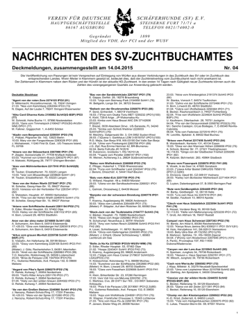 VEREIN FÜR DEUTSCHE HAU PT GES CH ÄF TS S T E LL E 8 6 1 6 7 AUGS BUR G SCHÄFERHUNDE (SV) E.V. S TEI NER N E F URT 7 1 /7 1 a TE LEF O N 0 8 2 1 / 7 4 0 0 2 - 0 Geg rü n d et 1899 Mi tg l ied d es VD H, d e r F CI u n d d er WUS V NACHRICHTEN DES SV-ZUCHTBUCHAMTES Deckmeldungen, zusammengestellt am 14.04.2015 Nr. 04 Die Veröffentlichung von Paarungen ist kein Versprechen auf Eintragung von Würfen aus diesen Verbindungen in das Zuchtbuch des SV oder im Zuchtbuch des entsprechenden Landes. Wenn Mieter in Klammern gesetzt ist, bedeutet dies, daß der Zuchtmietvertrag vom Zuchtbuchamt noch nicht anerkannt ist. Der Zahlenwert in Klammern neben dem Rüden und der Hündin ist der aktuelle HD-Zuchtwert. In den ersten 14 Tagen nach Gültigkeit neuer Zuchtwerte können auch die Zahlen des vorangegangenen Quartals zur Anwendung gebracht werden. Deckakte Stockhaar *Agent von der roten Zora 2274125 IPO2 (81) D. Mitternacht, Wurzelbrunnenstr. 10, 79241 Ihringen 21.03. *Nea vom Kammberg 2262064 IPO3 (73) N. Dages, Auf der Laube 7, 79241 Ihringen-Wasenweiler *Aiko Canil Dharma Kokx 2195082 SchH3(G-BSP) IPO3 (77) W. Schmidt, Hohe Buche 11, 97996 Niederstetten 26.03. *Gera vom Timmelsjoch 2196427 IPO3(SG-WUSVWM) ÖPO1 (77) M. Falkner, Giggijochstr. 1, A-6450 Sölden *Aladin vom Bergmannsland 2259391 IPO3 (78) C. Prätzel, Pilgramer Str. 142, 12623 Berlin 10.03. Mary von der Fangschleuse 2283026 IPO1 (85) J. Michalowski, 11240 First St. East , US-Treasure Island, FL 33706 *Amore von der Stösserbank 2267088 IPO1 (76) P. Ziegler, Sonnenmatte 31, 77709 Wolfach-Halbmeil 03.03. *Hummel von Unterm-Busch 2260270 IPO1 (87) H. Makoski, Rühligweg 28, 79777 Ühlingen-Brenden *Ares vom Mühlviertlerdom 2217910 IPO3 SchH2(B) (77) M. Teuber, Elisabethenstr. 70, 63225 Langen 13.03. *Islar vom Blizzardkegel 2208620 SchH1 (81) M. Teuber, Elisabethenstr. 70, 63225 Langen *Arex von der Hohen Warth 2275447 IPO1 (75) M. Scheibe, Georg-Haar-Str. 15, 99427 Weimar 30.03. Vanessa von der Herbsleber Flur 2283541 IPO1 (82) G. Wetzstein, Hauptstr. 47, 99955 Herbsleben 04.04. *Tina von der Hohen Warth 2240915 SchH1 (73) M. Scheibe, Georg-Haar-Str. 15, 99427 Weimar *Ariano vom Schiffslache-Auwald 2281104 IPO2 (71) D. Edler, Rhoder Hauptstr. 53, 57462 Olpe 15.03. Hailey von der Schiffslache 2281102 IPO1 (85) H. Born, Linward 29, 48703 Stadtlohn Aron von der alma mater 2216888 SchH1 (82) A. Schumann, Am Stein 6, 04910 Elsterwerda 17.+20.03. *Gina vom Adelsberger Hof 2263819 IPO1 (71) A. Schumann, Am Stein 6, 04910 Elsterwerda *Artus vom grauen Ma-Holt 2239798 SchH1 IPO3(VBSP) (77) S. Viebahn, Am Haferkamp 38, 59199 Bönen 22.03. *Gissy vom Kammberg 2228108 SchH3 IPO3 FH1 (80) (Mieter): J. Götz, Rachertshofen 3, 84091 Attenhofen 24.03. *Xindi von der Schiffslache 2268963 IPO3 (99) T.O. Nierychlo, Rotdornweg 35, 58509 Lüdenscheid 25.03. *Brisa de Parayas LOE 1547554 IPO1(79) P.L. Gutierrez Rebolledo, Avd. Parayes 132, E-39600 Maliano *Asgard von Pike's Spirit 2286279 IPO2 (78) D. Rohde, Kuhweg 7, 26954 Nordenham 09.03. *Yedi's Ritter Amyra 2261178 IPO3 (77) D. Rohde, Kuhweg 7, 26954 Nordenham 01.04. *Haily von den wilden Grauen 2244022 IPO3 (71) D. Rohde, Kuhweg 7, 26954 Nordenham *Ax von den Großen Steinen 2246960 SchH1 IPO3 (76) J. Narozny, Robert-Schulz-Ring 17, 17291 Prenzlau 16.+20.03. *Mara von der Spree 2215360 IPO2 (75) J. Narozny, Robert-Schulz-Ring 17, 17291 Prenzlau *Bac von der Sandsteinküste 2267657 IPO1 (79) E. Gappa, Dorfstr. 28, 18276 Braunsberg 13.03. *Unja vom Steinway-Park 2194958 SchH1 (78) W. Bellgarth, Lange Str. 24, 38723 Seesen *Ballack von der Brucknerallee 2266879 IPO3 (88) P. Send, Einhardstr. 1, 68519 Viernheim 16.03. (*)Fina vom Osaka Toriu MET 1239232 (IPO1)(100) K. Kishi, 728-8 Arige , JP-Wakamatsu-Ku 23.03. Kimba vom Haus Brezel AKC DN 37142606 IPO2(87) T. Brezel, 3639 Aberdeen Drive , US-Sarasota, FL 34240 25.03. *Simba vom Schloß Weitmar 2228033 SchH1(IPO1) (79) M. Meichtry, Galgenwald Str. 3, CH-3952 Susten-West 26.03. (*)Quena v. Garikhaus LOM 3-0018757 (IPO1)(100) R.G. Mejia, San Borja 918, MX-03100 Del Valle San Borja 01.04. *Ulme vom Frankengold 2265758 IPO1 (89) J.G. Zipf, Rua Emma Hemmer 42, BR-Blumenau 02.04. Berta Fixfrutta JR 743519 M. Dukanovic, Izvidacka 1, RS-14210 Ub 03.04. *Yuppie vom Pendler 2266147 IPO1 (102) W. Meinen, Achterweg 3 a, 26624 Südbrookmerland *Balou vom Wolfsdreieck 2246660 IPO3 (76) E. Pflüger, Huberhof 1, 77836 Rheinmünster 02.04. *Fyna vom Schiffweiler Land 2243347 IPO2 (75) J. Berens, Drieschstr. 4, 54441 Kierf-Beuren *Balu vom Abtei-Eck 2257758 IPO3 (74) G. Willand, Hauptstr. 49 a, 64839 Münster 29.03. *Ulana von der Sandkautschneise 2266521 IPO1 (89) L. Galinski, Drosselweg 2, 64409 Messel *Banjoko von der schwarzen Brandung 2240776 IPO1 (77) T. Kramny, Augsbergweg 59, 56626 Andernach 30.03. *Aleia vom Lahnblick 2264409 IPO1 (73) (Mieter): P. Stöppler, Auf dem Rödchen 30, 65582 Diez *Black-Jack von der Teufelskehle 2194777 SchH3 (74) U. Bäcker, Hauptstr. 73, 76889 Niederhorbach 18.03. *Raisa vom Anger 2262982 IPO3 (79) N. Schytrumpf, Neuenhaus 2, 58791 Werdohl 29.03. *Amy vom hohen Resch 2208896 SchH3 IPO3 FH1 FH2 (90) A. Lauer, Schloßbergstr. 11, 66701 Beckingen 03.04. *Olivia vom Kieferngarten 2249305 IPO2 (73) (Mieter): J. Erhard, Oberer Schlössleweg 1, 86983 Lechbruck am See *Bolle Ja Na Ka 2279829 IPO3(V-WUSV-WM) (78) D. Edler, Rhoder Hauptstr. 53, 57462 Olpe 21.02. *Hoope 2243401 SchH1 IPO3 FH2 (73) S. Kramny, Augsbergweg 59, 56626 Andernach 12.03. (*)Idgie vom Haus Cismar 2179637 SchH3(SGLGA)(IPO3) (72) H. Kretzschmar, Kolonieweg 71 b, 06888 Mochau 14.03. *Sunshine von der Schiffslache 2262660 IPO2 (80) (Mieter): H. Born, Linward 29, 48703 Stadtlohn 16.03. *Clara vom Fesselhain 2229006 SchH1 IPO3 FH1 (69) H. Klein, Birkenfelder Str. 23, 97280 Remlingen 17.03. Veni Vidi Vici von Metunaj 2293762 (73) C. Martinez, Cva. 28 CH71 Sur-103 , CO-0001 SabanetaAntioquita 18.03. *Pola II de Parayas LOE 2019061 IPO1(2,3)(80) P.L. Gutierrez Rebolledo, Avd