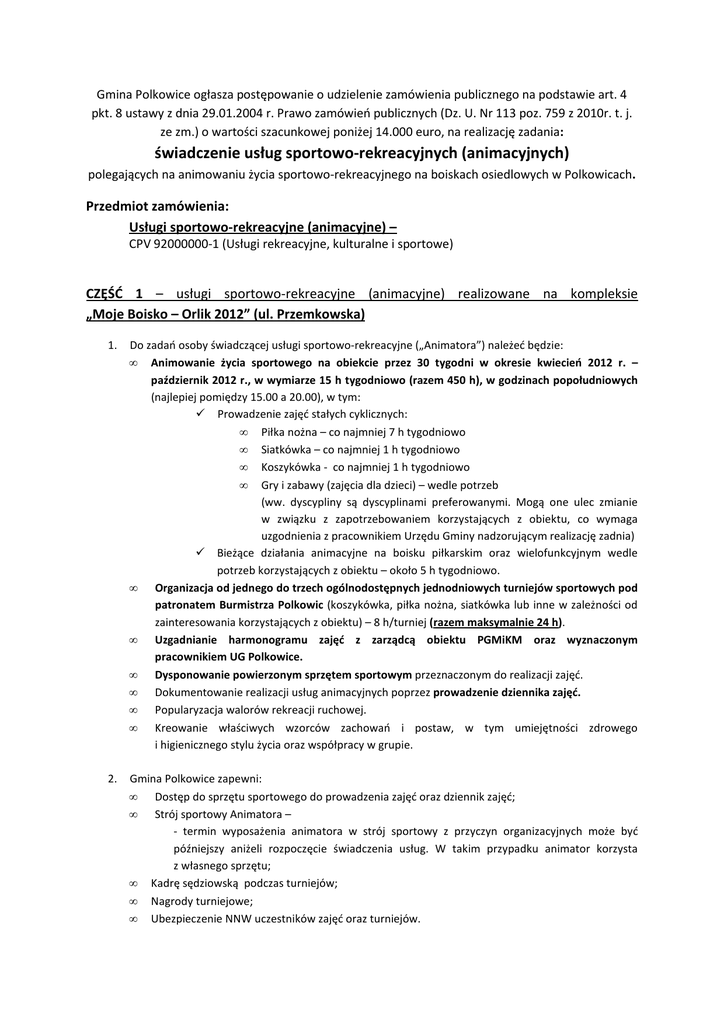 Gmina Polkowice ogłasza postępowanie o udzielenie zamówienia publicznego na podstawie art. 4 pkt. 8 ustawy z dnia 29.01.2004 r. Prawo zamówień publicznych (Dz. U. Nr 113 poz. 759 z 2010r. t. j. ze zm.) o wartości szacunkowej poniżej 14.000 euro, na realizację zadania: świadczenie usług sportowo-rekreacyjnych (animacyjnych) polegających na animowaniu życia sportowo-rekreacyjnego na boiskach osiedlowych w Polkowicach. Przedmiot zamówienia: Usługi sportowo-rekreacyjne (animacyjne) – CPV 92000000-1 (Usługi rekreacyjne, kulturalne i sportowe) CZĘŚĆ 1 – usługi sportowo-rekreacyjne (animacyjne) realizowane na kompleksie „Moje Boisko – Orlik 2012” (ul. Przemkowska) 1. Do zadań osoby świadczącej usługi sportowo-rekreacyjne („Animatora”) należeć będzie: • Animowanie życia sportowego na obiekcie przez 30 tygodni w okresie kwiecień 2012 r. – październik 2012 r., w wymiarze 15 h tygodniowo (razem 450 h), w godzinach popołudniowych (najlepiej pomiędzy 15.00 a 20.00), w tym: Prowadzenie zajęć stałych cyklicznych: • Piłka nożna – co najmniej 7 h tygodniowo • Siatkówka – co najmniej 1 h tygodniowo • Koszykówka - co najmniej 1 h tygodniowo • Gry i zabawy (zajęcia dla dzieci) – wedle potrzeb (ww. dyscypliny są dyscyplinami preferowanymi. Mogą one ulec zmianie w związku z zapotrzebowaniem korzystających z obiektu, co wymaga uzgodnienia z pracownikiem Urzędu Gminy nadzorującym realizację zadnia) Bieżące działania animacyjne na boisku piłkarskim oraz wielofunkcyjnym wedle potrzeb korzystających z obiektu – około 5 h tygodniowo. • Organizacja od jednego do trzech ogólnodostępnych jednodniowych turniejów sportowych pod patronatem Burmistrza Polkowic (koszykówka, piłka nożna, siatkówka lub inne w zależności od zainteresowania korzystających z obiektu) – 8 h/turniej (razem maksymalnie 24 h). • Uzgadnianie harmonogramu zajęć z zarządcą obiektu PGMiKM oraz wyznaczonym pracownikiem UG Polkowice. • Dysponowanie powierzonym sprzętem sportowym przeznaczonym do realizacji zajęć. • Dokumentowanie realizacji usług animacyjnych poprzez prowadzenie dziennika zajęć. • Popularyzacja walorów rekreacji ruchowej. • Kreowanie właściwych wzorców zachowań i postaw, w tym umiejętności zdrowego i higienicznego stylu życia oraz współpracy w grupie. 2. Gmina Polkowice zapewni: • Dostęp do sprzętu sportowego do prowadzenia zajęć oraz dziennik zajęć; • Strój sportowy Animatora – - termin wyposażenia animatora w strój sportowy z przyczyn organizacyjnych może być późniejszy aniżeli rozpoczęcie świadczenia usług. W takim przypadku animator korzysta z własnego sprzętu; • Kadrę sędziowską podczas turniejów; • Nagrody turniejowe; • Ubezpieczenie NNW uczestników zajęć oraz turniejów. CZĘŚĆ 2 – usługi sportowo-rekreacyjne (animacyjne) realizowane na boisku przy ul. Lipowej/Sztygarskiej – koszykówka i siatkówka (główni odbiorcy: młodzież szkolna i dorośli) 1. Do zadań osoby świadczącej usługi sportowo-rekreacyjne („Animatora”) należeć będzie: • Animowanie życia sportowego na obiekcie przy ul. Lipowej/Sztygarskiej przez 30 tygodni w okresie kwiecień 2012 r. – październik 2012 r., w wymiarze 1,5 h tygodniowo (razem 45 h), w godzinach popołudniowych (pomiędzy 15.00 a 20.00), w formie cyklicznych zajęć w dyscyplinie KOSZYKÓWKA i SIATKÓWKA; • organizacja różnych form zajęć rekreacyjno – sportowych; • Popularyzacja walorów rekreacji ruchowej; • Kreowanie właściwych wzorców zachowań i postaw, w tym umiejętności zdrowego i higienicznego stylu życia oraz współpracy w grupie; • Dysponowanie powierzonym sprzętem sportowym przeznaczonym do realizacji zajęć; • Dokumentowanie realizacji usług animacyjnych poprzez prowadzenie dziennika zajęć; • Ewentualną zmianę dyscypliny sportowej dopuszcza się jedynie za zgodą Zamawiającego. 2. Gmina Polkowice zapewni: • Dostęp do sprzętu sportowego do prowadzenia zajęć oraz dziennik zajęć; • Strój sportowy – - termin wyposażenia animatora w strój sportowy z przyczyn organizacyjnych może być późniejszy aniżeli rozpoczęcie świadczenia usług. W takim przypadku animator korzysta z własnego sprzętu; • Ubezpieczenie NNW uczestników zajęć. CZĘŚĆ 3 – usługi sportowo-rekreacyjne (animacyjne) realizowane na boisku przy ul. Hubala – piłka nożna (główni odbiorcy: młodzież szkolna i dorośli) 3. Do zadań osoby świadczącej usługi sportowo-rekreacyjne („Animatora”) należeć będzie: • Animowanie życia sportowego na obiekcie przy ul. Hubala przez 30 tygodni w okresie kwiecień 2012 r. – październik 2012 r., w wymiarze 1,5 h tygodniowo (razem 45 h), w godzinach popołudniowych (pomiędzy 15.00 a 20.00), w formie cyklicznych zajęć w dyscyplinie PIŁKA NOŻNA; • organizacja różnych form zajęć rekreacyjno – sportowych; • Popularyzacja walorów rekreacji ruchowej; • Kreowanie właściwych wzorców zachowań i postaw, w tym umiejętności zdrowego i higienicznego stylu życia oraz współpracy w grupie; • Dysponowanie powierzonym sprzętem sportowym przeznaczonym do realizacji zajęć; • Dokumentowanie realizacji usług animacyjnych poprzez prowadzenie dziennika zajęć; • Ewentualną zmianę dyscypliny sportowej dopuszcza się jedynie za zgodą Zamawiającego. 4. Gmina Polkowice zapewni: • Dostęp do sprzętu sportowego do prowadzenia zajęć oraz dziennik zajęć; • Strój sportowy – - termin wyposażenia animatora w strój sportowy z przyczyn organizacyjnych może być późniejszy aniżeli rozpoczęcie świadczenia usług. W takim przypadku animator korzysta z własnego sprzętu; • Ubezpieczenie NNW uczestników zajęć. CZĘŚĆ 4 – usługi sportowo-rekreacyjne (animacyjne) realizowane na stadionie lekkoatletycznym przy ul. 11-go Lutego – Lekka atletyka (główni odbiorcy: młodzież szkolna i dorośli) 1. Do
