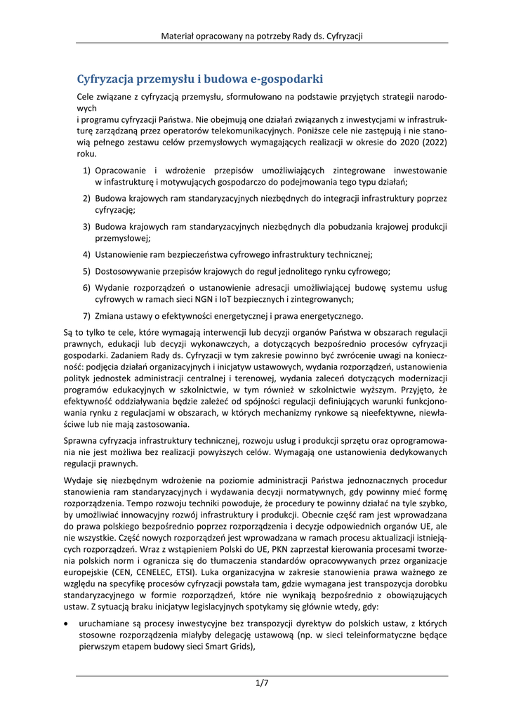 Materiał opracowany na potrzeby Rady ds. Cyfryzacji Cyfryzacja przemysłu i budowa e-gospodarki Cele związane z cyfryzacją przemysłu, sformułowano na podstawie przyjętych strategii narodowych i programu cyfryzacji Państwa. Nie obejmują one działań związanych z inwestycjami w infrastrukturę zarządzaną przez operatorów telekomunikacyjnych. Poniższe cele nie zastępują i nie stanowią pełnego zestawu celów przemysłowych wymagających realizacji w okresie do 2020 (2022) roku. 1) Opracowanie i wdrożenie przepisów umożliwiających zintegrowane inwestowanie w infastrukturę i motywujących gospodarczo do podejmowania tego typu działań; 2) Budowa krajowych ram standaryzacyjnych niezbędnych do integracji infrastruktury poprzez cyfryzację; 3) Budowa krajowych ram standaryzacyjnych niezbędnych dla pobudzania krajowej produkcji przemysłowej; 4) Ustanowienie ram bezpieczeństwa cyfrowego infrastruktury technicznej; 5) Dostosowywanie przepisów krajowych do reguł jednolitego rynku cyfrowego; 6) Wydanie rozporządzeń o ustanowienie adresacji umożliwiającej budowę systemu usług cyfrowych w ramach sieci NGN i IoT bezpiecznych i zintegrowanych; 7) Zmiana ustawy o efektywności energetycznej i prawa energetycznego. Są to tylko te cele, które wymagają interwencji lub decyzji organów Państwa w obszarach regulacji prawnych, edukacji lub decyzji wykonawczych, a dotyczących bezpośrednio procesów cyfryzacji gospodarki. Zadaniem Rady ds. Cyfryzacji w tym zakresie powinno być zwrócenie uwagi na konieczność: podjęcia działań organizacyjnych i inicjatyw ustawowych, wydania rozporządzeń, ustanowienia polityk jednostek administracji centralnej i terenowej, wydania zaleceń dotyczących modernizacji programów edukacyjnych w szkolnictwie, w tym również w szkolnictwie wyższym. Przyjęto, że efektywność oddziaływania będzie zależeć od spójności regulacji definiujących warunki funkcjonowania rynku z regulacjami w obszarach, w których mechanizmy rynkowe są nieefektywne, niewłaściwe lub nie mają zastosowania. Sprawna cyfryzacja infrastruktury technicznej, rozwoju usług i produkcji sprzętu oraz oprogramowania nie jest możliwa bez realizacji powyższych celów. Wymagają one ustanowienia dedykowanych regulacji prawnych. Wydaje się niezbędnym wdrożenie na poziomie administracji Państwa jednoznacznych procedur stanowienia ram standaryzacyjnych i wydawania decyzji normatywnych, gdy powinny mieć formę rozporządzenia. Tempo rozwoju techniki powoduje, że procedury te powinny działać na tyle szybko, by umożliwiać innowacyjny rozwój infrastruktury i produkcji. Obecnie część ram jest wprowadzana do prawa polskiego bezpośrednio poprzez rozporządzenia i decyzje odpowiednich organów UE, ale nie wszystkie. Część nowych rozporządzeń jest wprowadzana w ramach procesu aktualizacji istniejących rozporządzeń. Wraz z wstąpieniem Polski do UE, PKN zaprzestał kierowania procesami tworzenia polskich norm i ogranicza się do tłumaczenia standardów opracowywanych przez organizacje europejskie (CEN, CENELEC, ETSI). Luka organizacyjna w zakresie stanowienia prawa ważnego ze względu na specyfikę procesów cyfryzacji powstała tam, gdzie wymagana jest transpozycja dorobku standaryzacyjnego w formie rozporządzeń, które nie wynikają bezpośrednio z obowiązujących ustaw. Z sytuacją braku inicjatyw legislacyjnych spotykamy się głównie wtedy, gdy: • uruchamiane są procesy inwestycyjne bez transpozycji dyrektyw do polskich ustaw, z których stosowne rozporządzenia miałyby delegację ustawową (np. w sieci teleinformatyczne będące pierwszym etapem budowy sieci Smart Grids), 1/7 Materiał opracowany na potrzeby Rady ds. Cyfryzacji • potrzebne są rozporządzenia o charakterze horyzontalnym, to znaczy takie, które powinnny wynikać jednocześnie z wielu ustaw (np. z Prawa Telekomunikacyjnego, Prawa Energetycznego, ustawy o efektywności energetycznej, ustawy o budownictwie energooszczędnym i nieistniejącej ustawy o OZE), • potrzebne są rozporządzenia stanowiące o ramach standaryzacyjnych dotyczących sprzętu i sieci teleinformatycznych, dotychczas nieistniejących na rynku, • potrzebne są regulacje dot. sprzętu powszechnego użytku, który do tej pory nie był sprzętem sieciowym, ale wraz rozwojem sieci Internetu Rzeczy staje się sprzętem sieciowym funkcjonującym w ramach usług M2M, • dotyczy rozporządzeń ułatwiających i promujących innowacyjne podejście do produkcji i urządzeń oraz do budowy sieci teleinformatycznych o charakterze publicznym, powstających poza obszarem oddziaływania prawa telekomunikacyjnego. Ad 1). Należy opracować plan działań legislacyjnych, które pozwolą realizować inwestycje w cyfryzację infrastruktury technicznej w sposób zintegrowany. Dyrektywa PE i RADY UE 2014/61/UE z dnia 15 maja 2014 r. w sprawie środków mających na celu zmniejszenie kosztów realizacji szybkich sieci łączności elektronicznej stanowi, że Państwa członkowskie przyjmą i opublikują przepisy ustawowe, wykonawcze i administracyjne niezbędne do wykonania dyrektywy w terminie do dnia 1 stycznia 2016 r i poinformują o tym Komisję oraz wdrożą je do prawa krajowego od dnia 1 lipca 2016 roku. Rada ds. Cyfryzacji powinna być szczególnie aktywna w tym zakresie, gdyż dyrektywa dotyczy komunikacji elektronicznej realizowanej przez wszystkich operatorów infrastruktury technicznej (czyli operatorów sieci gazowej, elektroenergetycznej, cieplnej, oświetlenia, wodociągowej, drogowej, kolejowej itd.) na wszystkich poziomach, to znaczy na poziome przesyłowym i dystrybucyjnym, a także operatorów portów, lotnisk i innych węzłów o podobnym charakterze. Wdrożenie dyrektywy oznacza zmiany, w co najmniej dziesięciu ustawach i w znacznie większej liczbie rozporządzeń. Biorąc pod uwagę, że dyrektywy są praktyczną realizacją polityk europejskich oraz że wydatkowanie funduszy unijnych musi być 