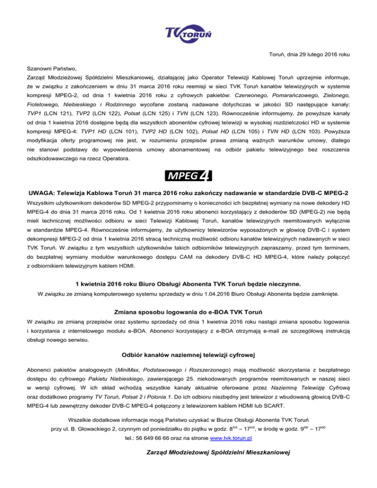 Toruń, dnia 29 lutego 2016 roku Szanowni Państwo, Zarząd Młodzieżowej Spółdzielni Mieszkaniowej, działającej jako Operator Telewizji Kablowej Toruń uprzejmie informuje, że w związku z zakończeniem w dniu 31 marca 2016 roku reemisji w sieci TVK Toruń kanałów telewizyjnych w systemie kompresji MPEG-2, od dnia 1 kwietnia 2016 roku z cyfrowych pakietów: Czerwonego, Pomarańczowego, Zielonego, Fioletowego, Niebieskiego i Rodzinnego wycofane zostaną nadawane dotychczas w jakości SD następujące kanały: TVP1 (LCN 121), TVP2 (LCN 122), Polsat (LCN 125) i TVN (LCN 123). Równocześnie informujemy, że powyższe kanały od dnia 1 kwietnia 2016 dostępne będą dla wszystkich abonentów cyfrowej telewizji w wysokiej rozdzielczości HD w systemie kompresji MPEG-4: TVP1 HD (LCN 101), TVP2 HD (LCN 102), Polsat HD (LCN 105) i TVN HD (LCN 103). Powyższa modyfikacja oferty programowej nie jest, w rozumieniu przepisów prawa zmianą ważnych warunków umowy, dlatego nie stanowi podstawy do wypowiedzenia umowy abonamentowej na odbiór pakietu telewizyjnego bez roszczenia odszkodowawczego na rzecz Operatora. UWAGA: Telewizja Kablowa Toruń 31 marca 2016 roku zakończy nadawanie w standardzie DVB-C MPEG-2 Wszystkim użytkownikom dekoderów SD MPEG-2 przypominamy o konieczności ich bezpłatnej wymiany na nowe dekodery HD MPEG-4 do dnia 31 marca 2016 roku. Od 1 kwietnia 2016 roku abonenci korzystający z dekoderów SD (MPEG-2) nie będą mieli technicznej możliwości odbioru w sieci Telewizji Kablowej Toruń, kanałów telewizyjnych reemitowanych wyłącznie w standardzie MPEG-4. Równocześnie informujemy, że użytkownicy telewizorów wyposażonych w głowicę DVB-C i system dekompresji MPEG-2 od dnia 1 kwietnia 2016 stracą techniczną możliwość odbioru kanałów telewizyjnych nadawanych w sieci TVK Toruń. W związku z tym wszystkich użytkowników takich odbiorników telewizyjnych zapraszamy, przed tym terminem, do bezpłatnej wymiany modułów warunkowego dostępu CAM na dekodery DVB-C HD MPEG-4, które należy połączyć z odbiornikiem telewizyjnym kablem HDMI. 1 kwietnia 2016 roku Biuro Obsługi Abonenta TVK Toruń będzie nieczynne. W związku ze zmianą komputerowego systemu sprzedaży w dniu 1.04.2016 Biuro Obsługi Abonenta będzie zamknięte. Zmiana sposobu logowania do e-BOA TVK Toruń W związku ze zmianą przepisów oraz systemu sprzedaży od dnia 1 kwietnia 2016 roku nastąpi zmiana sposobu logowania i korzystania z internetowego modułu e-BOA. Abonenci korzystający z e-BOA otrzymają e-mail ze szczegółową instrukcją obsługi nowego serwisu. Odbiór kanałów naziemnej telewizji cyfrowej Abonenci pakietów analogowych (MiniMax, Podstawowego i Rozszerzonego) mają możliwość skorzystania z bezpłatnego dostępu do cyfrowego Pakietu Niebieskiego, zawierającego 25. niekodowanych programów reemitowanych w naszej sieci w wersji cyfrowej. W ich skład wchodzą wszystkie kanały aktualnie oferowane przez Naziemną Telewizję Cyfrową oraz dodatkowo programy TV Toruń, Polsat 2 i Polonia 1. Do ich odbioru niezbędny jest telewizor z wbudowaną głowicą DVB-C MPEG-4 lub zewnętrzny dekoder DVB-C MPEG-4 połączony z telewizorem kablem HDMI lub SCART. Wszelkie dodatkowe informacje mogą Państwo uzyskać w Biurze Obsługi Abonenta TVK Toruń przy ul. B. Głowackiego 2, czynnym od poniedziałku do piątku w godz. 8⁰⁰ – 17⁰⁰, w środę w godz. 9⁰⁰ – 17⁰⁰ tel.: 56 649 66 66 oraz na stronie www.tvk.torun.pl Zarząd Młodzieżowej Spółdzielni Mieszkaniowej