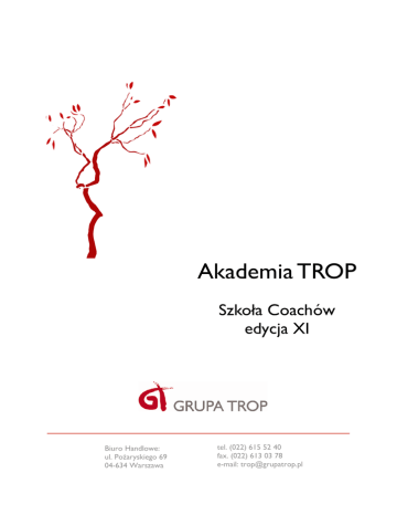 Akademia TROP Szkoła Coachów edycja XI Biuro Handlowe: ul. PoŜaryskiego 69 04-634 Warszawa /AKADEMIA TROP tel. (022) 615 52 40 fax. (022) 613 03 78 e-mail: [email protected] 1 AKADEMIA TROP Akademia TROP to Szkoła Trenerów Biznesu, Szkoła Trenerów Zaawansowanych, Szkoła Coachów, Szkoła Liderów oraz Szkoła Treningu Interpersonalnego. W Akademii TROP wyszkoliliśmy juŜ blisko 1000 trenerów, 110 coachów i 15 liderów, z których większość czynnie działa w zawodzie trenera, coacha, lidera zmiany lub w inny sposób wykorzystuje nabyte umiejętności (np. zarządzanie firmami, zespołami, projektami). W Akademii TROP łączymy naukę w grupach szkoleniowych z indywidualną opieka merytoryczną uczestników poszczególnych Szkół. Nasze szkoły mają najbogatszy program, zawierają największą liczbę godzin dydaktycznych. Są najstarsze na rynku, mają ugruntowane korzenie, ale jednocześnie są prekursorami innowacji w szkoleniach. Jesteśmy wyczuleni na zmiany zachodzące w biznesie, dlatego zajęcia w szkołach ulegają ciągłym modyfikacjom. Programy dostosowujemy do aktualnej sytuacji na rynku. Akademia TROP to teŜ rozwój trenerów, coachów i liderów w programach długoterminowych, takich jak System Certyfikacyjny (Indywidualne Programy Rozwoju), autorski Cykl Superwizyjno - Coachingowy czy Instytut TROP. Akademia TROP to teŜ aktywne budowanie i rozwijanie środowiska, działamy we współpracy i pod nadzorem merytorycznym Polskiego Towarzystwa Psychologicznego. Jesteśmy członkiem załoŜycielem Polskiej Izby Firm Szkoleniowych, działamy w komisjach PIFSu, takich jak: komisja coachingu i komisja ds. jakości usług szkoleniowych. Pracujemy zgodnie ze standardami zawodowymi wyznaczonymi przez Radę Trenerów Polskiego Towarzystwa Psychologicznego i Stowarzyszenie Trenerów Organizacji Pozarządowych, przygotowując absolwentów Szkoły Trenerów do uzyskania rekomendacji. Prowadzimy superwizje dla osób ubiegających się o rekomendacje TROP, PTP i STOP. ADRESACI OFERTY Naszą ofertę kierujemy do praktykujących trenerów, menedŜerów, coachów oraz osób, które planują w przyszłości rozpocząć pracę w tym zawodzie, zarówno w biznesie, w oświacie, jak i w organizacjach pozarządowych. Absolwenci naszych Szkół pracują w obszarach wynikających z ich predyspozycji i nieustannie się rozwijają. W gronie absolwentów naszej szkoły są: menedŜerowie organizacji uczących się trenerzy korporacyjni, trenerzy organizacji pozarządowych, przedsiębiorcy, freelanserzy, coachowie. • • • • • • ZAŁOśENIA PROGRAMOWE Naszym celem jest wykształcenie nowoczesnej kadry praktyków biznesu, pracującej na rzecz budowania tzw. organizacji uczących się. Przygotowujemy do stosowania unikalnych i skutecznych narzędzi pracy trenera, coacha i lidera. Wykorzystujemy do tego celu autorską, opracowaną przez nas metodę TROP (Trening Rozwoju Organizacji Przyszłości). Tworzymy środowisko, sprzyjające zdobywaniu nowych umiejętności, poszerzaniu horyzontów zawodowych i dzieleniu się doświadczeniami oraz wiedzą. Chcemy, aby nasi absolwenci mieli coraz większy wpływ na kształt rynku biznesowego. Program ukierunkowany jest na rozwój indywidualny trenerów, coachów i liderów oraz umiejętności pracy w oparciu o procesy: grupowy, indywidualny i organizacyjny, dzięki czemu absolwent Akademii TROP moŜe nie tylko skutecznie uczyć, ale równieŜ wprowadzać zmiany kulturowe. Budujemy system certyfikacji i referencji oparty o ciągłe uczenie się i opiekę superwizyjną. Podstawami procesu uczenia się są indywidualne ścieŜki rozwoju kaŜdego uczestnika. /AKADEMIA TROP 2 CERTYFIKACJE TROP 1. Certyfikat dotyczy posługiwania się Metodą TROP i wydawany jest przez Radę Akademii TROP 2. Certyfikaty TROP dotyczą trzech rodzajów umiejętności (specjalizacje) związanych z trzema typami oddziaływań, przy czym kaŜdy z nich ma trzy stopnie zaawansowania. • Praca z osobą (coach) - coaching • Praca z grupą (trener) - trenerstwo • Praca z organizacją (lider rozwoju kultury organizacyjnej) - liderstwo PoniewaŜ pełna Metoda TROP zakłada łączenie powyŜszych umiejętności, to osoby, które uzyskują certyfikaty z zakresu coachingu, treningu grupowego i liderstwa na określonym poziomie zaawansowania automatycznie otrzymują certyfikat Specjalisty w Zakresie Pracy Metodą TROP. 3. Certyfikaty są przyznawane na 3 lata 4. Warunkiem przyznawania i przedłuŜania certyfikatów jest wykazanie się konkretnymi, określonymi w wymogach na poszczególne stopnie certyfikacyjne osiągnięciami, a takŜe uczestnictwo w Szkoleniu Własnym, którego forma obejmować powinna zarówno działania opisane w wymogach dla poszczególnych stopni, jak teŜ działania podejmowane z własnej inicjatywy, omówione z Opiekunem Indywidualnym. 5. Szkolenie własne moŜe odbywać się poprzez: • coaching • uczestnictwo w Kursach Regularnych Akademii TROP • Kursach Nieregularnych Akademii TROP (np. System Superwizyjno - Coachingowy) • innych Kursach Uznanych przez Radę Akademii na wniosek Opiekuna Indywidualnego lub w przypadku kandydatów na superwizorów bezpośrednio przez Radę Akademii 6. System certyfikacji jest skoordynowany z wymogami Polskiej Izby Firm Szkoleniowych oraz Polskiego Towarzystwa Psychologicznego i Stowarzyszenia Trenerów Organizacji Pozarządowych tak, aby osoby uzyskując certyfikat TROP, miały ułatwione uzyskiwanie certyfikatów tych organizacji. Poziom Bazowy I II III Certyfikacja Coachingowa Certyfikacja Trenerska Certyfikacja Liderska Specjalista Metody Coach Certyfikowany w Zakresie Pracy Metodą TROP Trener Certyfikowany w Zakresie Pracy Metodą TROP Coach Certyfikowany w Zakresie Pracy Metodą TROP Trener Certyfikowany w Zakresie Pracy Metodą TROP Lider Projektów Rozwoju Kultury Organizacyjnej Certyfikowany w Zakresie Pracy Metodą TROP Specjalista Certyfikowany w Zakresie Pracy Metodą Senior Coach Certyfikowany w Za