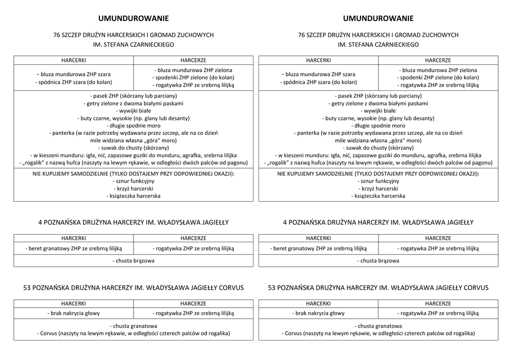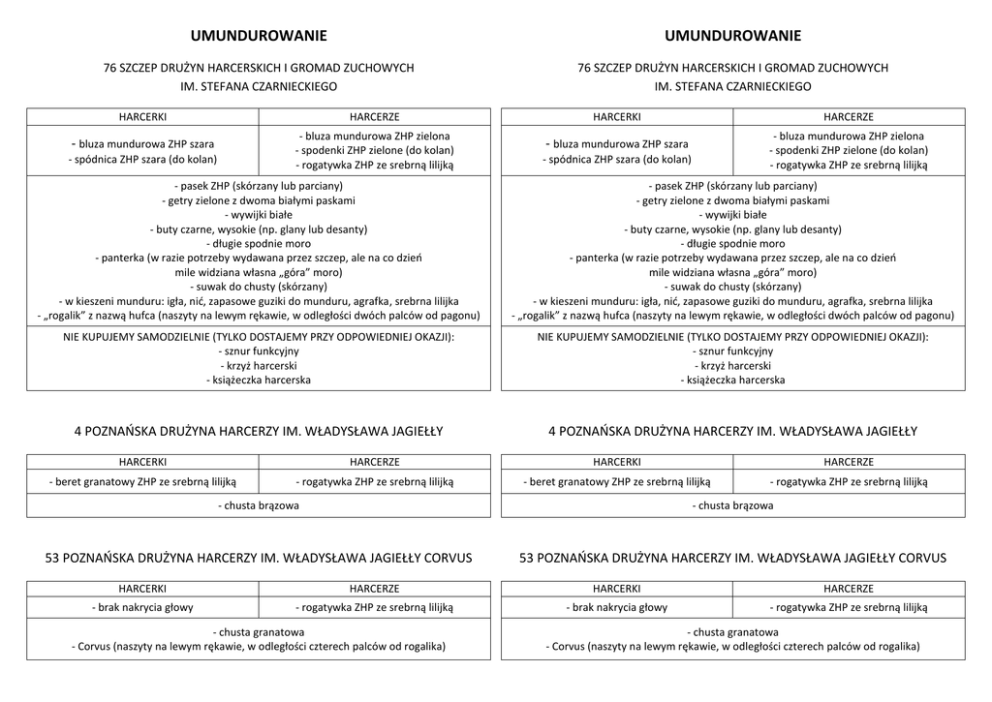 UMUNDUROWANIE UMUNDUROWANIE 76 SZCZEP DRUŻYN HARCERSKICH I GROMAD ZUCHOWYCH IM. STEFANA CZARNIECKIEGO 76 SZCZEP DRUŻYN HARCERSKICH I GROMAD ZUCHOWYCH IM. STEFANA CZARNIECKIEGO HARCERKI HARCERZE - bluza mundurowa ZHP zielona - spodenki ZHP zielone (do kolan) - rogatywka ZHP ze srebrną lilijką - bluza mundurowa ZHP szara - spódnica ZHP szara (do kolan) HARCERKI HARCERZE - bluza mundurowa ZHP zielona - spodenki ZHP zielone (do kolan) - rogatywka ZHP ze srebrną lilijką - bluza mundurowa ZHP szara - spódnica ZHP szara (do kolan) - pasek ZHP (skórzany lub parciany) - getry zielone z dwoma białymi paskami - wywijki białe - buty czarne, wysokie (np. glany lub desanty) - długie spodnie moro - panterka (w razie potrzeby wydawana przez szczep, ale na co dzieo mile widziana własna „góra” moro) - suwak do chusty (skórzany) - w kieszeni munduru: igła, nid, zapasowe guziki do munduru, agrafka, srebrna lilijka - „rogalik” z nazwą hufca (naszyty na lewym rękawie, w odległości dwóch palców od pagonu) - pasek ZHP (skórzany lub parciany) - getry zielone z dwoma białymi paskami - wywijki białe - buty czarne, wysokie (np. glany lub desanty) - długie spodnie moro - panterka (w razie potrzeby wydawana przez szczep, ale na co dzieo mile widziana własna „góra” moro) - suwak do chusty (skórzany) - w kieszeni munduru: igła, nid, zapasowe guziki do munduru, agrafka, srebrna lilijka - „rogalik” z nazwą hufca (naszyty na lewym rękawie, w odległości dwóch palców od pagonu) NIE KUPUJEMY SAMODZIELNIE (TYLKO DOSTAJEMY PRZY ODPOWIEDNIEJ OKAZJI): - sznur funkcyjny - krzyż harcerski - książeczka harcerska NIE KUPUJEMY SAMODZIELNIE (TYLKO DOSTAJEMY PRZY ODPOWIEDNIEJ OKAZJI): - sznur funkcyjny - krzyż harcerski - książeczka harcerska 4 POZNAOSKA DRUŻYNA HARCERZY IM. WŁADYSŁAWA JAGIEŁŁY 4 POZNAOSKA DRUŻYNA HARCERZY IM. WŁADYSŁAWA JAGIEŁŁY HARCERKI HARCERZE HARCERKI HARCERZE - beret granatowy ZHP ze srebrną lilijką - rogatywka ZHP ze srebrną lilijką - beret granatowy ZHP ze srebrną lilijką - rogatywka ZHP ze srebrną lilijką - chusta brązowa - chusta brązowa 53 POZNAOSKA DRUŻYNA HARCERZY IM. WŁADYSŁAWA JAGIEŁŁY CORVUS 53 POZNAOSKA DRUŻYNA HARCERZY IM. WŁADYSŁAWA JAGIEŁŁY CORVUS HARCERKI HARCERZE HARCERKI HARCERZE - brak nakrycia głowy - rogatywka ZHP ze srebrną lilijką - brak nakrycia głowy - rogatywka ZHP ze srebrną lilijką - chusta granatowa - Corvus (naszyty na lewym rękawie, w odległości czterech palców od rogalika) - chusta granatowa - Corvus (naszyty na lewym rękawie, w odległości czterech palców od rogalika)