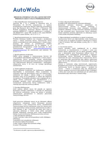 AutoWola BROSZURA INFORMACYJNA DLA KONSUMENTÓW SPRZEDAŻ CZĘŚCI I USŁUG POSPRZEDAŻNYCH 1. Dane identyfikacyjne Autoryzowanego Serwisu: Autowola Sp. z o.o z siedzibą w Warszawie przy ul. Połczyńskiej 10 (01-378) zarejestrowany w rejestrze przedsiębiorców Krajowego Rejestru Sądowego prowadzonym przez Sąd Rejonowy dla m.st Warszawy w Warszawie, XIII Wydział Gospodarczy Krajowego Rejestru Sądowego, pod numerem 0000092147, o kapitale zakładowym w wysokości 3 284 600,00 PLN1, numer NIP: 522-00-12-195, numer REGON: 010385239, numer telefonu +48 22 533 11 11 . 7) wykaz załączonych dokumentów; 8) podpis osoby uprawnionej do wniesienia reklamacji. Konsument powinien dostarczyć pojazd/rzecz do Autoryzowanego Serwisu, w terminie ustalonym z Autoryzowanym Serwisem, celem dokonania weryfikacji zasadności reklamacji. Za datę wniesienia reklamacji przyjmuje się datę otrzymania przez Autoryzowany Serwis reklamacji. Termin udzielenia pisemnej odpowiedzi na reklamację wynosi 14 dni od dnia otrzymania reklamacji. 2. Sposób porozumiewania się z Autoryzowanym Serwisem. Wszelkie informacje handlowe oraz związane z przedmiotem umowy i samym zawarciem umowy Autoryzowany Serwis udziela za pośrednictwem osób zatrudnionych, w formie ustnej i pisemnej, jak również za pośrednictwem środków indywidualnego porozumiewania się na odległość, tj. za pośrednictwem korespondencji e-mail kierowanej na adres Autoryzowanego Serwisu: [email protected], [email protected] lub telefonicznie, pod numerem +48 22 533 11 11. 6. Odpowiedzialność przedsiębiorcy za jakość świadczenia. Autoryzowany Serwis jest odpowiedzialny wobec Konsumenta za wady rzeczy na zasadach szczegółowo określonych w ustawie z dnia 23 kwietnia 1964 roku Kodeks cywilny (Dz. U. z 2014 poz. 121). 3. Sposób spełnienia świadczenia. Odbiór rzeczy następuje w Autoryzowanym Serwisie lub w przypadkach indywidualnie uzgodnionych w innym miejscu. Autoryzowany Serwis przygotuje warunki umożliwiające dokonanie przez Konsumenta sprawdzenia jakości, kompletności oraz funkcjonowania głównych mechanizmów i podzespołów zakupywanej rzeczy, o ile rzecz nie wymaga uprzedniego zamontowania. 4. Termin spełnienia świadczenia. Termin spełnienia świadczenia jest każdorazowo uzgadniany indywidualnie z Konsumentem. Okres oczekiwania na wykonanie usługi lub sprowadzenie części jest zróżnicowany i uzależniony do rodzaju i zakresu usługi, a w przypadku sprzedaży części od jej dostępności w salonie lub magazynie zewnętrznym. W przypadku sprzedaży części znajdujących się w salonie umowa wykonywana jest natychmiastowo, a w przypadku sprzedaży części sprowadzonych z magazynów zewnętrznych Autoryzowany Serwis każdorazowo ustala i wskazuje przewidywany termin jej odbioru. 5. Procedura Reklamacyjna Jeżeli podczas odbioru rzeczy lub pojazdu po naprawie Konsument stwierdzi rozbieżności w stosunku do zamówienia lub widoczne uszkodzenia, zostaną one opisane w protokole reklamacyjnym sporządzonym w obecności pracownika Autoryzowanego Serwisu. Jeżeli przyczyna reklamacji ujawni się po dokonaniu odbioru usługi/rzeczy (zakupionej części) Konsument powinien poinformować o niej Autoryzowany Serwis. Zawiadomienie Autoryzowanego Serwisu (reklamacja) winno być złożone przez osobę uprawnioną w formie pisemnej, elektronicznej (na adres email wskazany w pkt. 2 powyżej) lub ustnej, przy czym ze zgłoszenia reklamacji w formie ustnej należy sporządzić protokół. Reklamację wniesioną przez osobę nieuprawnioną, traktuje się jak niewniesioną. Reklamacja powinna zawierać: 1) datę sporządzenia reklamacji; 2) imię i nazwisko i adres do korespondencji osoby składającej reklamację; 3) przedmiot oraz uzasadnienie reklamacji; 4) wskazanie żądania Konsumenta; 5) datę i miejsce zakupu lup wykonania usługi; 6) numer VIN pojazdu; 1 W odniesieniu do spółki z ograniczoną odpowiedzialnością 7. Czas trwania umowy. Umowy sprzedaży części znajdujących się w salonie wykonywane są natychmiastowo, w związku z czym czas trwania umowy ograniczony jest do okresu pomiędzy zapłatą ceny a dokonaniem przez Konsumenta odbioru rzeczy. W przypadku części wymagających sprowadzenia z magazynu zewnętrznego, umowa obowiązuje od momentu złożenia zamówienia do czasu wskazanego przez Autoryzowany Serwis na zamówieniu jako przewidywana data odbioru zamówionej części lub do dnia dokonania przez Konsumenta faktycznego odbioru rzeczy. Umowy o wykonanie usług (serwisowych, naprawczych, przeglądowych) trwają do dnia każdorazowo wskazanego przez Autoryzowany Serwis na zleceniu naprawy / przyjęciu do serwisu. Umowy o świadczenie usług (np. ubezpieczenia, ochrony, programy serwisowe) obowiązują na okres wynikający z oferty, przy czym okres ten uzależniony jest od wyboru przez Konsumenta opcji oferowanej w ramach usługi.
