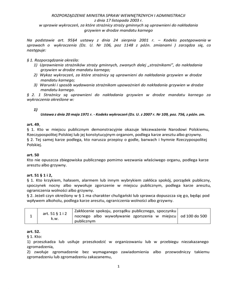 ROZPORZĄDZENIE MINISTRA SPRAW WEWNĘTRZNYCH I ADMINISTRACJI z dnia 17 listopada 2003 r. w sprawie wykroczeń, za które strażnicy straży gminnych są uprawnieni do nakładania grzywien w drodze mandatu karnego Na podstawie art. 95§4 ustawy z dnia 24 sierpnia 2001 r. – Kodeks postępowania w sprawach o wykroczenia (Dz. U. Nr 106, poz 1148 z późn. zmianami ) zarządza się, co następuje: § 1. Rozporządzanie określa: 1) Uprawnienia strażników straży gminnych, zwanych dalej „strażnikami”, do nakładania grzywien w drodze mandatu karnego; 2) Wykaz wykroczeń, za które strażnicy są uprawnieni do nakładania grzywien w drodze mandatu karnego; 3) Warunki i sposób wydawania strażnikom upoważnień do nakładania grzywien w drodze mandatu karnego. § 2. 1 Strażnicy są uprawnieni do nakładania grzywien w drodze mandatu karnego za wykroczenia określone w: 1) Ustawa z dnia 20 maja 1971 r. - Kodeks wykroczeń (Dz. U. z 2007 r. Nr 109, poz. 756, z późn. zm. art. 49, § 1. Kto w miejscu publicznym demonstracyjnie okazuje lekceważenie Narodowi Polskiemu, Rzeczypospolitej Polskiej lub jej konstytucyjnym organom, podlega karze aresztu albo grzywny. § 2. Tej samej karze podlega, kto narusza przepisy o godle, barwach i hymnie Rzeczypospolitej Polskiej. art. 50 Kto nie opuszcza zbiegowiska publicznego pomimo wezwania właściwego organu, podlega karze aresztu albo grzywny. art. 51 § 1 i 2, § 1. Kto krzykiem, hałasem, alarmem lub innym wybrykiem zakłóca spokój, porządek publiczny, spoczynek nocny albo wywołuje zgorszenie w miejscu publicznym, podlega karze aresztu, ograniczenia wolności albo grzywny. § 2. Jeżeli czyn określony w § 1 ma charakter chuligański lub sprawca dopuszcza się g o, będąc pod wpływem alkoholu, podlega karze aresztu, ograniczenia wolności albo grzywny. 1 art. 51 § 1 i 2 k.w. Zakłócenie spokoju, porządku publicznego, spoczynku nocnego albo wywoływanie zgorszenia w miejscu od 100 do 500 publicznym art. 52. § 1. Kto: 1) przeszkadza lub usiłuje przeszkodzić w organizowaniu lub w przebiegu niezakazanego zgromadzenia, 2) zwołuje zgromadzenie bez wymaganego zawiadomienia albo przewodniczy takiemu zgromadzeniu lub zgromadzeniu zakazanemu, 1 3) przewodniczy zgromadzeniu po rozwiązaniu go przez przewodniczącego lub przedstawiciela organu gminy, 4) bezprawnie zajmuje lub wzbrania się opuścić miejsce, którym inna osoba lub organizacja prawnie rozporządza jako zwołujący lub przewodniczący zgromadzenia, art. 54, Kto wykracza przeciwko wydanym z upoważnienia ustawy przepisom porządkowym o zachowaniu się w miejscach publicznych, podlega karze grzywny do 500 złotych albo karze nagany. art. 55, Kto kąpie się w miejscu, w którym jest to zabronione, podlega karze grzywny do 250 złotych albo karze nagany. art. 56 § 1, Kto bez wymaganego zezwolenia lub wbrew jego warunkom organizuje lub przeprowadza publiczną zbiórkę ofiar, podlega karze grzywny. art. 58 § 1, § 1. Kto, mając środki egzystencji lub będąc zdolny do pracy, żebrze w miejscu publicznym, podlega karze ograniczenia wolności, grzywny do 1 500 złotych albo karze nagany. art. 601 § 1 – 3 i § 4 pkt. 1, art. 601. § 1. Kto wykonuje działalność gospodarczą bez wymaganego zgłoszenia do ewidencji działalności gospodarczej, wpisu do rejestru działalności regulowanej lub bez wymaganej koncesji albo zezwolenia, podlega karze ograniczenia wolności albo grzywny. § 2. Tej samej karze podlega, kto nie dopełnia obowiązku zgłaszania do ewidencji działalności gospodarczej zmian danych objętych wpisem. § 3. Kto będąc przedsiębiorcą wprowadza do obrotu towar bez wymaganych oznaczeń, podlega karze grzywny. § 4. Kto: 1) wykonuje bez wymaganych uprawnień zadania przewodnika turystycznego lub pilota wycieczek, art. 603§1, § 1. Kto prowadzi sprzedaż na terenie należącym do gminy lub będącym w jej zarządzie poza miejscem do tego wyznaczonym przez właściwe organy gminy, podlega karze grzywny. art. 63a § 1, § 1. Kto umieszcza w miejscu publicznym do tego nieprzeznaczonym ogłoszenie, plakat, afisz, apel, ulotkę, napis lub rysunek albo wystawia je na widok publiczny w innym miejscu bez zgody zarządzającego tym miejscem, podlega karze ograniczenia wolności albo grzywny. art. 64, § 1. Kto, będąc właścicielem, administratorem, dozorcą lub użytkownikiem nieruchomości, nie dopełnia obowiązku umieszczenia w odpowiednim miejscu albo utrzymania w należytym stanie tabliczki z numerem porządkowym nieruchomości, nazwą ulicy lub placu albo miejscowości, podlega karze grzywny do 250 złotych albo karze nagany. § 2. Tej samej karze podlega, kto nie dopełnia obowiązku oświetlenia tabliczki z numerem porządkowym nieruchomości. 2 2 art. 64 § 1 k.w. Nieumieszczenie przez właściciela, administratora, dozorcę lub użytkownika nieruchomości tabliczki z numerem porządkowym nieruchomości, nazwą ulicy lub placu albo miejscowości 100 art. 65 § 1. Kto umyślnie wprowadza w błąd organ państwowy lub instytucję upoważnioną z mocy ustawy do legitymowania: 1) co do tożsamości własnej lub innej osoby, 2) co do swego obywatelstwa, zawodu, miejsca zatrudnienia lub zamieszkania, podlega karze grzywny. § 2. Tej samej karze podlega, kto wbrew obowiązkowi nie udziela właściwemu organowi państwowemu lub instytucji, upoważnionej z mocy ustawy do legitymowania, wiadomości lub dokumentów co do okoliczności wymienionych w § 1. 3 art. 65 § 1 i 2 k.w. Umyślne wprowadzenie w błąd co do danych osobowych organu państwowego lub instytucji upoważnionej do legitymowania od 200 do 500 art. 66§1 § 1. Kto ze złośliwości lub swawoli, chcąc wywołać niepotrzebną czynność fałszywym alarmem, informacją lub innym sposobem, wprowadza w błąd instytucję użyteczności publicznej albo inny organ ochrony bezpieczeństwa, porządku publicznego lub zdrowia, podlega karze aresztu, ograniczenia wolności albo grzywny do 1 500 złotych. art. 6