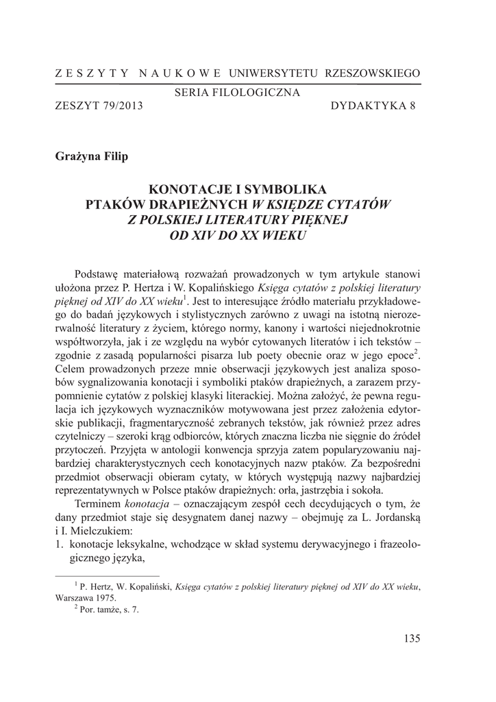 Z E S Z Y T Y N A U K O W E UNIWERSYTETU RZESZOWSKIEGO SERIA FILOLOGICZNA ZESZYT 79/2013 DYDAKTYKA 8 Grażyna Filip KONOTACJE I SYMBOLIKA PTAKÓW DRAPIEŻNYCH W KSIĘDZE CYTATÓW Z POLSKIEJ LITERATURY PIĘKNEJ OD XIV DO XX WIEKU Podstawę materiałową rozważań prowadzonych w tym artykule stanowi ułożona przez P. Hertza i W. Kopalińskiego Księga cytatów z polskiej literatury pięknej od XIV do XX wieku1. Jest to interesujące źródło materiału przykładowego do badań językowych i stylistycznych zarówno z uwagi na istotną nierozerwalność literatury z życiem, którego normy, kanony i wartości niejednokrotnie współtworzyła, jak i ze względu na wybór cytowanych literatów i ich tekstów – zgodnie z zasadą popularności pisarza lub poety obecnie oraz w jego epoce2. Celem prowadzonych przeze mnie obserwacji językowych jest analiza sposobów sygnalizowania konotacji i symboliki ptaków drapieżnych, a zarazem przypomnienie cytatów z polskiej klasyki literackiej. Można założyć, że pewna regulacja ich językowych wyznaczników motywowana jest przez założenia edytorskie publikacji, fragmentaryczność zebranych tekstów, jak również przez adres czytelniczy – szeroki krąg odbiorców, których znaczna liczba nie sięgnie do źródeł przytoczeń. Przyjęta w antologii konwencja sprzyja zatem popularyzowaniu najbardziej charakterystycznych cech konotacyjnych nazw ptaków. Za bezpośredni przedmiot obserwacji obieram cytaty, w których występują nazwy najbardziej reprezentatywnych w Polsce ptaków drapieżnych: orła, jastrzębia i sokoła. Terminem konotacja – oznaczającym zespół cech decydujących o tym, że dany przedmiot staje się desygnatem danej nazwy – obejmuję za L. Jordanską i I. Mielczukiem: 1. konotacje leksykalne, wchodzące w skład systemu derywacyjnego i frazeologicznego języka, 1 P. Hertz, W. Kopaliński, Księga cytatów z polskiej literatury pięknej od XIV do XX wieku, Warszawa 1975. 2 Por. tamże, s. 7. 135 2. konotacje encyklopedyczne, składające się na wspólną nadawcy i odbiorcy wiedzę o świecie, których znajomość umożliwia swobodne tworzenie metafor i porównań nieskodyfikowanych w języku3. Zgodnie z definicją zamieszczoną w słowniku ogólnym języka polskiego desygnatem nazwy ptak jest ‘zwierzę kręgowe z gromady o tej samej nazwie’, a wśród kontekstów znaczeniowych tego rzeczownika wymienienia się: ptaki dziki, hodowane, drapieżne, śpiewające oraz ptaki łowcze, m.in. sokoły i jastrzębie – przyuczone do polowania na inne ptaki. Na leksemie ptak oparte są również związki frazeologiczne i przysłowia: 1. niebieski ptak – frazeologizm oznaczający człowieka lekkomyślnego, nieodpowiedzialnego, niemającego określonego zajęcia, żyjącego cudzym kosztem; próżniaka, darmozjada; 2. oglądać coś z lotu ptaka, czyli z góry, tak jak się widzi z góry; 3. przysłowie: zły to ptak, co własne gniazdo kala (SJP 1988 II, s. 1073). Przykładem satyrycznej polemiki z przytoczonym przysłowiem, czasami jeszcze współcześnie przypominanym (np. w debatach sejmowych) jest zamieszczony właśnie w antologii P. Hertza i W. Kopalińskiego fragment poezji C. Norwida: Czy ten ptak kala gniazdo, co je kala, Czy ten, co mówić o tym nie pozwala? (C. Norwid KC, s. 337) Z kolei przymiotnik derywowany od rzeczownika ptak, ptasi ‘właściwy ptakowi, należący do ptaka, podobny do ptaka’ stał się podstawą dwóch odnotowanych w słowniku, a zatem funkcjonujących w polszczyźnie frazeologizmów: brakuje komuś tylko ptasiego mleka ‘ktoś żyje w dobrobycie, ma wszystko, czego zapragnie’ oraz ptasi móżdżek ‘umysł ciasny, ograniczony, płytki, pozbawiony szerokich horyzontów’ (SJP 1988 II, s. 1073). Należy zauważyć, że przytoczone wyżej spetryfikowane konstrukcje, odnoszące się do nazwy ogólnej ptak, mają w większości wartościowanie negatywne. Jest to wyraz ogólnej tendencji antropocentrycznej w języku, postawy człowieka wobec świata oraz usytuowania człowieka w świecie, zgodnie z czym we frazeologii i metaforyce odzwierzęcej, poza nielicznymi przykładami o pozytywnym ładunku emocjonalnym, przeważa wartościowanie negatywne. R. Tokarski odnosi tę prawidłowość zarówno do nazwy rodzajowej zwierzę, jak i do po4 szczególnych nazw gatunkowych . Należy jednak dodać, że tendencja ta wyka3 L. Jordanska, I. Mielczuk, Konotacja w semantyce lingwistycznej i leksykografii [w:] Konotacja, red. J. Bartmiński, Lublin 1988, s. 9–34. 4 R. Tokarski, Wartościowanie człowieka w metaforach językowych, „Pamiętnik Literacki” 1991, R. LXXX, z. 1, s. 144–151. Antropocentryczna tendencja do negatywnego wartościowanie świata zwierzęcego, metaforyka odzwierzęca oraz opozycja człowiek – zwierzę stanowi przedmiot wielu publikacji, spośród których wymienić można artykuły zebrane w tomie 15. serii „Język a Kultura”, Opozycja homo – animal w języku i kulturze, red. A. Dąbrowska, Wrocław 2003. 136 zuje swoistą specjalizację waloryzowania, ponieważ wartościowanie negatywne i często obraźliwe dotyczy przede wszystkim zwierząt domowych, hodowlanych, natomiast zwierzęta dzikie, w tym ptaki drapieżne często mają konotacje pozytywne. Zwraca na to uwagę H. Satkiewicz5, która zróżnicowane w ten sposób wartościowanie ptaków przez człowieka uzależnia od rodzaju kontaktu łączącego ludzi z ptakami. Autorka pisze: „Ze zgromadzonego materiału wynika, że dla użytkownika polszczyzny «prawdziwy» ptak, to taki, który lata. Cecha ta zapewnia mu wolność i niezależność, a więc to, co dla człowieka stanowi jedną z największych wartości. […] Kojarzenie z ptakiem pojęcia wolności wpływa w szczególny sposób na stosunek człowieka do ptaków łowczych, tzn. tych spośród drapieżnych (jastrząb, krogulec, orzeł, sokół), które były układane do polowania na zwierzynę lub inne ptaki. Człowiek był tym, który ograniczał ich 