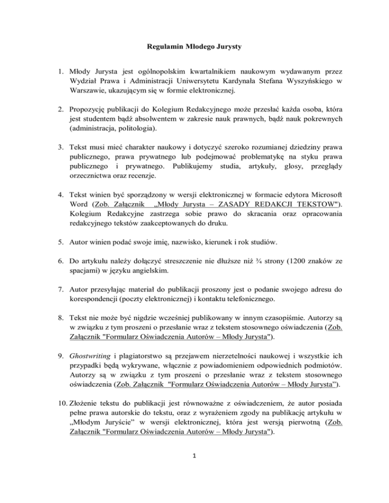 Regulamin Młodego Jurysty 1. Młody Jurysta jest ogólnopolskim kwartalnikiem naukowym wydawanym przez Wydział Prawa i Administracji Uniwersytetu Kardynała Stefana Wyszyńskiego w Warszawie, ukazującym się w formie elektronicznej. 2. Propozycję publikacji do Kolegium Redakcyjnego może przesłać każda osoba, która jest studentem bądź absolwentem w zakresie nauk prawnych, bądź nauk pokrewnych (administracja, politologia). 3. Tekst musi mieć charakter naukowy i dotyczyć szeroko rozumianej dziedziny prawa publicznego, prawa prywatnego lub podejmować problematykę na styku prawa publicznego i prywatnego. Publikujemy studia, artykuły, glosy, przeglądy orzecznictwa oraz recenzje. 4. Tekst winien być sporządzony w wersji elektronicznej w formacie edytora Microsoft Word (Zob. Załącznik „Młody Jurysta – ZASADY REDAKCJI TEKSTOW"). Kolegium Redakcyjne zastrzega sobie prawo do skracania oraz opracowania redakcyjnego tekstów zaakceptowanych do druku. 5. Autor winien podać swoje imię, nazwisko, kierunek i rok studiów. 6. Do artykułu należy dołączyć streszczenie nie dłuższe niż ¾ strony (1200 znaków ze spacjami) w języku angielskim. 7. Autor przesyłając materiał do publikacji proszony jest o podanie swojego adresu do korespondencji (poczty elektronicznej) i kontaktu telefonicznego. 8. Tekst nie może być nigdzie wcześniej publikowany w innym czasopiśmie. Autorzy są w związku z tym proszeni o przesłanie wraz z tekstem stosownego oświadczenia (Zob. Załącznik "Formularz Oświadczenia Autorów – Młody Jurysta"). 9. Ghostwriting i plagiatorstwo są przejawem nierzetelności naukowej i wszystkie ich przypadki będą wykrywane, włącznie z powiadomieniem odpowiednich podmiotów. Autorzy są w związku z tym proszeni o przesłanie wraz z tekstem stosownego oświadczenia (Zob. Załącznik "Formularz Oświadczenia Autorów – Młody Jurysta”). 10. Złożenie tekstu do publikacji jest równoważne z oświadczeniem, że autor posiada pełne prawa autorskie do tekstu, oraz z wyrażeniem zgody na publikację artykułu w „Młodym Juryście” w wersji elektronicznej, która jest wersją pierwotną (Zob. Załącznik "Formularz Oświadczenia Autorów – Młody Jurysta"). 1 11. Teksty należy przesyłać drogą elektroniczną na adres Kolegium Redakcyjnego: [email protected]. 12. Każdy tekst przechodzi procedurę recenzowania (Zob. Załącznik „Młody Jurysta – FORMULARZ RECENZJI"). Czas oczekiwania na decyzję wynosi maksymalnie miesiąc od złożenia tekstu. Po tym terminie autor otrzymuje odpowiedź, czy tekst zostanie opublikowany. Z uwagi na kwartalny cykl publikacji czasopisma czas oczekiwania na publikację może wynieść do 6 miesięcy – zależnie od charakteru opracowania i kolejki tekstów oczekujących na publikację. 13. Za publikację nie są wypłacane honoraria autorskie. 14. W przypadku tekstów, które mają kilku autorów, konieczne jest podanie procentowego udziału każdego współautora w powstaniu tekstu. 15. Pierwotną wersją czasopisma jest wersja polska. Zasady recenzowania czasopisma „Młody Jurysta” 1. Teksty nadsyłane do Kolegium Redakcyjnego są poddawane wstępnej ocenie przez Kolegium Redakcyjne składające się z trzech członków na czele z Przewodniczącym. Kolegium Redakcyjne przekaże wybrane artykuły Recenzentom. 2. Stosowany model recenzowania to tzw. recenzja obustronnie ślepa (double blind review), zgodnie z którym recenzenci i autorzy nie znają swoich tożsamości. 3. Nazwiska recenzentów poszczególnych publikacji nie są ujawnianie. 4. Kolegium Redakcyjne przekaże recenzentowi opis publikacji (tytuł, ilość znaków lub stron znormalizowanych) oraz streszczenie artykułu wraz z treścią artykułu oraz poprosi go o podjęcie w określonym terminie decyzji o przyjęciu lub odrzuceniu tekstu do recenzji. 5. Recenzenci są zobowiązani w trakcie procesu recenzowania do poufności w opiniach na temat recenzowanego artykułu oraz niewykorzystania zdobytej przy tej okazji wiedzy przed jego publikacją. 2 6. Kolegium Redakcyjne zlecając recenzencję, przekazuje recenzentowi formularz recenzji (Zob. Załącznik „Młody Jurysta – FORMULARZ RECENZJI”). 7. Opracowania przeznaczone do recenzji nie zawsze są przesyłane do recenzentów, których obszar zainteresowań badawczych jest identyczny z przedmiotem opracowania; dla dokonania konstruktywnej recenzji nie jest wymagana specjalizacja w dziedzinie, którą porusza nadesłane opracowanie; jeżeli recenzent stoi na stanowisku, że nie jest właściwy do oceny przekazanego do recenzji opracowania, proszony jest o jego niezwłoczne zwrócenie do Kolegium Redakcyjnego. 8. Ocena tekstu winna być dokonana wyłącznie w oparciu o przesłanki merytoryczne; krytycyzm mający swoje źródło w uprzedzeniach personalnych, bądź będący wynikiem przekonań światopoglądowych lub politycznych jest niedopuszczalny; jest to szczególnie istotne w obszarze szeroko rozumianego prawa publicznego, w którym istotną rolę, obok perspektywy normatywnej, odgrywa perspektywa ekonomiczna i polityczna. 9. Recenzent przekazuje sporządzoną recenzję w postaci elektronicznej do Przewodniczącego Kolegium Redakcyjnego e-mail: [email protected], podany na formularzu recenzji oraz w formie papierowej z odręcznym podpisem. 10. Wszelkie uwagi krytyczne lub negatywne winny być opatrzone wyczerpującym komentarzem; Kolegium Redakcyjne nie przyjmuje recenzji niespełniających merytorycznych lub formalnych wymagań, w tym pozbawionych logicznego powiązania między treścią a konkluzją, tj. recenzji zdecydowanie krytycznych, lecz z konkluzją pozytywną lub odwrotnie. 11. Uwagi recenzenta są przekazywane autorowi recenzowanego opracowania; racjonalne i motywowane konkluzje są dla niego wiążące i autor ma obowiązek uwzględnić zalecenia recenzentów i poprawić tekst; w przypadku, gdy autor opracowania nie zgadza się z konkluzjami recenzenta, ma prawo do przedsta