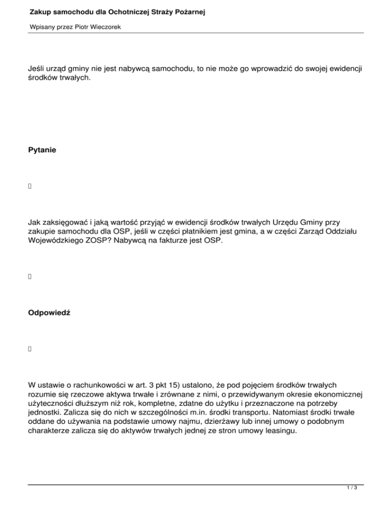 Zakup samochodu dla Ochotniczej Straży Pożarnej Wpisany przez Piotr Wieczorek Jeśli urząd gminy nie jest nabywcą samochodu, to nie może go wprowadzić do swojej ewidencji środków trwałych. Pytanie Jak zaksięgować i jaką wartość przyjąć w ewidencji środków trwałych Urzędu Gminy przy zakupie samochodu dla OSP, jeśli w części płatnikiem jest gmina, a w części Zarząd Oddziału Wojewódzkiego ZOSP? Nabywcą na fakturze jest OSP. Odpowiedź W ustawie o rachunkowości w art. 3 pkt 15) ustalono, że pod pojęciem środków trwałych rozumie się rzeczowe aktywa trwałe i zrównane z nimi, o przewidywanym okresie ekonomicznej użyteczności dłuższym niż rok, kompletne, zdatne do użytku i przeznaczone na potrzeby jednostki. Zalicza się do nich w szczególności m.in. środki transportu. Natomiast środki trwałe oddane do używania na podstawie umowy najmu, dzierżawy lub innej umowy o podobnym charakterze zalicza się do aktywów trwałych jednej ze stron umowy leasingu. 1/3 Zakup samochodu dla Ochotniczej Straży Pożarnej Wpisany przez Piotr Wieczorek Nabywcą środka trwałego jest Ochotnicza Straż Pożarna, zatem urząd gminy nie będzie wykorzystywał samochodu lecz stowarzyszenie, które zgodnie z art. 19 ustawy z 24.08.1991 r. o ochronie przeciwpożarowej (t.j. z 2002 r. Dz.U. Nr 147, poz. 1229 ze zm.) stanowi jednostkę ochrony przeciwpożarowej działającą w oparciu o ustawę Prawo o stowarzyszeniach, która ponadto jest odrębnym od urzędu podmiotem podatku od osób prawnych. Wyżej opisany wydatek powinien być zgodny z planem finansowym urzędu gminy (który powinien zostać opracowany na podstawie zadań ustalonych w statucie urzędu gminy - bowiem jednostki budżetowe mają działać zgodnie z art. 20 ust. 2 ustawy o finansach publicznych na podstawie statutu, w którym należy ustalić m.in. przedmiot działalności, który nie może obejmować działań gaśniczych) i powinien stanowić dotację celową na dofinansowanie zakupu samochodu dla OSP. Jak wynika z powyższego, urząd gminy nie może wpisać do swojej ewidencji środków trwałych pojazdu, który będzie wykorzystywany przez OSP, ponieważ dla urzędu samochód ten nie będzie środkiem trwałym. Dlatego nawet na jeden dzień nie może trafić do ewidencji w związku z tym, że nabywcą jest OSP. Oznacza to, że taka faktura, której stroną jest OSP, może zostać jedynie ujęta w ewidencji księgowej OSP. Wynika to m.in. z art. 4 ust. 2 ustawy o rachunkowości, w którym ustalono, że zdarzenia, w tym operacje gospodarcze, ujmuje się w księgach rachunkowych i wykazuje w sprawozdaniu finansowym zgodnie z ich treścią ekonomiczną. Oceniając tak wystawioną fakturę (nabywca OSP) zakupu dokonało stowarzyszenie, a nie urząd, który jedynie przekazał środki finansowe na dokonanie zakupu. 2/3 Zakup samochodu dla Ochotniczej Straży Pożarnej Wpisany przez Piotr Wieczorek Stąd płynie prosty wniosek: jeśli urząd nie jest nabywcą, to nie może wprowadzić takiego samochodu do swojej ewidencji środków trwałych, co wynika również z faktu, że taki samochód dla urzędu nie jest składnikiem majątku o przewidywanym okresie ekonomicznej użyteczności dłuższym niż rok, przeznaczonym na potrzeby jednostki, w tym przypadku jednostki budżetowej, jaką stanowi urząd. A zaksięgowanie takiej faktury w urzędzie gminy będzie niezgodne z treścią faktury (nabywcą jest OSP, a nie urząd) i art. 4 ust. 2 ustawy o rachunkowości. 3/3