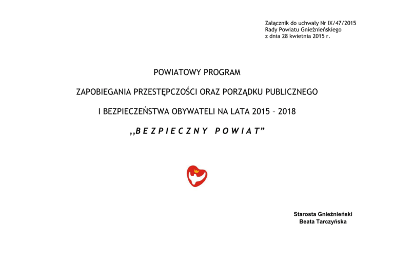 Załącznik do uchwały Nr IX/47/2015 Rady Powiatu Gnieźnieńskiego z dnia 28 kwietnia 2015 r. POWIATOWY PROGRAM ZAPOBIEGANIA PRZESTĘPCZOŚCI ORAZ PORZĄDKU PUBLICZNEGO I BEZPIECZEŃSTWA OBYWATELI NA LATA 2015 – 2018 ,,B E Z P I E C Z N Y P O W I A T” Starosta Gnieźnieński Beata Tarczyńska I. Założenia programu Do najważniejszych zadań organów administracji publicznej należy utrzymanie wysokiego poziomu ładu, porządku i bezpieczeństwa obywateli. Poczucie bezpieczeństwa to naczelne prawo każdego człowieka. Obowiązkiem państwa jest jego zapewnienie m.in. poprzez inicjowanie i organizowanie działań, mających na celu zapobieganie popełnianiu przestępstw i wykroczeń oraz przeciwdziałanie wszelkim zjawiskom kryminogennym. Przedsięwzięcia te wymagają szerokiego współdziałania administracji rządowej, samorządów i organizacji społecznych. Istotą programu jest koordynacja wysiłku społecznego dla realizacji celu nadrzędnego jakim jest wzrost poczucia bezpieczeństwa obywateli na terenie powiatu gnieźnieńskiego. Program opisuje kompleksowo działania w celu ograniczenia zjawisk i zachowań, które budzą powszechny sprzeciw i poczucie zagrożenia. Jest to zatem program pracy zespołowej na rzecz poprawy jakości życia pod względem bezpieczeństwa i zwiększenia dostępu do dobra publicznego, jakim jest bezpieczeństwo w powiecie gnieźnieńskim. W związku z koniecznością tworzenia warunków, w których wszystkie podmioty zainteresowane działają wspólnie i w sposób zorganizowany, opracowuje się POWIATOWY PROGRAM ZAPOBIEGANIA PRZESTĘPCZOŚCI ORAZ PORZĄDKU PUBLICZNEGO I BEZPIECZEŃSTWA OBYWATELI NA LATA 2015-2018 zwany „Bezpieczny Powiat”. Główne założenia programu to: 1. Realizacja przyjętych w programie zadań, które przyniosą korzyści mieszkańcom powiatu gnieźnieńskiego poprzez ograniczenie przestępczości, zjawisk patologicznych i innych zagrożeń a także obniżenie związanych z tym szkód społecznych. 2. Zintegrowanie na zasadach partnerstwa i włączenie w poprawę bezpieczeństwa publicznego jednostek państwowych, samorządowych oraz powiatowych służb, inspekcji, straży, organizacji pozarządowych, środowisk lokalnych i innych podmiotów odpowiedzialnych za bezpieczeństwo i porządek publiczny na terenie powiatu gnieźnieńskiego 3. Realizacja umożliwi mieszkańcom powiatu aktywniejsze uczestnictwo w życiu społecznym, w tym reagowanie na zło i działania w kierunku poprawy bezpieczeństwa nas wszystkich oraz na propagowanie wśród mieszkańców określonych zachowań w sytuacjach wystąpienia zagrożeń. 4. Ze względu na duży zakres zadań wskazanych do realizacji oraz ich długofalowość, program ten należy traktować jako zadanie ciągłe, rozłożone na lata 2015-2018. Jednocześnie jest to program otwarty i dynamiczny, w związku z czym może być aktualizowany i przystosowany do zaistniałych potrzeb. 5. Finansowanie programu następuje z dostępnych środków budżetu powiatu, gmin, służb, inspekcji, straży, organizacji pozarządowych oraz innych funduszy celowych. 2 II. Cele programu Celem nadrzędnym POWIATOWEGO PROGRAMU ZAPOBIEGANIA PRZESTĘPCZOŚCI ORAZ PORZĄDKU PUBLICZNEGO I BEZPIECZEŃSTWA OBYWATELI NA LATA 2015-2018 jest wzrost poczucia bezpieczeństwa mieszkańców powiatu gnieźnieńskiego. Cele główne programu: 1. Poprawa stanu porządku i bezpieczeństwa na terenie powiatu gnieźnieńskiego. 2. Wzrost zaufania społecznego dla policji, straży, służb i instytucji działających na rzecz poprawy bezpieczeństwa i porządku publicznego. 3. Ograniczenie liczby przestępstw i wykroczeń szczególnie uciążliwych dla mieszkańców. 4. Wzrost poczucia bezpieczeństwa w miejscach publicznych i w miejscu zamieszkania. 5. Poprawa bezpieczeństwa w ruchu drogowym. 6. Wzrost bezpieczeństwa w szkołach i placówkach oświatowo-wychowawczych. 7. Przeciwdziałanie patologiom społecznym: alkoholizmowi, narkomanii, przemocy domowej. 8. Zapewnienie bezpieczeństwa i pomocy osobom najbardziej potrzebującym. 9. Poprawa bezpieczeństwa przed zagrożeniami, przeciwpożarowego i ratownictwa, poprawa bezpieczeństwa sanitarnoepidemiologicznego. 10. Przeciwdziałanie bezrobociu. 11. Zabezpieczenie infrastruktury powiatu. 12. Wspólne i skoordynowane działania samorządów lokalnych, policji, inspekcji, straży, organizacji pozarządowych, mieszkańców powiatu, mediów i innych podmiotów oraz instytucji w zakresie zapewnienia bezpieczeństwa publicznego. III. Wykonawcy programu Program realizowany jest przez Starostwo Powiatowe w Gnieźnie, powiatowe służby, straże i inspekcje oraz jednostki podległe. Do wykonawców należą; 1. Komenda Powiatowa Policji. 2. Komenda Powiatowa Państwowej straży Pożarnej. 3. Straż Miejska. 4. Powiatowa Stacja Sanitarno- Epidemiologiczna. 5. Powiatowy Inspektorat Weterynarii. 6. Powiatowy Urząd Pracy. 7. Powiatowe Centrum Pomocy Rodzinie. 8. Powiatowy Inspektorat Nadzoru Budowlanego. 9. Zespół Opieki Zdrowotnej. 10. Starostwo powiatowe. 3 IV. Partnerzy do współpracy przy realizacji programu Partnerami do współpracy programu są oprócz wymienionych wyżej jednostek, służb, straży i inspekcji także inne podmioty mające wpływ na poprawę bezpieczeństwa między innymi: urzędy miast i gmin powiatu gnieźnieńskiego, straż gminna w Niechanowie, Miejski Ośrodek Pomocy Społecznej, spółdzielnie mieszkaniowe, Inspekcja Transportu Drogowego, Państwowa Straż Rybacka, Straż Leśna, nadleśnictwa, firmy ubezpieczeniowe, agencje ochrony, zakłady pracy, Prokuratura Rejonowa, organizacje pozarządowe, redakcje wydawnictw lokalnych oraz telewizji lokalnej. V. Monitorowanie programu POWIATOWY PROGRAM ZAPOBIEGANIA PRZESTĘPCZOŚCI ORAZ PORZĄDKU PUBLICZNEGO I BEZPIECZEŃSTWA OBYWATELI NA LATA 2015-2018 realizowany jest poprzez różnego rodzaju zadania i programy. Wykonywane są one na bieżąco, w trybie ciągłym lub periodycznie. Program monitorowany 
