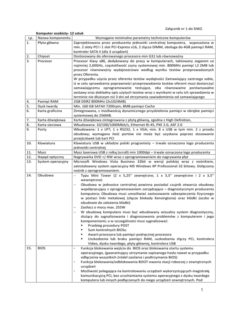 Załącznik nr 1 do SIWZ. Komputer osobisty- 12 sztuk Lp. Nazwa komponentu Wymagane minimalne parametry techniczne komputerów 1. Płyta główna Zaprojektowana przez producenta jednostki centralnej komputera, wyposażona w min. 2 sloty PCI i 1 slot PCI-Express x16, 2 złącza DIMM, obsługa do 4GB pamięci RAM, kontroler SATA II (dla 3 urządzeń) 2. Chipset Dostosowany do oferowanego procesora min G31 lub równoważny 3. Procesor Procesor klasy x86, dedykowany do pracy w komputerach, taktowany zegarem co najmniej 2,60GHz, częstotliwość szyny systemowej min. 800MHz pamięć L2 2MB lub procesor równoważny wydajnościowo według wyniku testów przeprowadzonych przez Oferenta. W przypadku użycia przez oferenta testów wydajności Zamawiający zastrzega sobie, iż w celu sprawdzenia poprawności przeprowadzenia testów oferent musi dostarczyć zamawiającemu oprogramowanie testujące, oba równoważne porównywalne zestawy oraz dokładny opis użytych testów wraz z wynikami w celu ich sprawdzenia w terminie nie dłuższym niż 3 dni od otrzymania zawiadomienia od zamawiającego 4. Pamięć RAM 2GB DDR2 800MHz (2x1024MB) 5. Dysk twardy Min. 160 GB SATAII 7200rpm, 8MB pamięci Cache 6. Karta graficzna Zintegrowana, z możliwością dynamicznego przydzielenia pamięci w obrębie pamięci systemowej do 256MB. 7. Karta dźwiękowa Karta dźwiękowa zintegrowana z płytą główną, zgodna z High Definition, 8. Karta sieciowa Wbudowana: 10/100/1000Mbit/s, Ethernet RJ 45, PXE 2.0, ASF 2.0 9. Porty Wbudowane: 1 x LPT; 1 x RS232, 1 x VGA; min. 8 x USB w tym min. 2 z przodu obudowy; wymagana ilość portów nie może być uzyskana poprzez stosowanie przejściówek lub kart PCI 10. Klawiatura Klawiatura USB w układzie polski programisty – trwale oznaczona logo producenta jednostki centralnej 11. Mysz Mysz laserowa USB z rolką (scroll) min 1000dpi – trwale oznaczona logo producenta 12. Napęd optyczny Nagrywarka DVD +/-RW wraz z oprogramowaniem do nagrywania płyt 13. System operacyjny Microsoft Windows Vista Business 32bit w wersji polskiej wraz z nośnikiem, zainstalowany system operacyjny MS Windows XP Professional 32 bitowy. Dołączony nośnik z oprogramowaniem. 14. Obudowa − Typu Mini Tower (2 x 5,25” zewnętrzne, 1 x 3,5” zewnętrzne i 2 x 3,5” wewnętrzne) − Obudowa w jednostce centralnej powinna posiadać czujnik otwarcia obudowy współpracujący z oprogramowaniem zarządzająco – diagnostycznym producenta komputera; Obudowa musi umożliwiać zastosowanie zabezpieczenia fizycznego w postaci linki metalowej (złącze blokady Kensingtona) oraz kłódki (oczko w obudowie do założenia kłódki) − Zasilacz o mocy max. 255W − W obudowę komputera musi być wbudowany wizualny system diagnostyczny, służący do sygnalizowania i diagnozowania problemów z komputerem i jego komponentami; a w szczególności musi sygnalizować: Przebieg procedury POST Sum kontrolnych BIOSu Awarii procesora lub pamięci podręcznej procesora Uszkodzenia lub braku pamięci RAM, uszkodzenia złączy PCI, kontrolera Video, dysku twardego, płyty głównej, kontrolera USB 15. BIOS - Funkcja blokowania wejścia do BIOS oraz blokowania startu systemu operacyjnego, (gwarantujący utrzymanie zapisanego hasła nawet w przypadku odłączenia wszystkich źródeł zasilania i podtrzymania BIOS) - Funkcja blokowania/odblokowania BOOT-owania stacji roboczej z zewnętrznych urządzeń - Możliwość polegająca na kontrolowaniu urządzeń wykorzystujących magistralę komunikacyjną PCI, bez uruchamiania systemu operacyjnego z dysku twardego komputera lub innych podłączonych do niego urządzeń zewnętrznych. Pod 1 - - - - - - 16. Certyfikaty i standardy − − − − − − pojęciem kontroli Zamawiający rozumie funkcjonalność polegającą na blokowaniu/odblokowaniu slotów PCI. Możliwość, bez uruchamiania systemu operacyjnego z dysku twardego komputera lub innych, podłączonych do niego urządzeń zewnętrznych, ustawienia hasła na poziomie systemu, administratora oraz dysku twardego oraz możliwość ustawienia następujących zależności pomiędzy nimi: brak możliwości zmiany hasła pozwalającego na uruchomienie systemu bez podania hasła administratora. Musi posiadać możliwość ustawienia zależności pomiędzy hasłem administratora a hasłem systemowy tak, aby nie było możliwe wprowadzenie zmian w BIOS wyłącznie po podaniu hasła systemowego. Funkcja ta ma wymuszać podanie hasła administratora przy próbie zmiany ustawień BIOS w sytuacji, gdy zostało podane hasło systemowe. Możliwość odczytania z BIOS, bez uruchamiania systemu operacyjnego z dysku twardego komputera lub innych, podłączonych do niego, urządzeń zewnętrznych , informacji na temat: zainstalowanego procesora, pamięci operacyjnej RAM wraz z informacją o obsadzeniu slotów pamięci, obsadzeniu slotów PCI. Możliwość włączenia/wyłączenia zintegrowanej karty dźwiękowej, karty sieciowej, portu równoległego, portu szeregowego z poziomu BIOS, bez uruchamiania systemu operacyjnego z dysku twardego komputera lub innych, podłączonych do niego, urządzeń zewnętrznych. Możliwość ustawienia portów USB w trybie „no BOOT”, czyli podczas startu komputer nie wykrywa urządzeń bootujących typu USB, natomiast po uruchomieniu systemu operacyjnego porty USB są aktywne. Możliwość wyłączania portów USB w tym: wszystkich portów, tylko portów znajdujących się na przodzie obudowy, tylko tylnich portów. Możliwość zmiany trybu pracy dysku twardego: na pracę zapewniającą największą wydajność, na pracę zmniejszającą poziom hałasu generowanego przez dysk twardy. Możliwość zablokowania zapisu na dyskietki Certyfikat ISO 9001:2000 dla producenta sprzętu (do oferty należy załączyć kopie certyfikatu potwierdzającą spełnianie wymogu) Certyfikat ISO 14001 dla producenta sprzętu (do oferty należy załączyć kopie certyfikatu potwierdzającą spełnianie wymogu) Oferowane