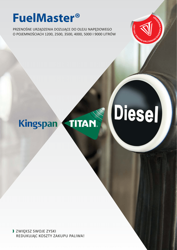 FuelMaster® YPU UDT AT NI IA POSIADA ZEN JĄ ĄD PRZENOŚNE URZĄDZENIA DOZUJĄCE DO OLEJU NAPĘDOWEGO O POJEMNOŚCIACH 1200, 2500, 3500, 4000, 5000 I 9000 LITRÓW UR Z ECTWO BA IAD DA ŚW ZWIĘKSZ SWOJE ZYSKI REDUKUJĄC KOSZTY ZAKUPU PALIWA! PRZENOŚNE URZĄDZENIA DOZUJĄCE DO OLEJU NAPĘDOWEGO KINGSPAN TITAN FuelMaster® KOMPLEKSOWA OFERTA DO MAGAZYNOWANIA I DYSTRYBUCJI OLEJU NAPĘDOWEGO MOŻLIWE ZASTOSOWANIE FuelMaster® jest doskonałym rozwiązaniem dla firm i osób prywatnych posiadających pojazdy z silnikami wysokoprężnymi, np. samochody, maszyny budowlane, wózki widłowe, traktory itd. Urządzenie FuelMaster® przeznaczone jest m.in. dla firm transportowych, kurierskich, budowlanych, firm obsługi budownictwa, producentów rolnych, działów logistyki (cywilnych i wojskowych), zakładów produkcyjnych, central dystrybucyjnych oraz magazynów. ZALETY Eliminuje konieczność tankowania na stacji paliw lub dowożenia paliwa w kanistrach. Wyższa jakość oleju napędowego poprzez wybór sprawdzonego dostawcy. Możliwość hurtowego zakupu paliwa w niższej cenie oraz ograniczenie kosztów operacyjnych i ilości faktur. Pełna kontrola ilości zatankowanego do pojazdów paliwa. Możliwość przechowywania paliwa na zewnątrz w bezpiecznej odległości od budynków, w estetycznym i neutralnym wizualnie dla otoczenia zbiorniku. Prosta obsługa gwarantująca łatwą i bezpieczną eksploatację, produkt nie wymaga szczególnych zabiegów konserwacyjnych. Ochrona przed dostępem osób niepowołanych dzięki zastosowaniu zamykanej obudowy dystrybutora chroniącej dystrybutor i króciec wlewowy. Doskonała ochrona przed przeciekiem i wydostawaniem się zapachu oleju na zewnątrz dzięki zastosowaniu dwupłaszczowej konstrukcji, odpornej na uszkodzenia mechaniczne. Wysoka odporność na ekstremalnie niskie i wysokie temperatury dzięki zastosowaniu najwyższej jakości polietylenu i nowoczesnej technologii produkcji. Trwały - nie koroduje, nie blaknie, odporny na promieniowanie słoneczne oraz UV. Łatwość transportu urządzenia przy pomocy, np. wózka widłowego lub dźwigu. Bogate wyposażenie standardowe zapewniające bezpieczeństwo i funkcjonalność, do wyboru wiele opcji wyposażenia. Certyfikat OFCERT, pozytywna opinia ppoż. i IOŚ., zatwierdzenie typu UDT. Wyprodukowane zgodnie z wymogami certyfikatu jakości BS EN ISO 9001:2008, nr FM 57348. Zbiorniki wewnętrzne FuelMaster® spełniają wymagania normy EN13341:2005+A1 i są oznakowane znakiem CE. Gwarancja na szczelność urządzenia 10 lat, na wyposażenie 2 lata. Gwarancja dotyczy wyrobu użytkowanego w sposób zgodny z instrukcją producenta. DOSTĘPNE POJEMNOŚCI I WYMIARY ość Now KOD PRODUKTU BFM01200DG/* Pojemność Długość Szerokość Wysokość 1200 l 1,90 m 1,24 m 1,79 m KOD PRODUKTU BFM02500DG/* Pojemność Długość Szerokość Wysokość 2500 l 2,46 m 1,46 m 1,85 m Wymiary produktów mogą się różnić w zakresie +/- 1%. * Końcówka kodu jest uzależniona od wyposażenia produktu. KOD PRODUKTU BFM03500DG/* Pojemność Długość Szerokość Wysokość 3500 l 2,85 m 2,20 m 1,96 m KOD PRODUKTU BFM04000DG/* Pojemność Długość Szerokość Wysokość 4000 l 3,90 m 1,20 m 2,34 m KOD PRODUKTU BFM05000DG/* Pojemność Długość Szerokość Wysokość 5000 l 2,85 m 2,23 m 2,34 m KOD PRODUKTU BFM09000DG/* Pojemność Długość Szerokość Wysokość 9000 l 3,28 m 2,45 m 2,95 m WYPOSAŻENIE STANDARDOWE Pojemność (litry) 1200 2500 3500 4000 5000 9000 Dystrybutor wyposażony w pompę elektryczną (230 V) o wydajności maks. 72 l/min.* Dystrybutor wyposażony w pompę elektryczną (230 V) o wydajności maks. 56 l/min.* Przepływomierz cyfrowy z dwufunkcyjnym wyświetlaczem z funkcją kalibracji. Zamykana na klucz obudowa zapewnia ochronę dystrybutora i przyłączy.** Bezprzewodowy czujnik aktualnego poziomu oleju z wyświetlaczem (WatchmanSonic Plus) ze zintegrowanym czujnikiem przecieku pomiędzy płaszczami. Elastyczny przewód zasysający z zaworem przeciwzwrotnym i filtrem siatkowym. Nalewak automatyczny, samozamykający z elastycznym przewodem dystrybucyjnym o dł. 4 m i kulowym zaworem odcinającym. Nalewak automatyczny, samozamykający z elastycznym przewodem dystrybucyjnym o dł. 6 m. Zaczep do podwieszania zwiniętego przewodu dystrybucyjnego. Zamykany właz dostępu 16” (w płaszczu zew.); dla 4000 l właz o wymiarach 75x115 cm. Króciec wlewowy 2” do napełniania urządzenia. Linia napełniająca z eurozłączem 2”, zaworem kulowym i mechanicznym zabezpieczeniem przed przepełnieniem (Spill-Stop). Pokrywa rewizyjna o średnicy 4” (w zbiorniku wew.); dla 4000 l pokrywa o średnicy 8”. Odpowietrznik umieszczony w zbiorniku wewnętrznym. Przyłącze uziemienia. WYPOSAŻENIE OPCJONALNE TuffMaster - metalowe zbrojenie ochronne dla zbiornika. 1 Pompa o maksymalnej wydajności 100 l/min.* Przewód dystrybucyjny do 12 m. Pompa zasilana napięciem 12 V lub 24 V. Oświetlenie obudowy dystrybutora. Filtr usuwający z paliwa wodę i zanieczyszczenia mechaniczne. Różne opcje przepływomierzy. Wyłącznik pompy w uchwycie nalewaka. Zwijadło przewodu dystrybucyjnego. Wewnętrzna rozdzielnia elektryczna. 2 1 TUFFMASTER - OPCJA ZBROJONA Tam, gdzie występuje podwyższona groźba uszkodzeń mechanicznych, istnieje możliwość zastosowania urządzenia FuelMaster® w metalowym zbrojeniu ochronnym. 2 ROZDZIELNIA WEWNĘTRZNA DO URZĄDZEŃ O POJEMNOŚCIACH 3500, 5000, 9000 LITRÓW. Bezpiecznik rożnicowo-prądowy 30 mA/25 A. Bezpiecznik nadmiarowo-prądowy 16 A. Wyłącznik główny z kluczem zabezpieczającym przed nieuprawnionym dostępem. Przełącznik oświetlenia obudowy dystrybutora. Cztery gniazda 230 V AC do zasilania pompy, odbiornika czujnika poziomu, lampy i urządzenia zewnętrznego. Puszka do podłączenia zasilania głównego. * ** Podane wartości przepływu są maks. przepływami podanymi przez producenta pomp. Rzeczywisty przepływ jest mniejszy i zależny od konfiguracji układu ssąco-