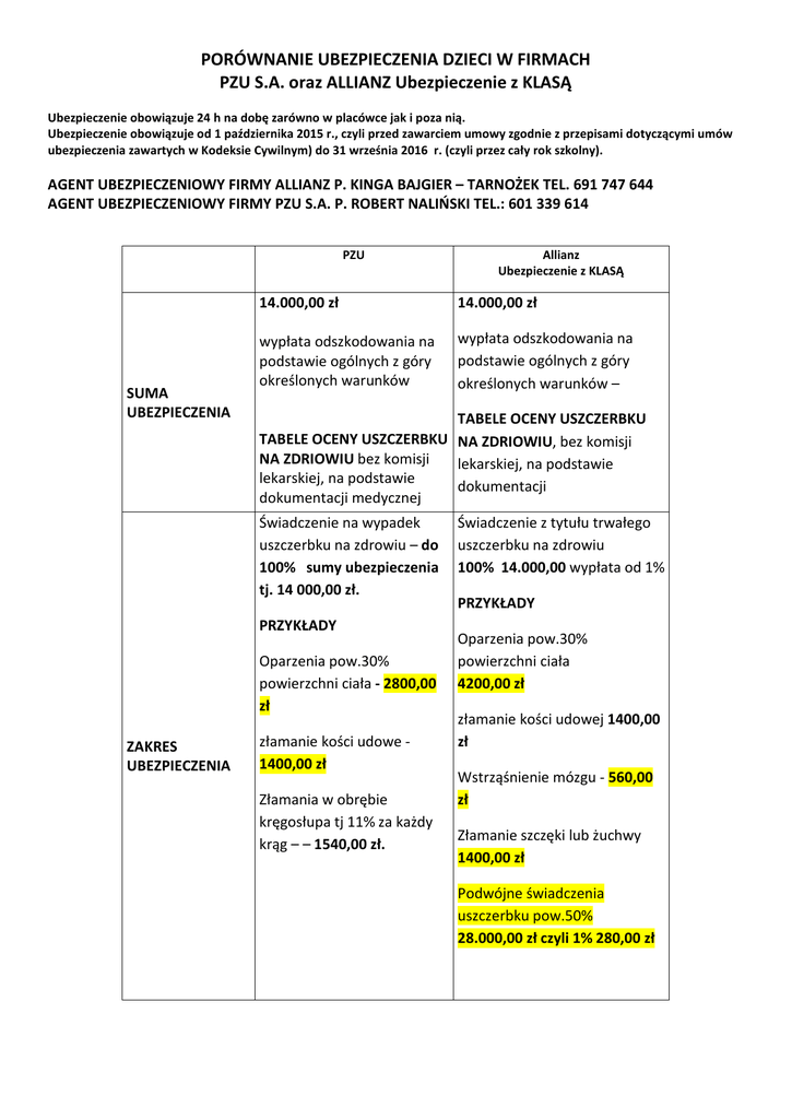 PORÓWNANIE UBEZPIECZENIA DZIECI W FIRMACH PZU S.A. oraz ALLIANZ Ubezpieczenie z KLASĄ Ubezpieczenie obowiązuje 24 h na dobę zarówno w placówce jak i poza nią. Ubezpieczenie obowiązuje od 1 października 2015 r., czyli przed zawarciem umowy zgodnie z przepisami dotyczącymi umów ubezpieczenia zawartych w Kodeksie Cywilnym) do 31 września 2016 r. (czyli przez cały rok szkolny). AGENT UBEZPIECZENIOWY FIRMY ALLIANZ P. KINGA BAJGIER – TARNOŻEK TEL. 691 747 644 AGENT UBEZPIECZENIOWY FIRMY PZU S.A. P. ROBERT NALIŃSKI TEL.: 601 339 614 PZU SUMA UBEZPIECZENIA 14.000,00 zł 14.000,00 zł wypłata odszkodowania na podstawie ogólnych z góry określonych warunków wypłata odszkodowania na podstawie ogólnych z góry określonych warunków – TABELE OCENY USZCZERBKU TABELE OCENY USZCZERBKU NA ZDRIOWIU, bez komisji NA ZDRIOWIU bez komisji lekarskiej, na podstawie lekarskiej, na podstawie dokumentacji dokumentacji medycznej Świadczenie na wypadek uszczerbku na zdrowiu – do 100% sumy ubezpieczenia tj. 14 000,00 zł. PRZYKŁADY Oparzenia pow.30% powierzchni ciała - 2800,00 zł ZAKRES UBEZPIECZENIA Allianz Ubezpieczenie z KLASĄ złamanie kości udowe 1400,00 zł Złamania w obrębie kręgosłupa tj 11% za każdy krąg – – 1540,00 zł. Świadczenie z tytułu trwałego uszczerbku na zdrowiu 100% 14.000,00 wypłata od 1% PRZYKŁADY Oparzenia pow.30% powierzchni ciała 4200,00 zł złamanie kości udowej 1400,00 zł Wstrząśnienie mózgu - 560,00 zł Złamanie szczęki lub żuchwy 1400,00 zł Podwójne świadczenia uszczerbku pow.50% 28.000,00 zł czyli 1% 280,00 zł Świadczenie na wypadek śmierci w wyniku nieszczęśliwego wypadku – 14.000,00 Świadczenie na wypadek śmierci w wyniku nieszczęśliwego wypadku – 14.000,00 Wychodząc naprzeciw Państwa oczekiwaniom wobec naszej Koszty leczenia w zakresie: podstawowym 1400,00 zł oferty, rozszerzyliśmy przedmiot ubezpieczenia o: • zdiagnozowanie sepsy • śmierć ubezpieczonego na terenie placówki szkolnej – ODSZKODOWANIE 28.000 ZŁ Zdiagnozowanie sepsy świadczenie z tytułu zachorowania na sepsę jednorazowe świadczenie w wysokości 1 000 zł Dieta szpitalna – pobyt w szpitalu w związku z nieszczęśliwym wypadkiem lub zdarzeniem objętym ochroną, płatna od drugiego dnia pobytu max. przez okres 90 dni z tytułu nieszczęśliwego wypadku lub zdarzenia objętego ochroną. Podstawowe honoraria lekarskie, • koszty lekarstw, • koszty zakupu protez i środków pomocniczych, • koszty zakupu środków opatrunkowych, • koszty zdjęć rentgenowskich, • USG i innych badań diagnostycznych, niezbędnych w procesie leczenia powypadkowego, WYPŁATA ZASIŁKU SZPITALNEGO z powodu nieszczęśliwego wypadku 28,00 za dzień max do 365 dni. Płatna od 1 doby. Np. za 30 dni pobytu – 840,00 zł. Zatrucie, gazami, substancjami i produktami chemicznymi, w tym porażenie prądem, piorunem 5% ZASIŁEK SZPITALNY wyniku zatrucia- wypłata za każdy dzień pobytu 28 zł za dzień Jeżeli dziecko przebywa na Oddziale Intensywnej Terapii od 2 do 5 dni – wypłata świadczenia wynosi 56 zł za dzień Pogryzienia, pokąsania, ukąszenia (wymagające hospitalizacji) Pogryzienia, pokąsania, ukąszenia (wymagające hospitalizacji) • pogryzienia przez psa • pogryzienia przez psa • pokąsania przez inne zwierzęta • pokąsania przez inne zwierzęta • ukąszenia przez owady Wyplata świadczenie nie jest warunkowana pobytem w szpitalu 10% sumy ubezpieczenia = 1400,00 Musi byś hospitalizowany • świadczenie z tytułu ukąszenia przez owady wypłata przy pobycie przez 1 dzień w szpitalu do 1400,00 Śmierć przedstawiciela ustawowego lub osoby, która ma na utrzymaniu ucznia lub studenta - śmierć w następstwie nieszczęśliwego wypadku w wysokości 1 000 pln Brak trwałego uszczerbku na zdrowiu, jednak wypadek wymagał interwencji lekarskiej w placówce medycznej połączonej z dalszym leczeniem i wymagającej co najmniej 1 wizyty kontrolnej 1,5% s.u. 210pln Utarta do 9 zębów stałych 2% s.u. za każdy utracony ząb, powyżej 9 zębów 20% s.u. brak Wizyta u lekarza- płacimy za ból Np. Dziecko przewróciło się i poszliśmy z nim do lekarza. Za wizytę otrzymujemy 60 zł. Za każdy utracony ząb 140,00 zł Wstrząśnienia lub podejrzenia wstrząśnienia mózgu • 2 dni hospitalizacji 1% sumy ubezpieczenia • 3 dni hospitalizacji 2% sumy ubezpieczenia Wstrząśnienia lub podejrzenia wstrząśnienia mózgu Nie musi być hospitalizowany Wypłata zarówno za podejrzenie i wstrząśnienie mózgu oraz dodatkowo za pobyt w szpitalu • 4 dni hospitalizacji 3% sumy ubezpieczenia Koszty leczenia Ochroną objęte są zdarzenia, którym ubezpieczony uległ bez względu na to, gdzie w danym momencie przebywał (w kraju czy za granicą) i o której godzinie doszło do wypadku (ochrona 24h na dobę), np. w czasie nauki/prowadzenia zajęć, w drodze do lub ze szkoły, a także w czasie różnych zajęć pozalekcyjnych, w tym także podczas uprawiania sportu (wyczynowo i rekreacyjnie), oraz w życiu prywatnym. DODATKOWE INFORMACJE Ochroną objęte są zdarzenia, którym ubezpieczony uległ bez względu na to, gdzie w danym momencie przebywał (w kraju czy za granicą) i o której godzinie doszło do wypadku (ochrona 24h na dobę), np. w czasie nauki/prowadzenia zajęć, w drodze do lub ze szkoły, a także w czasie różnych zajęć pozalekcyjnych, w tym także podczas uprawiania sportu (wyczynowo i rekreacyjnie), oraz w życiu prywatnym. Ponosimy odpowiedzialność za Ponosimy odpowiedzialność zdarzenia 24 godziny na dobę w za zdarzenia 24 godziny na kraju i zagranicą dobę w kraju i zagranicą, 1.Refundacja kosztów usługi assistance poniesionych w okresie 365 dni od daty NW od daty wypadku pomoc medyczna za granicą niezależnie od miejsca w związku z wypadkiem wystąpienia wypadku cały dziecka za granicą w zakresie świat. podstawowym 2. Honoraria lekarskie Nowoczesne rozwiązania w procesie likwidacji szkód i szybka rea