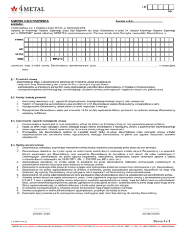 ID OD: UMOWA CZŁONKOWSKA Zawarta w dniu ......................................... pomiędzy: 4metal spółką z o.o. z siedzibą w Łodzi 90-510, ul. Zamenhofa 20/4, wpisaną do Krajowego Rejestru Sądowego przez Sąd Rejonowy dla Łodzi Śródmieścia w Łodzi XX Wydział Krajowego Rejestru Sądowego pod nr 0000223427, kapitał zakładowy 50000 PLN, reprezentowaną przez: Prezesa zarządu Jacka Tomczyka, zwaną dalej Zleceniobiorcą, a FIRMA NIP ULICA KOD – MIASTO zwaną/-ym dalej w treści umowy Zleceniodawcą reprezentowanym przez ......................................................................................, o następującej treści: § 1. Przedmiot umowy Zleceniodawca zleca, a Zleceniobiorca przyjmuje do wykonania usługę polegającą na: - dołączeniu firmy Zleceniodawcy jako członka do firm zrzeszonych w grupie 4metal - zamieszczeniu w branżowym portalu firm wpisu obejmującego wszystkie dane Zleceniodawcy wynikające z niniejszej umowy. - udostępnieniu panelu administracyjnego umożliwiającego bezpłatne zamieszczanie ogłoszeń na giełdzie maszyn oraz giełdzie pracy § 2. Koszty i zasady płatności 1. 2. 3. Koszt usług określonych w § 1 wynosi 99 złotych (słownie: dziewięćdziesiąt dziewięć złotych) netto miesięcznie. Tytułem wynagrodzenia za świadczenie usług określonych w §1 Zleceniodawca zapłaci Zleceniobiorcy wynagrodzenie z góry. Wynagrodzenie Zleceniobiorcy będzie płatne za każde rozpoczęte 3 miesiące. 4. Wynagrodzenie Zlecenobiorcy płatne jest w terminie 14 dni od daty wystawienia faktury, przelewem na rachunek bankowy Zleceniobiorcy wskazany na fakturze. § 3. Czas trwania i warunki rozwiązania umowy 1. Umowa niniejsza zawarta jest na czas nieokreślony, jednak nie krótszy niż 6 miesięcy licząc od daty wystawienia pierwszej faktury. 2. Każda ze stron może rozwiązać umowę składając drugiej stronie oświadczenie o rozwiązaniu umowy z zachowaniem trzymiesięcznego okresu wypowiedzenia. Oświadczenie musi być złożone na piśmie pod rygorem nieważności. 3. W przypadku, gdy Zleceniodawca opóźnia się z zapłatą dwóch faktur za usługi, Zleceniobiorca może rozwiązać umowę w trybie natychmiastowym bez zachowania okresu wypowiedzenia, składając Zleceniodawcy na piśmie pod rygorem nieważności stosowne oświadczenie. § 4. Ogólne warunki umowy 1. Zleceniobiorca oświadcza, że prowadzi internetowe serwisy branży metalowej oraz posiada pełne prawa do tych serwisów. 2. Zleceniodawca oświadcza, że wyraża zgodę na umieszczenie swoich danych osobowych w bazie danych Zleceniobiorcy i w serwisach, których właścicielem jest Zleceniobiorca, oraz upoważnia Zleceniobiorcę do korzystania z tych danych dla celów marketingowych i promocyjnych. Zleceniodawca ma prawo żądania uzupełnienia, uaktualnienia, sprostowania danych osobowych zgodnie z ustawą o ochronie danych osobowych z dn. 29.08.1997 r. (Dz. U. 133/1997 poz. 883 z późn. zm.). 3. Zleceniodawca oświadcza, że wyraża zgodę na przesłanie mu przez Zleceniobiorcę materiałów promocyjnych i reklamowych za pośrednictwem Internetu i pocztą na adres wskazany w niniejszej umowie. 4. Zleceniobiorca zastrzega sobie prawo do zmiany wyglądu oraz treści portalu 4metal bez konieczności informowania o tym Zleceniodawcy. 5. Zleceniobiorca nie ponosi odpowiedzialności za przerwy w emitowaniu portalu spowodowane przyczynami niezależnymi od niego oraz działaniem siły wyższej. Zleceniodawcy nie przysługuje w takich wypadkach od Zleceniobiorcy żadne odszkodowanie. 6. Zleceniobiorca nie ponosi odpowiedzialność za treści przekazane przez Zleceniodawcę, które są udostępniane za pośrednictwem portalu. 7. Wszelkie zmiany danych we wpisie dokonanym w portalu i inne uzgodnienia dotyczące wykonywania umowy z zastrzeżeniem postanowień § 3 pkt 2 i 3 oraz z wyjątkiem zapisów umowy dotyczących wysokości wynagrodzenia za usługę mogą być dokonywane za pośrednictwem faksu, poczty elektronicznej lub pisemnie, poprzez zgłoszenie ich przez jedną ze stron i zaakceptowanie tą samą drogą przez drugą stronę. Strony zgodnie oświadczają, że ustalenia dokonane w trybie wyżej opisanym są dla nich wiążące. 8. W sprawach nieuregulowanych w niniejszej umowie zastosowanie mają przepisy kodeksu cywilnego. 9. Umowę sporządzono w dwóch jednobrzmiących egzemplarzach, po jednym dla każdej ze stron. 10. Ewentualne spory powstałe na tle wykonywania umowy rozstrzygane będą przez Sąd właściwy dla siedziby Zleceniobiorcy. 2.3.2009 19:48:22 Zleceniodawca .......................... Zleceniobiorca .......................... pieczątka i podpis pieczątka i podpis Strona 1 z 3 4METAL Sp. z o.o. ADRES ul. Zamenhofa 20/4, 90-510 Łódź NIPPL7272637778 REGON473291175 Deutsche Bank 43 1910 1123 3201 3827 2121 0001 TEL +48(42)2569000 FAX +48(42)2569009 Dane do Emisji na portalu (proszę wypełnić drukowanymi literami): FIRMA ULICA KOD – MIASTO WOJ. NR KIER 0 – TEL. 1 TEL. 2 FAX WWW. E-MAIL (emitowany na portalu) E-MAIL (do obsługi giełdy maszyn) E-MAIL (do obsługi giełdy pracy) Zleceniodawca oświadcza, że prowadzi działalność gospodarczą w następującym zakresie: (zakreślić maksymalnie 10 kategorii wymienionych poniżej) Obróbka skrawaniem Elektrodrążenie Frezowanie CNC Frezowanie konwencjonalne Szlifowanie kształtowe Szlifowanie otworów Szlifowanie płaszczyzn Szlifowanie wałków Toczenie CNC Toczenie konwencjonalne Toczenie na automatach Walcowanie gwintów Obróbka plastyczna Gięcie blach Gięcie drutu Gięcie płaskowników, profili, rur Gięcie sprężyn kształtowych Kowalstwo zwykłe i artystyczne Kucie Obróbka na prasach Walcowanie Wyoblanie Hutnictwo Hutnictwo metali kolorowych Hutnictwo stali Profile rury i pręty Spawanie Konstrukcje stalowe i aluminiowe Natryskiwanie cieplne Spawanie aluminium Spawanie laserem Spawanie metali kolorowych Spawanie stali Spawanie stali nierdzewnej Usługi Biura konstrukcyjno-projek