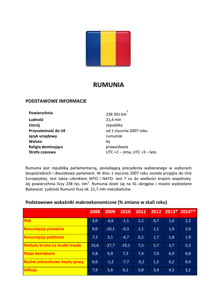 RUMUNIA PODSTAWOWE INFORMACJE 2 Powierzchnia 238 391 km 21,4 mln republika od 1 stycznia 2007 roku rumuński lej prawosławie UTC +2 – zima, UTC +3 – lato Ludność Ustrój Przynależność do UE Język urzędowy Waluta Religia dominująca Strefa czasowa Rumunia jest republiką parlamentarną, posiadającą prezydenta wybieranego w wyborach bezpośrednich i dwuizbowy parlament. W dniu 1 stycznia 2007 roku została przyjęta do Unii Europejskiej. Jest także członkiem WTO i NATO. Jest 7 co do wielkości krajem wspólnoty. Jej powierzchnia liczy 238 tys. km2. Rumunia dzieli się na 41 okręgów i miasto wydzielone Bukareszt. Ludność Rumunii liczy ok. 21,7 mln mieszkańców. Podstawowe wskaźniki makroekonomiczne (% zmiana w skali roku) 2008 2009 2010 2011 2012 2013* 2014** PKB 3,0 -6,6 -1,1 2,2 0,7 1,6 2,2 Konsumpcja prywatna 9,0 -10,1 -0,3 1,1 1,1 1,9 2,0 Konsumpcja publiczna 7,2 3,1 -4,7 0,2 1,7 1,8 1,9 Nakłady brutto na środki trwałe 15,6 -27,7 -19,1 7,5 5,7 3,7 5,3 Stopa bezrobocia 5,8 6,9 7,3 7,4 7,0 6,9 6,8 Realne jednostkowe koszty pracy 6,6 -1,2 -7,7 -3,1 1,5 0,2 0,4 Inflacja 7,9 5,6 6,1 5,8 3,4 4,3 3,1 Eksport 8,3 -6,4 13,2 10,3 -3,0 2,5 4,0 Import 7,9 -20,5 11,1 10,0 -0,9 4,0 5,0 Deficyt budżetowy w %PKB -5,7 -9,0 -6,8 -5,6 -2,9 -2,6 -2,4 Dług publiczny w %PKB 13,4 23,6 30,5 34,7 37,8 38,6 38,5 Źródło: European Economic Forecast, 2014; * dane wstępne , ** prognoza Z punktu widzenia regionu, Rumunia jest jego liderem, będąc największym ludnościowo państwem bałkańskim i posiadając drugi w kolejności (po Grecji) wskaźnik wartości PKB. Rumunia zaliczana jest do intensywnie rozwijających się gospodarek byłego bloku socjalistycznego, która dotychczas utrzymywała dobre tempo wzrostu gospodarczego, kontrolując swoją inflację i posiadając bardzo niski poziom bezrobocia. Jednak kraj ten mocno odczuwa skutki światowego kryzysu gospodarczo-finansowego, co przekłada się na jego wyniki ekonomiczne w kolejnych latach. Obecnie Rumunia boryka się również z kryzysem politycznym, w 2012r. nastąpiła trzykrotna zmiana rządu. Sytuacja gospodarcza Rok 2013 jest kolejnym rokiem wzrostu PKB w Rumunii, który wyniósł 3,5 %. Jest to najlepszy wynik od 5 lat. Wzrost PKB w latach ubiegłych wynosił odpowiednio: 2,2% w roku 2011 i 0,7% w roku 2012. Osiągnięty w 2013r. wzrost PKB jest najlepszy wśród wszystkich krajów członkowskich UE. Rumuński handel zagraniczny w roku 2013 osiągnął poziom 104,8 mld EUR i był o 5,1% wyższy w porównaniu z 2012 rokiem oraz o 4,6 % większy od dotychczasowego rekordowego wyniku odnotowanego w roku 2011 (100,2 mld EUR). Rumuński eksport w 2013 roku wyniósł 49,6 mld EUR i jest to wzrost o 10 % w porównaniu z rokiem ubiegłym oraz najwyższy wynik w historii. W ciągu roku eksport do krajów UE wzrósł o 8,8 % w porównaniu do 2012 r., oraz do krajów nie będących członkami UE o 12,8%. Najważniejszymi partnerami Rumunii pod względem eksportu w roku 2013 były: Niemcy, Włochy, Francja oraz Turcja. Rumunia odnotowała także wzrost w imporcie o 1,0%, którego łączna wartość wyniosła w 2013r. 55,2 mld EUR. Wartość ta jest o 6% większa od wartości rumuńskiego importu z roku 2012. Ważnym czynnikiem przyczyniającym się do wzrostu gospodarczego Rumunii w 2013r. była przede wszystkim produkcja przemysłowa, która wzrosła o 7,1 % oraz wzrost w sektorze przetwórczym o 8,5 %, a także w górnictwie i sektorze wydobywczym o 1,9 %. W 2013r. produkcja energii elektrycznej w Rumunii spadła o 3,2 % w wyniku zmniejszenia produkcji energii cieplnej o 18,5 %. Wzrost produkcji nastąpił jednak z elektrowniach wodnych o 23,9 %, atomowych o 1,3 % oraz wiatrowych o 77,8 %. Zużycie energii elektrycznej spadło natomiast o 6,0 %.Zamknięcie roku budżetowego 2013 zakończyło się deficytem na poziomie 3,6 mld EUR. Zagraniczne inwestycje bezpośrednie w 2013 r. wyniosły 2,713 mld EUR. Inflacja w 2013 r. była na poziomie 1,55 %, natomiast stopa bezrobocia wyniosła 7,1 %.Przewidywania rządu dotyczące wzrostu PKB w roku 2014 wynoszą 2,1- 2,2 %. Według szacunków Banku Światowego wzrost gospodarczy Rumunii w 2014r. wyniesie ok. 2,5 %. Ramy prawno-traktatowe współpracy gospodarczej Rumunia przystąpiła do Unii Europejskiej w dniu 1 stycznia 2007 r. Odtąd nasze relacje handlowe z Rumunią regulują postanowienia dorobku prawnego Unii Europejskiej (zgodnie z Traktatem dotyczącym przystąpienia Polski i 9 innych krajów do Unii Europejskiej (Dz.U. z 2004 r. nr 90, poz. 864)), w tym również Traktat Akcesyjny o przystąpieniu Rumunii i Bułgarii do UE z dnia 25 kwietnia 2005 roku (Dz. U 2006 nr 79 poz.548), oraz: Umowa między Rządem Rzeczypospolitej Polskiej a Rządem Rumunii w sprawie popierania i wzajemnej ochrony inwestycji, sporządzona w Warszawie 23 czerwca 1994 r. (Dz.U. 1995 nr 77 poz. 386), Umowa między Rządem Rzeczypospolitej Polskiej a Rządem Rumunii w sprawie unikania podwójnego opodatkowania i zapobiegania uchylaniu się od opodatkowania w zakresie podatków od dochodu i majątku, sporządzona w Warszawie dnia 23 czerwca 1994 r. (Dz.U. 1995 nr 109 poz. 530) 22 maja 1991 roku, Deklaracja o współpracy Ministerstwa Gospodarki RP i Ministerstwa Małych i Średnich Przedsiębiorstw, Handlu i Otoczenia Biznesu Rumunii z dnia 15 lipca 2009 r., Wspólna Deklaracja dotyczącą polsko-rumuńskiego partnerstwa strategicznego podpisana przez Prezydentów Polski i Rumunii w dniu 7 października 2009r. oraz tzw. Action Plan z dnia 26 października 2010r.– Program Wykonawczy do ww. Deklaracji Prezydentów. Rumunia przystąpiła do Konwencji Narodów Zjednoczonych o umowach międzynarodowej sprzedaży towarów z 11 kwietnia 1980 r., której sygnatariuszem jest Polska (Dz.U. 1997 nr 45, poz. 286). Wymiana handlowa z Polską w latach 2009-2014 (w mln EUR) Mln EUR 2009 2010 2011 2012 2013* Obroty 1 895,9 2 591,3 3 142,8 3 163,0 3 406,7 Dynamika 2013 2012 108 1 152,3 Dynamika 2014 2013 108 Eksport 1 314,0 1 