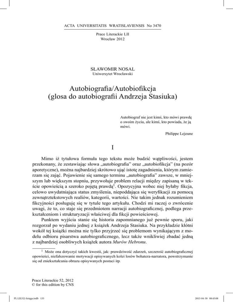 ACTA UNIVERSITATIS No 3470 AutobiografiWRATISLAVIENSIS a/Autobiofikcja 135 Prace Literackie LII Wrocław 2012 SŁAWOMIR NOSAL Uniwersytet Wrocławski Autobiografia/Autobiofikcja (glosa do autobiografii Andrzeja Stasiuka) Autobiograf nie jest kimś, kto mówi prawdę o swoim życiu, ale kimś, kto powiada, że ją mówi. Philippe Lejeune I Mimo iż tytułowa formuła tego tekstu może budzić wątpliwości, jestem przekonany, że zestawiając słowa „autobiografia” oraz „autobiofikcja” (na pozór aporetyczne), można najbardziej skrótowo ująć istotę zagadnienia, którym zamierzam się zająć. Pojawienie się samego terminu „autobiografia” zawsze, w mniejszym lub większym stopniu, przywołuje problem relacji między zapisaną w tekście opowieścią a szeroko pojętą prawdą1. Opozycyjna wobec niej byłaby fikcja, celowo uwydatniająca status zmyślenia, niepoddająca się weryfikacji za pomocą zewnątrztekstowych realiów, kategorii, wartości. Nie takim jednak rozumieniem fikcyjności posługuję się w tytule tego artykułu. Chodzi mi raczej o zwrócenie uwagi, że to, co staje się przedmiotem narracji autobiograficznej, podlega przekształceniom i strukturyzacji właściwej dla fikcji powieściowej. Punktem wyjścia stanie się historia zapomnianego już pewnie sporu, jaki rozgorzał po wydaniu jednej z książek Andrzeja Stasiuka. Na przykładzie kłótni wokół tej książki można nie tylko przyjrzeć się problemom wynikającym z modelu odbioru pisarstwa autobiograficznego, lecz także wnikliwiej zbadać jedną z najbardziej osobliwych książek autora Murów Hebronu. 1 Może ona dotyczyć takich kwestii, jak: prawdziwość zdarzeń, szczerość autobiograficznej opowieści, niefałszowanie motywacji opisywanych kolei losów bohatera-narratora, powstrzymanie się od zniekształcania obrazu opisywanych postaci itp. Prace Literackie 52, 2012 © for this edition by CNS PL LII(52)-księga.indb 135 2013-04-30 08:45:08 136 SŁAWOMIR NOSAL II Piśmiennictwo europejskie przez wieki wykształciło przynajmniej kilka możliwych schematów literackich, które — można by rzec de iure — dążą do wyrażania osobowości mówiącego podmiotu. Jeden z nich urósł do rangi odrębnego gatunku. Mowa oczywiście o autobiografii. W 1998 roku Stasiuk wydał niewielką książkę Jak zostałem pisarzem (próba autobiografii intelektualnej)2. Jest ona dość osobliwą realizacją gatunku, co znacząco wpłynęło na jej recepcję. Książka podzieliła środowisko krytyków, zrodziła się wokół niej dyskusja dotycząca nie tylko literatury, lecz także wartości, z jakich wyrosło pokolenie urodzonych około roku 1960. Niektórzy jej komentatorzy nie ograniczali się tylko do rozpoznań w obrębie książki, czego najlepszym przykładem może być polemika między Piotrem Bratkowskim a Zbigniewem Mentzlem3. Krytycznoliteracką kłótnię zapoczątkował jednak Bronisław Maj Autobiografią intelektualną Edka; wyrażając krytyczne opinie na temat książki, jej autora oraz tych, którzy mu przyklaskują, pisał: „Stomil, Artur i inni wyrafinowani intelektualiści niewolniczo wielbią Edka, który wie, że cokolwiek im rzuci, przyjmą to z pokornym zachwytem, jak najcudowniejszy dar”4. Wkrótce na łamach magazynu „Plus-Minus” (dodatku do „Rzeczpospolitej”) pojawiły się kolejne mniej lub bardziej krytyczne opinie5. Pisano o kompromitacji, doszukiwano się w książce prowokacji, skandalu, mówiono, że autobiografia to wybryk pisarza, któremu „odbiło”. Szybko jednak pojawiły się głosy biorące Stasiuka i jego książkę w obronę6. Ganiony przez jednych za obniżenie stylu tuż po dobrze przyjętej, uznanej przez niektórych niemal za arcydzieło Dukli, chwalony był Stasiuk przez innych za podjęcie autoironicznej gry, wzięcie na warsztat konwencji literackiej czy balansowanie na pograniczu biografistyki i zmyślenia. Ze sporu tego można wyciągnąć ciekawe wnioski, stanowić on bowiem może ilustrację pewnego problemu. Otóż rzecz polega na tym, że książka Stasiuka nie spełniła oczekiwań. Nie chodzi przy tym o oczekiwania tego rodzaju, 2 Jak zostałem pisarzem (próba autobiografii intelektualnej), Czarne 1998, dalej: JZP i numer strony. 3 Dwugłos ten zapoczątkował tekst Piotra Bratkowskiego Każdy miał swoje FSO, „Gazeta Wyborcza” 1999, nr 1, w którym autor wyraża pogląd, że książka Stasiuka ważna jest przede wszystkim dlatego, iż przełom lat 70. i 80. był w literaturze dotąd „światem nieprzedstawionym” przynajmniej jeśli chodzi o środowiska, które opisuje Stasiuk. W odpowiedzi Zbigniew Mentzel opublikował felieton pod niezwykle sugestywnym tytułem (odwołującym się zresztą do słów Bratkowskiego): Kaszanka jako duchowa forma życia, „Tygodnik Powszechny” 1999, nr 3. 4 B. Maj, Autobiografia intelektualna Edka, „Plus-Minus” 1998, nr 49. 5 Zob. W. Ratajczak, R. Okulicz-Kozaryn, Auto-bio-kompromitacja, „Plus-Minus” 1998, nr 51; oraz K. Masłoń, Kultowy Peerel, „Plus-Minus” 1998, nr 51. 6 Zob. P. Bratkowski, op. cit.; A. Niewiadomski, Notatki do „dzieła”, „Kresy” 1999, nr 1; M. Lengren, Buszujący w PRL-u, „Twórczość” 1999, nr 6; H. Gosk, Trzy w jednym, „Nowe Książki” 1999, nr 2; M. Orski, Powrót do „krainy cudowności”, „Przegląd Powszechny” 2000, nr 5. Prace Literackie 52, 2012 © for this edition by CNS PL LII(52)-księga.indb 136 2013-04-30 08:45:08 Autobiografia/Autobiofikcja 137 jak zgłaszane przez krytyków negatywnie oceniających książkę, nie o estetyczne czy światopoglądowe aspekty tu idzie. Sedno sporu tkwi w tym, że książka Jak zostałem pisarzem nie spełnia oczekiwań genologicznych, które sama zapowiada już w tytule. Trafnie rzecz rozpoznała Hanna Gosk, pisząc: Autor raczej podkpiwa z czytelniczych oczekiwań wywołanych gatunkowym przyporządkowaniem własnych zapisków. Serio zawiera z odbiorcą pakt referencjalny i autobiograficzn