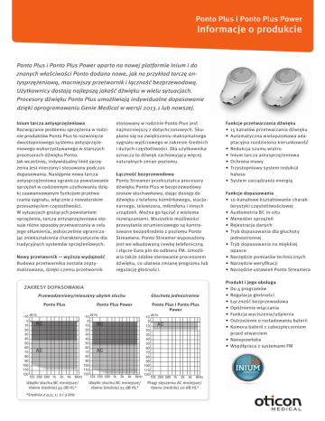 Ponto Plus i Ponto Plus Power Informacje o produkcie Ponto Plus i Ponto Plus Power oparto na nowej platformie Inium i do znanych właściwości Ponto dodano nowe, jak na przykład tarczę antysprzężeniową, mocniejszy przetwornik i łączność bezprzewodową. Użytkownicy dostają najlepszą jakość dźwięku w wielu sytuacjach. Procesory dźwięku Ponto Plus umożliwiają indywidualne dopasowanie dzięki oprogramowaniu Genie Medical w wersji 2013.1 lub nowszej. Inium tarcza antysprzężeniowa Rozwiązanie problemu sprzężenia w rodzinie produktów Ponto Plus to rozwinięcie dwustopniowego systemu antysprzężeniowego wykorzystywanego w starszych procesorach dźwięku Ponto. Jak wcześniej, indywidualny limit sprzężenia jest mierzony i stosowany podczas dopasowania. Następnie nowa tarcza antysprzężeniowa ogranicza powstawanie sprzężeń w codziennym użytkowaniu dzięki zaawansowanym funkcjom przetwarzania sygnału, włącznie z nowatorskim przesunięciem częstotliwości. W sytuacjach grożących powstaniem sprzężenia, tarcza antysprzężeniowa stosuje różne sposoby przetwarzania w celu jego stłumienia, jednocześnie ograniczając zniekształcenia charakterystyczne dla tradycyjnych systemów sprzężeniowych. Nowy przetwornik — wyższa wydajność Budowa przetwornika została zoptymalizowana, dzięki czemu przetwornik stosowany w rodzinie Ponto Plus jest najmocniejszy z dotychczasowych. Skupiono się na zwiększeniu maksymalnego sygnału wyjściowego w zakresie średnich i dużych częstotliwości. Dla użytkownika oznacza to dźwięk zachowujący więcej naturalnych zmian poziomu. Łączność bezprzewodowa Ponto Streamer przekształca procesory dźwięku Ponto Plus w bezprzewodowy zestaw słuchawkowy, dając dostęp do dźwięku z telefonu komórkowego, stacjonarnego, telewizora, mikrofonu i innych urządzeń. Można go łączyć z wieloma rozwiązaniami. Wszystkie możliwości przesyłania strumieniowego są kontrolowane bezpośrednio z poziomu Ponto Streamera. Ponto Streamer wyposażony jest we wbudowaną cewkę telefoniczną i złącze Euro pin do odbioru FM. Umożliwia także zdalne sterowanie procesorem dźwięku, co ułatwia zmianę programu lub regulację głośności. ZAKRESY DOPASOWANIA Głuchota jednostronna Przewodzeniowy/mieszany ubytek słuchu Ponto Plus -10 0 10 20 30 40 50 60 70 80 90 100 110 120 Ponto Plus Power dB HL BC AC 125 250 500 1k 2k 4k 8k Hz Ubytki słuchu BC mniejsze/ równe średniej 45 dB HL* *średnia z 0,5; 1; 2 i 3 kHz -10 0 10 20 30 40 50 60 70 80 90 100 110 120 Ponto Plus i Ponto Plus Power dB HL BC AC 125 250 500 1k 2k 4k 8k Hz Ubytki słuchu BC mniejsze/ równe średniej 55 dB HL* -10 0 10 20 30 40 50 60 70 80 90 100 110 120 dB HL AC 125 250 500 1k 2k 4k 8k Hz Progi słyszenia AC mniejsze/ równe średniej 20 dB HL* Funkcje przetwarzania dźwięku • 15 kanałów przetwarzania dźwięku • Automatyczna wielopasmowa adaptacyjna rozdzielona kierunkowość • Redukcja szumu wiatru • Inium tarcza antysprzężeniowa • Ochrona mowy • Trzystopniowy system redukcji hałasu • System zarządzania energią Funkcje dopasowania • 10-kanałowe kształtowanie charakterystyki częstotliwościowej • Audiometria BC in-situ • Menedżer sprzężeń • Rejestracja danych • Tryb dopasowania dla głuchoty jednostronnej • Tryb dopasowania na miękkiej opasce • Narzędzie pomiarów technicznych • Narzędzie weryfikacji • Narzędzie ustawień Ponto Streamera Produkt i jego obsługa • Do 4 programów • Regulacja głośności • Łączność bezprzewodowa • Opóźnienie włączania • Funkcja wyciszenia/uśpienia • Ostrzeżenie o rozładowaniu baterii • Komora baterii z zabezpieczeniem przed otwarciem • Nanopowłoka • Współpraca z systemami FM Opis produktu KOLORY Białe srebro Chromowy beż Kawowy brąz Diamentowa czerń DODATKOWE FUNKCJE PROCESORÓW DŹWIĘKU PONTO PLUS Automatyczna wielokanałowa adaptacyjna rozdzielona kierunkowość System analizuje informacje z różnych detektorów otoczenia i automatycznie wybiera jeden z trzech różnych trybów kierunkowości w celu automatycznej poprawy stosunku sygnału mowy do szumu w trudnych sytuacjach akustycznych. Tryby kierunkowości to wszechkierunkowość, rozdzielona kierunkowość oraz pełna kierunkowość. Trzystopniowy system redukcji hałasu Funkcja pozwala na ciągłą analizę środowiska w celu wykrywania mowy, ha- łasu otoczenia i szumu wiatru. System automatycznie i niezauważalnie przełącza się między różnymi stanami pracy. Ma on na celu zapewnienie maksimum komfortu w głośnym otoczeniu przy jednoczesnym zachowaniu informacji najważniejszych dla rozumienia mowy. Redukcja szumu wiatru Dźwięki będą tłumione w zależności od poziomu szumu wiatru. Im głośniejszy wiatr, tym większe tłumienie. Wymusza to przejście procesora dźwięku na trybu wszechkierunkowy po wykryciu wiatru. Ochrona mowy Ochrona mowy to system przetwarzania sygnału, który zapewnia w jak największym stopniu przetwarzanie liniowe, a jednocześnie natychmiast reaguje na pojawiające się nagłe głośne dźwięki otoczenia — jednak bez zniekształceń występujących w tradycyjnych systemach kompresji. OPROGRAMOWANIE DO DOPASOWANIA Procesory dźwięku Ponto Plus można programować za pomocą oprogramowania do dopasowania Genie Medical 2013.1 lub nowszej wersji. Oprogramowanie to może być stosowane samodzielnie lub razem z NOAH. Procesory mogą być programowane za pomocą kabelków do programowania Oticon nr 3 lub NOAHlink nr 2. FUNKCJE DOPASOWANIA Audiometria BC in-situ Narzędzie w oprogramowaniu Genie Medical, które służy do pomiarów progów słyszenia dla przewodnictwa kostnego pacjenta bezpośrednio za pomocą procesora dźwięku. Menedżer sprzężeń Menedżer sprzężeń w oprogramowaniu Genie Medical mierzy i stosuje indywidualne limity sprzężenia w procesorze dźwięku, aby zapobiegać sprzężeniu statycznemu i ułatwić pełne wykorzystanie c