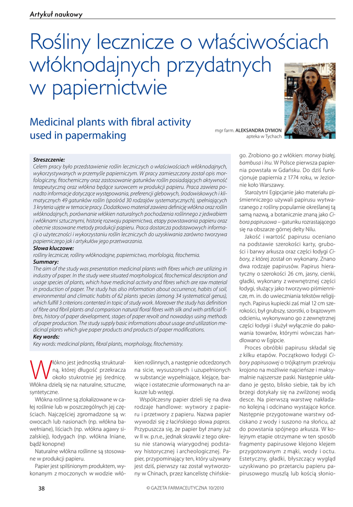 Artykuł naukowy Rośliny lecznicze o właściwościach włóknodajnych przydatnych w papiernictwie Medicinal plants with fibral activity used in papermaking mgr farm. ALEKSANDRA DYMON apteka w Tychach Streszczenie: Celem pracy było przedstawienie roślin leczniczych o właściwościach włóknodajnych, wykorzystywanych w przemyśle papierniczym. W pracy zamieszczony został opis morfologiczny, fitochemiczny oraz zastosowanie gatunków roślin posiadających aktywność terapeutyczną oraz włókna będące surowcem w produkcji papieru. Praca zawiera ponadto informacje dotyczące występowania, preferencji glebowych, środowiskowych i klimatycznych 49 gatunków roślin (spośród 30 rodzajów systematycznych), spełniających 3 kryteria ujęte w temacie pracy. Dodatkowo materiał zawiera definicję włókna oraz roślin włóknodajnych, porównanie włókien naturalnych pochodzenia roślinnego z jedwabiem i włóknami sztucznymi, historię rozwoju papiernictwa, etapy powstawania papieru oraz obecnie stosowane metody produkcji papieru. Praca dostarcza podstawowych informacji o użyteczności i wykorzystaniu roślin leczniczych do uzyskiwania zarówno tworzywa papierniczego jak i artykułów jego przetwarzania. Słowa kluczowe: rośliny lecznicze, rośliny włóknodajne, papiernictwo, morfologia, fitochemia. Summary: The aim of the study was presentation medicinal plants with fibres which are utilizing in industry of paper. In the study were situated morphological, fitochemical description and usage species of plants, which have medicinal activity and fibres which are raw material in production of paper. The study has also information about occurrence, habits of soil, environmental and climatic habits of 62 plants species (among 34 systematical genus), which fulfill 3 criterions contented in topic of study work. Moreover the study has definition of fibre and fibril plants and comparison natural floral fibres with silk and with artificial fibres, history of paper development, stages of paper revolt and nowadays using methods of paper production. The study supply basic informations about usage and utilization medicinal plants which give paper products and products of paper modifications. Key words: Key words: medicinal plants, fibral plants, morphology, fitochemistry. W łókno jest jednostką strukturalną, której długość przekracza około stukrotnie jej średnicę. Włókna dzielą się na: naturalne, sztuczne, syntetyczne. Włókna roślinne są zlokalizowane w całej roślinie lub w poszczególnych jej częściach. Najczęściej zgromadzone są w: owocach lub nasionach (np. włókna bawełniane), liściach (np. włókna agawy sizalskiej), łodygach (np. włókna lniane, bądź konopne) Naturalne włókna roślinne są stosowane w produkcji papieru. Papier jest spilśnionym produktem, wykonanym z moczonych w wodzie włó- 38 kien roślinnych, a następnie odcedzonych na sicie, wysuszonych i uzupełnionych w substancje wypełniające, klejące, barwiące i ostatecznie uformowanych na arkusze lub wstęgi. Współczesny papier dzieli się na dwa rodzaje handlowe: wytwory z papieru i przetwory z papieru. Nazwa papier wywodzi się z łacińskiego słowa papros. Przypuszcza się, że papier był znany już w II w. p.n.e., jednak skrawki z tego okresu nie stanowią wiarygodnej podstawy historycznej i archeologicznej. Papier, przypominający ten, który używany jest dziś, pierwszy raz został wytworzony w Chinach, przez kancelistę chińskie© GAZETA FARMACEUTYCZNA 10/2010 go. Zrobiono go z włókien: morwy białej, bambusa i lnu. W Polsce pierwsza papiernia powstała w Gdańsku. Do dziś funkcjonuje papiernia z 1774 roku, w Jeziornie koło Warszawy. Starożytni Egipcjanie jako materiału piśmienniczego używali papirusu wytwarzanego z rośliny popularnie określanej tą samą nazwą, a botanicznie znaną jako Cibora papirusowa – gatunku rozrastającego się na obszarze górnej delty Nilu. Jakość i wartość papirusu oceniano na podstawie szerokości karty, grubości i barwy arkusza oraz części łodygi Cibory, z której został on wykonany. Znano dwa rodzaje papirusów. Papirus hieratyczny o szerokości 26 cm, jasny, cienki, gładki, wykonany z wewnętrznej części łodygi, służący jako tworzywo piśmiennicze, m. in. do uwieczniania tekstów religijnych. Papirus kupiecki zaś miał 12 cm szerokości, był grubszy, szorstki, o brązowym odcieniu, wykonywano go z zewnętrznej części łodygi i służył wyłącznie do pakowania towarów, którymi wówczas handlowano w Egipcie. Proces obróbki papirusu składał się z kilku etapów. Początkowo łodygi Cibory papirusowej o trójkątnym przekroju krojono na możliwie najcieńsze i maksymalnie najszersze paski. Następnie układano je gęsto, blisko siebie, tak by ich brzegi dotykały się na zwilżonej wodą desce. Na pierwszą warstwę nakładano kolejną i odcinano wystające końce. Następnie przygotowane warstwy odciskano z wody i suszono na słońcu, aż do powstania spójnego arkusza. W kolejnym etapie otrzymane w ten sposób fragmenty papirusowe klejono klejem przygotowanym z mąki, wody i octu. Estetyczny, gładki, błyszczący wygląd uzyskiwano po przetarciu papieru papirusowego muszlą lub kością słonio- Artykuł naukowy wą. Pojedynczy zwój papirusu złożony był zazwyczaj z dwudziestu arkuszy papirusu. Najstarsze zwoje papirusowe sięgają trzeciego tysiąclecia przed naszą erą; do dziś możliwe jest ich rozwijanie i zwijanie, materiał zachował elastyczność i miękkość. Obecnie zidentyfikowano i sklasyfikowano około dwu tysięcy gatunków włóknodajnych, spośród których praktyczne zastosowanie znalazło około tysiąc. Wiele z gatunków włóknodajnych posiada szereg związków aktywnych terapeutycznie, przez co rośliny te są również surowcem farmakologicznym. Spośród sześćdziesięciu dwóch gatunków opisanych w mojej pracy magisterskiej chciałabym przybliżyć cztery z nich. Bawełna, ba