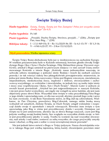 Święto Trójcy Bożej 1 Święto Trójcy Bożej Hasło tygodnia: Święty, Święty, Święty jest Pan Zastępów! Pełna jest wszystka ziemia chwały jego” (Iz 6,3) Psalm tygodnia: Ps 145 Pieśń tygodnia: „Przyjdź, Duchu Święty, Stwórco, przyjdź…” (226); „Święty jest Pan, nasz Bóg…” (239) Biblijne teksty: I – J 3,1-8(9-15); II – Rz 11,(32)33-36; III – Iz 6,1-13; IV – Ef 1,3-14; V – 4 Mż 6,22-27; VI – 2 Kor 13,11(12)13. Myśl przewodnia: Wielka tajemnica wiary Święto Trójcy Bożej obchodzone było już w średniowieczu na zachodzie Europy. W wielkim poszanowaniu było w Kościele reformacji, bowiem głosiło chwałę Trójjedynego Boga: Ojca i Syna i Ducha Świętego. Filip Melanchton pisząc Wyznanie augsburskie, artykuł o Bogu umieścił na pierwszym miejscu i w nim zawarł wiarę zreformowanego Kościoła o istocie Boga: „Kościoły nasze jednomyślnie nauczają, że uchwała soboru nicejskiego o jedności istoty Boskiej i trzech Jej osobach zawiera prawdę i że tak wierzyć należy bez jakiegokolwiek powątpiewania: mianowicie, że jedna jest istota Boska, którą nazywamy i która jest Bogiem wiecznym, niecielesnym, niepodzielnym, nieskończonej mocy, mądrości i dobroci, stworzycielem i zachowawcą wszystkiego, co widzialne i niewidzialne, że jednak trzy są osoby tejże istoty i mocy oraz współwieczne: Ojciec, Syn i Duch Święty”. Marcin Luter w jednym ze swoich kazań powiedział: „Artykuł ten jest najprzedniejszym w naszym Kościele, i nie jest przez ludzi wymyślony, ani nigdy nie wstąpił na serce ludzkie, ale jest nam objawiony przez słowo Boże. Wszystkie inne święta w roku przyoblekają Pana Boga w jego dzieła i opowiadają nam, co dla nas uczynił, abyśmy poznali Jego wolę i serce ku nam zwrócone. A tak Boże Narodzenie mówi, że Bóg stał się człowiekiem, Wielkanoc, że Pan Chrystus, prawdziwy Bóg-Człowiek, samego siebie boską mocą wzbudził od umarłych, Zielone Święta, że Duch Święty zstąpił widzialnie i rozpoczął dzieło swoje w apostołach i innych wierzących. Również inne święta o tym opowiadają, jako Bóg w różne jest przyobleczony dzieła i uczynki. Dzisiejsze zaś święto na to jest ustanowione, abyśmy się ze słowa Bożego nauczyli, czym jest Bóg jedynie według swojej boskiej Istoty, bez względu na wszystkie dzieła swoje, w które jest przyobleczony jakoby w szatę. Trzeba tu wznieść się nad wszystkie stworzenia, nad anioły i nad niebo, zostawić za sobą wszystko, do czego przywykły zmysły nasze i słuchać, co Bóg sam o sobie i o swej wewnętrznej istocie powiada”. Nie jest jednak łatwo mówić o Bogu w Trójcy jedynym. Nasza chrześcijańska wiara w takiego Boga jest wielką tajemnicą, którą każdy chrześcijanin powinien mieć 2 Święto Trójcy Bożej w poszanowaniu. Ojciec Kościoła, Bazyli Wielki pisał: „Wiem, że Bóg istnieje, ale to, czym jest Jego istota, przekracza moją możność poznania”. Mówić o istocie Boga – to znaczy mówić o Bogu dla nas. Bóg bowiem w swojej istocie jest niepoznawalny. Poznajemy Go jednak w Jego dziełach: w stwórczym dziele Ojca, zbawczym dziele Syna i dziele święcenia w Duchu Świętym. Dopomóc nam do tego mają teksty biblijne wyznaczone przez Kościół do czytania i rozważania w Święto Trójcy Świętej. Objawienie dokonało się w historii, a każda prawda w swoim czasie. Nie należy oczekiwać, że na kartach Starego Testamentu znajdziemy wyraźne świadectwo na temat Trójcy Bożej. W Starym Testamencie Bóg objawił się jako stworzyciel wszystkich rzeczy widzialnych i niewidzialnych, oraz jako zbawiciel Izraela. W Nowym Testamencie Bóg objawił się w Jezusie Chrystusie i dokonał przez Niego zbawienia wszystkich ludzi. Jezus Chrystus zaś zapowiedział przyjście Ducha Świętego. W Nowym Testamencie nie znajdziemy wyraźnie sformułowanej wiary w Trójjedynego Boga, chociaż w niektórych wypowiedziach wyraźnie występują obok siebie imiona osób Trójcy: Ojciec i Syn Boży, Jezus Chrystus i Duch Święty. Najczęściej sytuację taką spotykamy w tekstach, mających związek z liturgią. Najbardziej klarowna formuła trynitarna znajduje się w chrzestnym poleceniu, którym zakończona jest Ewangelia św. Mateusza: „Idźcie tedy i czyńcie uczniami wszystkie narody, chrzcząc je w imię Ojca i Syna, i Ducha Świętego, ucząc je przestrzegać wszystkiego, co wam przykazałem. A oto Ja jestem z wami po wszystkie dni aŜ do skończenia świata.” (Mt 28,19.20) oraz w apostolskim pozdrowieniu: „Łaska Pana Jezusa Chrystusa i miłość Boga, i społeczność Ducha Świętego niech będzie z wami wszystkimi” (2 Kor 13,13). Bóg jest tajemnicą. Nie tylko umyka On wszelkiej próbie zdefiniowania Go, ale także pełnego opisania tego, co czyni i to, co jest w Jego zamyśle. Teksty biblijne przeznaczone do czytania w Święto Trójcy Bożej zawierają tą myśl, a więc Nowy Testament nie kryje, że pewne prawdy są zakryte przed ludźmi, jednakże daje do zrozumienia, że są one jakby ukryte w zwiastowaniu Jezusa i Jego apostołów. Jezus do uczonego w Piśmie, Nikodema powiedział: „Zaprawdę, zaprawdę powiadam ci, co wiemy, to mówimy, i co widzieliśmy, o tym świadczymy, ale świadectwa naszego nie przyjmujecie. 12.Jeśli nie wierzycie, gdy wam mówiłem o ziemskich sprawach, jakże uwierzycie, gdy wam będę mówił o niebieskich?”. Apostoł Paweł zaś do Kościoła w Rzymie pisał: „O głębokości bogactwa i mądrości, i poznania Boga! Jakże niezbadane są wyroki jego i nie wyśledzone drogi jego! Bo któż poznał myśl Pana? Albo któż był doradcą jego? Albo któż wpierw dał mu coś, aby za to otrzymać odpłatę?”. W Święto Trójcy Bożej winniśmy dać się prowadzić Słowu Bożemu i rozmyślać w społeczności wierzących o działaniu Boga dla i między ludźmi, Boga, który nas powołał do społeczności życia z Nim przed założeniem świata. Bóg w