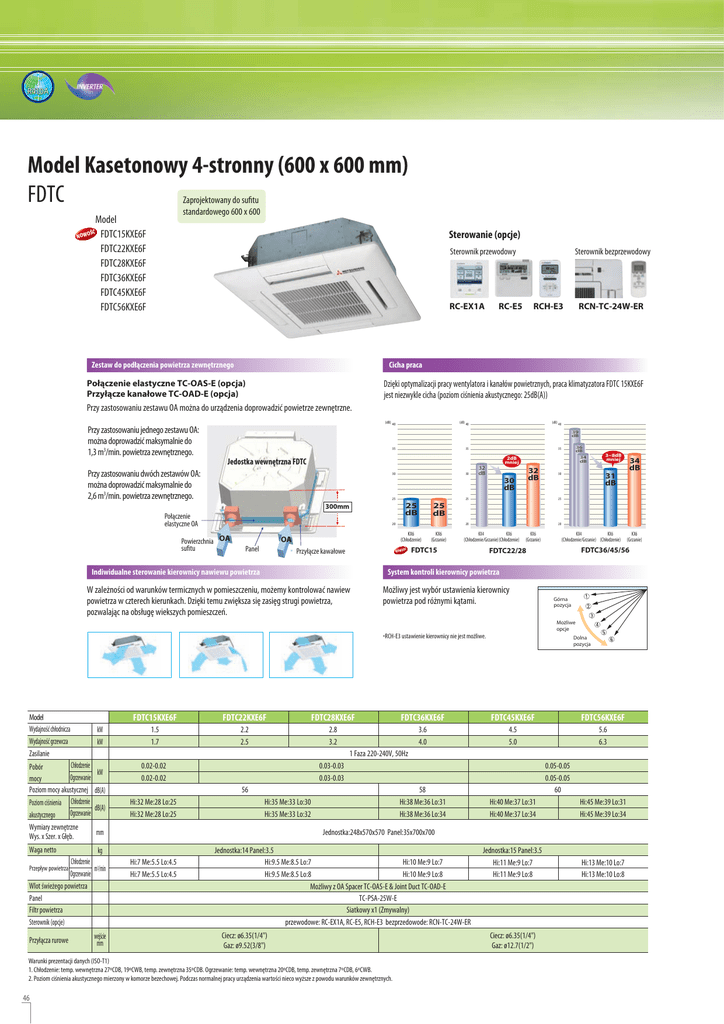 R410A Model Kasetonowy 4-stronny (600 x 600 mm) FDTC Zaprojektowany do sufitu standardowego 600 x 600 Model ŚĆ FDTC15KXE6F O W O N FDTC22KXE6F FDTC28KXE6F FDTC36KXE6F FDTC45KXE6F FDTC56KXE6F Sterowanie (opcje) Sterownik przewodowy RC-EX1A Zestaw do podłączenia powietrza zewnętrznego Sterownik bezprzewodowy RC-E5 RCH-E3 RCN-TC-24W-ER Cicha praca Połączenie elastyczne TC-OAS-E (opcja) Przyłącze kanałowe TC-OAD-E (opcja) Dzięki optymalizacji pracy wentylatora i kanałów powietrznych, praca klimatyzatora FDTC 15KXE6F jest niezwykle cicha (poziom ciśnienia akustycznego: 25dB(A)) Przy zastosowaniu zestawu OA można do urządzenia doprowadzić powietrze zewnętrzne. Przy zastosowaniu jednego zestawu OA: można doprowadzić maksymalnie do 1,3 m3/min. powietrza zewnętrznego. (dB) 40 (dB) 40 (dB) 40 35 35 35 39 dB 32 Przy zastosowaniu dwóch zestawów OA: można doprowadzić maksymalnie do 2,6 m3/min. powietrza zewnętrznego. 30 30 25 25 300mm Połączenie elastyczne OA 25 dB 25 dB KX6 (Chłodzenie) KX6 (Grzanie) 20 Powierzchnia OA sufitu OA Panel 36 dB 34 34 dB dB 34 dB 2dB mniej Jedostka wewnętrzna FDTC Indiwidualne sterowanie kierownicy nawiewu powietrza 32 dB 30 dB 30 3~8dB mniej 20 KX4 KX6 (Chłodzenie/Grzanie) (Chłodzenie) FDTC15 KX6 (Grzanie) KX4 KX6 (Chłodzenie/Grzanie) (Chłodzenie) Możliwy jest wybór ustawienia kierownicy powietrza pod różnymi kątami. Górna pozycja Możliwe opcje *RCH-E3 ustawienie kierownicy nie jest możliwe. Model Wydajność chłodnicza Wydajność grzewcza Zasilanie kW kW Wymiary zewnętrzne Wys. x Szer. x Głęb. FDTC15KXE6F FDTC22KXE6F FDTC28KXE6F FDTC36KXE6F FDTC45KXE6F FDTC56KXE6F 1.5 1.7 2.2 2.5 2.8 3.2 3.6 4.0 4.5 5.0 5.6 6.3 0.02-0.02 0.02-0.02 0.03-0.03 0.03-0.03 56 Hi:32 Me:28 Lo:25 Hi:32 Me:28 Lo:25 kg Chłodzenie 3 Przepływ powietrza m /min Ogrzewanie Wlot świeżego powietrza Panel Filtr powietrza Sterownik (opcje) wejście mm 58 Hi:38 Me:36 Lo:31 Hi:38 Me:36 Lo:34 Hi:35 Me:33 Lo:30 Hi:35 Me:33 Lo:32 Hi:7 Me:5.5 Lo:4.5 Hi:7 Me:5.5 Lo:4.5 Jednostka:14 Panel:3.5 Hi:9.5 Me:8.5 Lo:7 Hi:10 Me:9 Lo:7 Hi:9.5 Me:8.5 Lo:8 Hi:10 Me:9 Lo:8 Możliwy z OA Spacer TC-OAS-E & Joint Duct TC-OAD-E TC-PSA-25W-E Siatkowy x1 (Zmywalny) przewodowe: RC-EX1A, RC-E5, RCH-E3 bezprzedowode: RCN-TC-24W-ER Ciecz: ø6.35(1/4") Gaz: ø9.52(3/8") Warunki Warunkiprezentacji prezentacjidanych danych(ISO-T1) (ISO-T1) 1.1. Chłodzenie: 20ºCDB, temp. temp.zewnętrzna zewnętrzna7ºCDB, 7ºCDB,6ºCWB. 6ºCWB. Chłodzenie: temp. temp. wewnętrzna 27ºCDB, 19ºCWB, temp. zewnętrzna 35ºCDB. Ogrzewanie: temp. wewnętrzna 20ºCDB, 2.2. Poziom Podczas normalnej pracy urządzenia wartości nieco wyższe z powodu warunków zewnętrznych. Poziomciśnienia ciśnieniaakustycznego akustycznegomierzony mierzonywwkomorze komorzebezechowej. bezechowej. Podczas normalnej pracy urządzenia wartości nieco wyższe z powodu warunków zewnętrznych. 46 0.05-0.05 0.05-0.05 60 Hi:40 Me:37 Lo:31 Hi:40 Me:37 Lo:34 Hi:45 Me:39 Lo:31 Hi:45 Me:39 Lo:34 Jednostka:15 Panel:3.5 Hi:11 Me:9 Lo:7 Hi:11 Me:9 Lo:8 Hi:13 Me:10 Lo:7 Hi:13 Me:10 Lo:8 Jednostka:248x570x570 Panel:35x700x700 mm Waga netto Przyłącza rurowe Dolna pozycja 1 Faza 220-240V, 50Hz Chłodzenie Pobór kW Ogrzewanie mocy Poziom mocy akustycznej dB(A) Poziom ciśnienia Chłodzenie dB(A) Ogrzewanie akustycznego Ciecz: ø6.35(1/4") Gaz: ø12.7(1/2") KX6 (Grzanie) FDTC36/45/56 FDTC22/28 System kontroli kierownicy powietrza W zależności od warunków termicznych w pomieszczeniu, możemy kontrolować nawiew powietrza w czterech kierunkach. Dzięki temu zwiększa się zasięg strugi powietrza, pozwalając na obsługę wiekszych pomieszczeń. 34 dB 31 dB 25 20 Ć NOWOŚ Przyłącze kawałowe 32 dB dB Wymiary Wszystkie jednostki w mm. Panel dekoracyjny (Rozstaw śrub mocujących) (Rozstaw śrub mocujących) Skrzynka elektryczna Kratka wlotu powietrza Wylot powietrza min. max 600 Odprowadzenie skroplin Uchwyt do podwieszenia Opis FDTC15KXE6F, 22KXE6F, 28KXE6F Przestrzeń montażowa i serwisowa Otwory do połączenia wkrętami min. Rurociąg gazowy Otwór Rurociąg cieczowy Odprowadzenie skroplin min. Przeszkoda Otwór na przewody el. Śruby mocujące Wejście kanału powietrza W przypadku instalacji więcej niż jednej jednostki pozostawić odległość min. 4000. (kielich) (kielich) VP20 Standard (VP25 opcja) lub (wyłamać) Wbudowanadrain pompa skroplin Condensate pump included as standard max 600 Ultra slimkompaktowa, design at justtylko 248mm thesufitem ceiling Budowa 248 above mm nad (kielich) 47