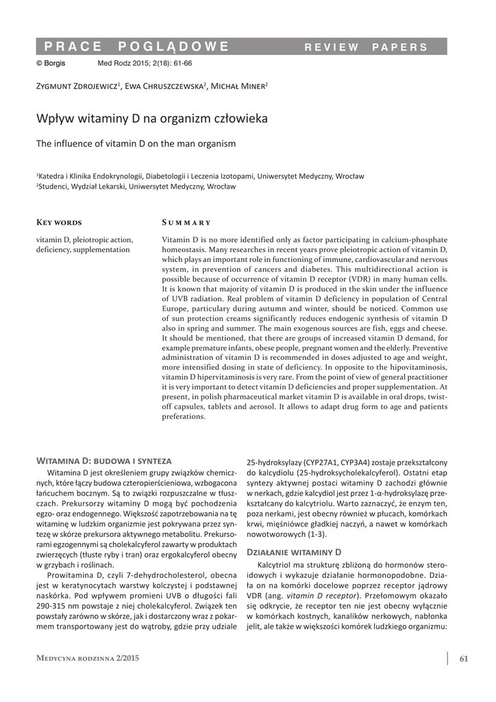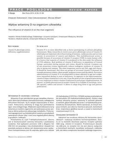 PRACE © Borgis Borgis POGLĄDOWE REVIEW PA P E R S Med Rodz 2015; 2(18): 61-66 Zygmunt Zdrojewicz1, Ewa Chruszczewska2, Michał Miner2 Wpływ witaminy D na organizm człowieka The influence of vitamin D on the man organism Katedra i Klinika Endokrynologii, Diabetologii i Leczenia Izotopami, Uniwersytet Medyczny, Wrocław Studenci, Wydział Lekarski, Uniwersytet Medyczny, Wrocław 1 2 Key words Summary vitamin D, pleiotropic action, deficiency, supplementation Vitamin D is no more identified only as factor participating in calcium-phosphate homeostasis. Many researches in recent years prove pleiotropic action of vitamin D, which plays an important role in functioning of immune, cardiovascular and nervous system, in prevention of cancers and diabetes. This multidirectional action is possible because of occurrence of vitamin D receptor (VDR) in many human cells. It is known that majority of vitamin D is produced in the skin under the influence of UVB radiation. Real problem of vitamin D deficiency in population of Central Europe, particulary during autumn and winter, should be noticed. Common use of sun protection creams significantly reduces endogenic synthesis of vitamin D also in spring and summer. The main exogenous sources are fish, eggs and cheese. It should be mentioned, that there are groups of increased vitamin D demand, for example premature infants, obese people, pregnant women and the elderly. Preventive administration of vitamin D is recommended in doses adjusted to age and weight, more intensified dosing in state of deficiency. In opposite to the hipovitaminosis, vitamin D hipervitaminosis is very rare. From the point of view of general practitioner it is very important to detect vitamin D deficiencies and proper supplementation. At present, in polish pharmaceutical market vitamin D is available in oral drops, twistoff capsules, tablets and aerosol. It allows to adapt drug form to age and patients preferations. Witamina D: budowa i synteza Witamina D jest określeniem grupy związków chemicznych, które łączy budowa czteropierścieniowa, wzbogacona łańcuchem bocznym. Są to związki rozpuszczalne w tłuszczach. Prekursorzy witaminy D mogą być pochodzenia egzo- oraz endogennego. Większość zapotrzebowania na tę witaminę w ludzkim organizmie jest pokrywana przez syntezę w skórze prekursora aktywnego metabolitu. Prekursorami egzogennymi są cholekalcyferol zawarty w produktach zwierzęcych (tłuste ryby i tran) oraz ergokalcyferol obecny w grzybach i roślinach. Prowitamina D, czyli 7-dehydrocholesterol, obecna jest w keratynocytach warstwy kolczystej i podstawnej naskórka. Pod wpływem promieni UVB o długości fali 290-315 nm powstaje z niej cholekalcyferol. Związek ten powstały zarówno w skórze, jak i dostarczony wraz z pokarmem transportowany jest do wątroby, gdzie przy udziale Medycyna rodzinna 2/2015 25-hydroksylazy (CYP27A1, CYP3A4) zostaje przekształcony do kalcydiolu (25-hydroksycholekalcyferol). Ostatni etap syntezy aktywnej postaci witaminy D zachodzi głównie w nerkach, gdzie kalcydiol jest przez 1-α-hydroksylazę przekształcany do kalcytriolu. Warto zaznaczyć, że enzym ten, poza nerkami, jest obecny również w płucach, komórkach krwi, mięśniówce gładkiej naczyń, a nawet w komórkach nowotworowych (1-3). Działanie witaminy D Kalcytriol ma strukturę zbliżoną do hormonów steroidowych i wykazuje działanie hormonopodobne. Działa on na komórki docelowe poprzez receptor jądrowy VDR (ang. vitamin D receptor). Przełomowym okazało się odkrycie, że receptor ten nie jest obecny wyłącznie w komórkach kostnych, kanalików nerkowych, nabłonka jelit, ale także w większości komórek ludzkiego organizmu: 61 Zygmunt Zdrojewicz, Ewa Chruszczewska, Michał Miner w sercu, ścianie naczyń krwionośnych, mózgu, gruczole krokowym, gruczole sutkowym, nadnerczach, komórkach β trzustki, jelicie cienkim, jelicie grubym, przytarczycach, limfocytach, makrofagach, keratynocytach i komórkach nowotworowych. Obecność receptora VDR na tak wielu rodzajach komórek warunkuje plejotropowe działanie witaminy D. Kalcytriol kontroluje transkrypcję ponad 200 genów. Działanie witaminy D na organizm ludzki jest bardzo szerokie (4-7). Wpływ na układ kostny 1. Najważniejszą i najbardziej do tej pory poznaną funkcją witaminy D jest regulacja gospodarki wapniowo-fosforanowej. 2. Stwarza optymalne warunki dla odpowiedniej mineralizacji kości. Warunkuje rozwój i dojrzewanie szkieletu od życia płodowego do czasu zakończenia wzrastania. 3. Wykazano przeciwzłamaniowe działanie tej witaminy, szczególnie u osób starszych. 4. W wielu pracach klinicznych wykazano związek pomiędzy poziomem aktywnych metabolitów w surowicy a sprawnością fizyczną (1, 6, 8). Immunomodulujące działanie witaminy D 1. Głównym skutkiem działania witaminy D jest wygaszanie reakcji zapalnej, co chronić ma przed przewlekającymi się procesami zapalnymi oraz chorobami autoimmunologicznymi, takimi jak nieswoiste zapalenia jelit, reumatoidalne zapalenie stawów, fibromialgia, cukrzyca typu I. 2. Obniża poziom cytokin prozapalnych, przy jednoczesnym wzroście cytokin przeciwzapalnych. Dodatkowo prowadzi do wzrostu odsetka limfocytów Th2 i Treg, przy spadku limfocytów Th1 oraz Th17. 3. Skuteczność została wykazana w terapii łuszczycy oraz w chorobach obturacyjnych takich jak astma i POChP, gdzie przewlekłe postępujące zapalenie prowadzi do progresji choroby. 4. Podwyższone stężenie aktywnych metabolitów we krwi powoduje wzrost produkcji ludzkiej katelicydyny (hCAP18). Jest to naturalny antybiotyk o szerokim spektrum, który ogranicza rozwój wielu bakterii – dlatego suplementacja witaminy D podczas zimy może być wykorzystana do redukcji zachorowań na nieżyty górnych dróg oddechowych (8-11). Związek witaminy D z chorobami układu krążenia 1. Sugeruje się, że suplementacja witaminą D zmniejsza ryzyko sercowo-naczyniowe na drodze różnych 