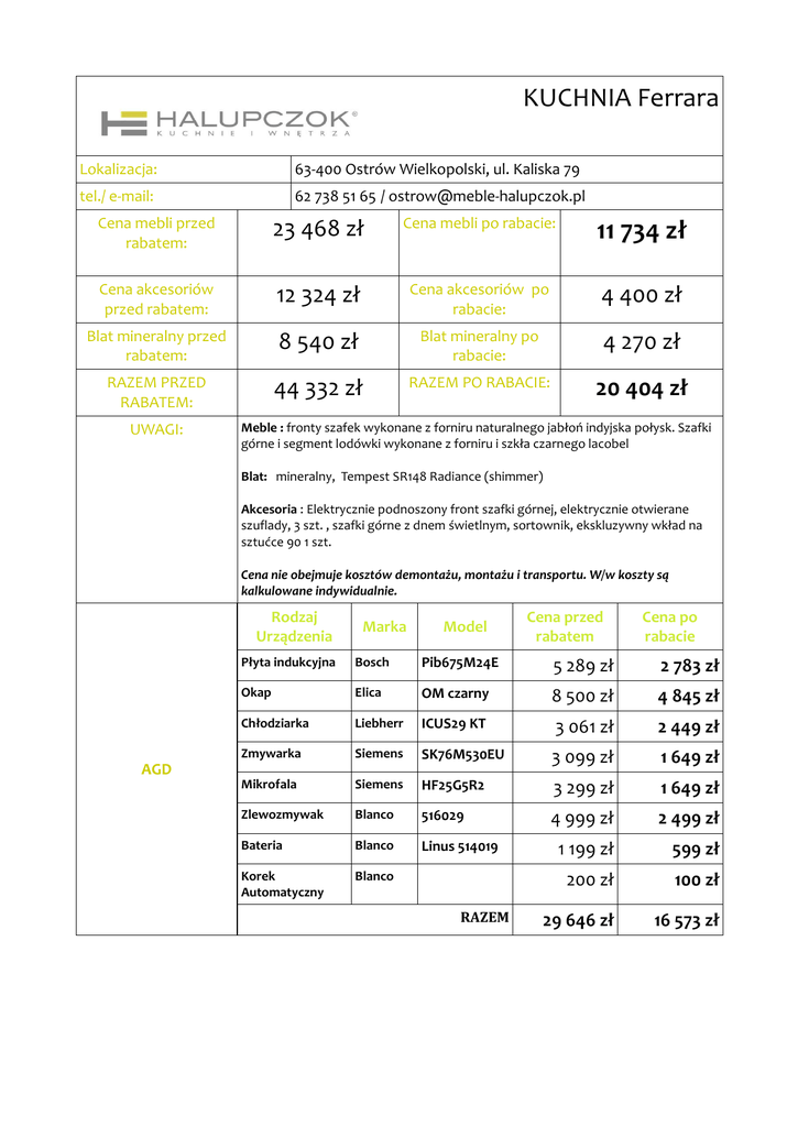 KUCHNIA Ferrara Lokalizacja: 63-400 Ostrów Wielkopolski, ul. Kaliska 79 tel./ e-mail: 62 738 51 65 / [email protected] Cena mebli przed rabatem: 23 468 zł Cena mebli po rabacie: 11 734 zł Cena akcesoriów przed rabatem: 12 324 zł Cena akcesoriów po rabacie: 4 400 zł Blat mineralny przed rabatem: 8 540 zł Blat mineralny po rabacie: 4 270 zł RAZEM PRZED RABATEM: 44 332 zł RAZEM PO RABACIE: 20 404 zł UWAGI: Meble : fronty szafek wykonane z forniru naturalnego jabłoń indyjska połysk. Szafki górne i segment lodówki wykonane z forniru i szkła czarnego lacobel Blat: mineralny, Tempest SR148 Radiance (shimmer) Akcesoria : Elektrycznie podnoszony front szafki górnej, elektrycznie otwierane szuflady, 3 szt. , szafki górne z dnem świetlnym, sortownik, ekskluzywny wkład na sztućce 90 1 szt. Cena nie obejmuje kosztów demontażu, montażu i transportu. W/w koszty są kalkulowane indywidualnie. Rodzaj Urządzenia Marka Model Cena przed rabatem Cena po rabacie Płyta indukcyjna Bosch Pib675M24E 5 289 zł 2 783 zł Okap Elica OM czarny 8 500 zł 4 845 zł Chłodziarka Liebherr ICUS29 KT 3 061 zł 2 449 zł Zmywarka Siemens SK76M530EU 3 099 zł 1 649 zł Mikrofala Siemens HF25G5R2 3 299 zł 1 649 zł Zlewozmywak Blanco 516029 4 999 zł 2 499 zł Bateria Blanco Linus 514019 1 199 zł 599 zł Korek Automatyczny Blanco 200 zł 100 zł 29 646 zł 16 573 zł AGD RAZEM