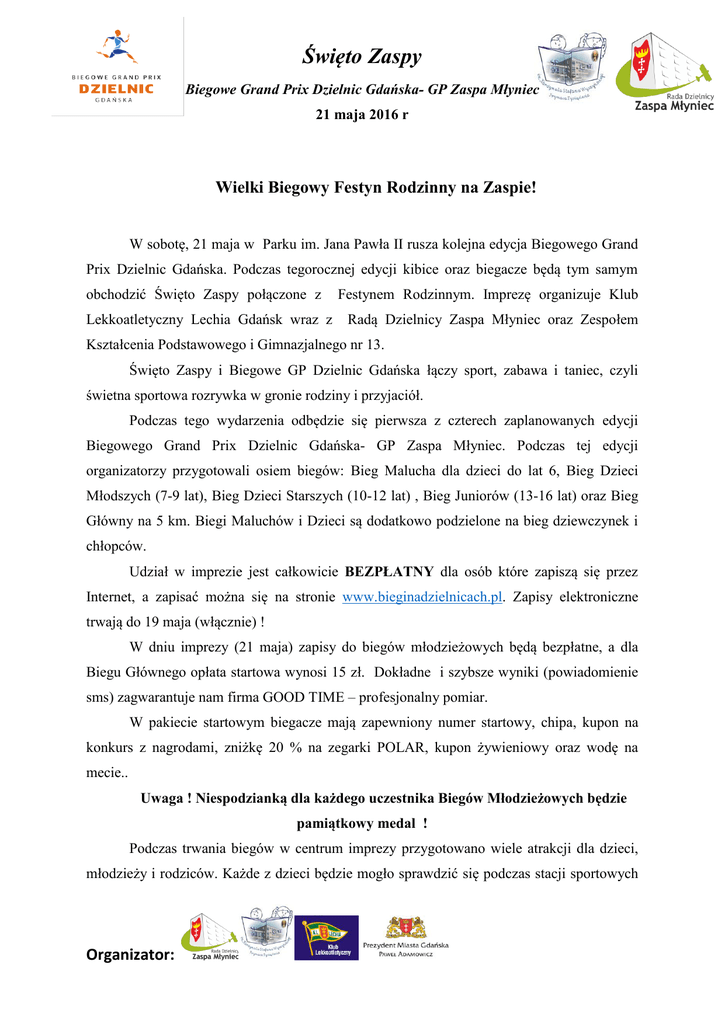 Święto Zaspy Biegowe Grand Prix Dzielnic Gdańska- GP Zaspa Młyniec 21 maja 2016 r Wielki Biegowy Festyn Rodzinny na Zaspie! W sobotę, 21 maja w Parku im. Jana Pawła II rusza kolejna edycja Biegowego Grand Prix Dzielnic Gdańska. Podczas tegorocznej edycji kibice oraz biegacze będą tym samym obchodzić Święto Zaspy połączone z Lekkoatletyczny Lechia Gdańsk wraz z Festynem Rodzinnym. Imprezę organizuje Klub Radą Dzielnicy Zaspa Młyniec oraz Zespołem Kształcenia Podstawowego i Gimnazjalnego nr 13. Święto Zaspy i Biegowe GP Dzielnic Gdańska łączy sport, zabawa i taniec, czyli świetna sportowa rozrywka w gronie rodziny i przyjaciół. Podczas tego wydarzenia odbędzie się pierwsza z czterech zaplanowanych edycji Biegowego Grand Prix Dzielnic Gdańska- GP Zaspa Młyniec. Podczas tej edycji organizatorzy przygotowali osiem biegów: Bieg Malucha dla dzieci do lat 6, Bieg Dzieci Młodszych (7-9 lat), Bieg Dzieci Starszych (10-12 lat) , Bieg Juniorów (13-16 lat) oraz Bieg Główny na 5 km. Biegi Maluchów i Dzieci są dodatkowo podzielone na bieg dziewczynek i chłopców. Udział w imprezie jest całkowicie BEZPŁATNY dla osób które zapiszą się przez Internet, a zapisać można się na stronie www.bieginadzielnicach.pl. Zapisy elektroniczne trwają do 19 maja (włącznie) ! W dniu imprezy (21 maja) zapisy do biegów młodzieżowych będą bezpłatne, a dla Biegu Głównego opłata startowa wynosi 15 zł. Dokładne i szybsze wyniki (powiadomienie sms) zagwarantuje nam firma GOOD TIME – profesjonalny pomiar. W pakiecie startowym biegacze mają zapewniony numer startowy, chipa, kupon na konkurs z nagrodami, zniżkę 20 % na zegarki POLAR, kupon żywieniowy oraz wodę na mecie.. Uwaga ! Niespodzianką dla każdego uczestnika Biegów Młodzieżowych będzie pamiątkowy medal ! Podczas trwania biegów w centrum imprezy przygotowano wiele atrakcji dla dzieci, młodzieży i rodziców. Każde z dzieci będzie mogło sprawdzić się podczas stacji sportowych Organizator: Święto Zaspy Biegowe Grand Prix Dzielnic Gdańska- GP Zaspa Młyniec 21 maja 2016 r przygotowanych przez ZKPiG nr 13. Każde dziecko, które ukończy wszystkie stacje sportowe otrzyma nagrodę! Dostępne będą również punkty Straży Miejskiej –na których odbywać się będą animacje dotyczące bezpieczeństwa, Krew Aktywni zapewnią pomiar ciśnienia oraz przeprowadzą zbiórkę dawców szpiku, a Foot Comfort – pomiar stóp. Pojawi się również punkt sklepu runnersclub.pl, Orange oraz atrakcje z Galerii Zaspa. Na miejscu będzie można rozkoszować się świeżymi wypiekami przygotowanymi specjalnie na tą okazję przez uczniów szkoły ZKPiG nr 13. Dla zawodników przewidziany jest również ciepły posiłek z Baru Kalinka. Całość obywać się będzie w piknikowej formie, wiec warto zabrać ze sobą kocyk i odprężyć się po całym tygodniu pracy. Jak co roku, dla wszystkich uczestników imprezy przygotowano atrakcyjne nagrody. W tym roku będą to nagrody ufundowane przez Orange, Galerię Zaspa, RunnersClub.pl. W nagrodach czekać będą między innymi wejściówki do Loopy’s World, Green Club, Pitstop Gdańsk, pakiety naturalnych kosmetyków od Forever, zniżki na zegarki Polar, pakiet odżywek oraz bony do GreenPub. Warto namówić dzieci do wzięcia udziału w Klasyfikacji Szkół, której sponsorem głównym jest Loopys’ World. Uczniowie szkoły podstawowej, która w klasyfikacji generalnej zdobędzie najwięcej punktów otrzymają atrakcyjne nagrody ( dokładny spis nagród dostępny na naszej stronie) ! Nowością jest Klasyfikacja Dzielnic Radia Gdańsk. W każdej edycji najlepsza kobieta i mężczyzna (zamieszkujący dzielnicę, na której odbywa się dana edycja) w Biegu Głównym otrzyma upominek od Radia Gdańsk. Razem z Fundacją Mam Marzenie powalczymy o spełnienie marzenia Marty, która marzy o wyjeździe do Grecji szlakiem greckim! K. Na miejscu będzie można wesprzeć dowolną kwotą ten cel, a dodatkowo odbędą się licytacje, w których m.in. Koszulki Biegowe Nigdy nie przestawaj marzyć, słuchawki, Rolki oraz Vouchery na siłownie. W trakcie tegorocznych edycji wolontariusze Fundacji Mam Marzenie będą prowadzić zbiórkę fantów na potrzeby statutowe działania Fundacji. Organizator: Święto Zaspy Biegowe Grand Prix Dzielnic Gdańska- GP Zaspa Młyniec 21 maja 2016 r Wszystkie informacje dostępne na stronie www.bieginadzielnicach.pl Zapraszamy już dziś ! Organizatorzy: Klub Lekkoatletyczny Lechia Gdańsk, Rada Dzielnicy Zaspa Młyniec, Zespół Kształcenia Podstawowego i Gimnazjalnego Partner oficjalny: Ministerstwo Sportu i Turystyki Partner: Dział ds. Promocji Miasta Gdańska, Fundacja Mam Marzenie, Biegowy Świat, Europejska Fundacja KrewAktywni, GOKF, Straż Miejska, ZTM Patronat Honorowy: Prezydent Gdańska Pan Paweł Adamowicz Sponsor Biegów Młodzieżowych: Loopy’s World Sponsor edycji: Budimex Nieruchomości, Galeria Zaspa, Orange Organizator: Święto Zaspy Biegowe Grand Prix Dzielnic Gdańska- GP Zaspa Młyniec 21 maja 2016 r Zdjęcia: Słodkowski Fotografia Sponsorzy: RunnersClub.pl, Newline, Loopy’s World, Polar, Pitstop Gdańsk, Forever, Gdańskie Melioracje, Acel, Witograf,, Green Club, Primavera, Patroni medialni: Trójmiasto.pl, Radio Gdańsk. oraz Magazyn Together, Wydarzysie.pl Partnerzy logistyczni : Zarząd Dróg i Zieleni, Zarząd Transportu Miejskiego, Regionalne Centrum Wolontariatu Gdańsk , Good Time – profesjonalny pomiar czasu Organizator:
