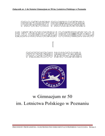 Załącznik nr .1 do Statutu Gimnazjum nr 50 im. Lotnictwa Polskiego w Poznaniu w Gimnazjum nr 50 im. Lotnictwa Polskiego w Poznaniu PROCEDURY PROWADZENIA ELEKTRONICZNEJ DOKUMENTACJI PRZEBIEGU NAUCZANIA Strona 1 Spis treści PODSTAWA PRAWNA 3 ROZDZIAŁ I. POSTANOWIENIA OGÓLNE 3 ROZDZIAŁ II. KONTA W DZIENNIKU ELEKTRONICZNYM 4 ROZDZIAŁ III. PRZEKAZYWANIE INFORMACJI W DZIENNIKU ELEKTRONICZNYM 7 ROZDZIAŁ IV. ADMINISTRATOR VULCAN SERVICE 8 ROZDZIAŁ V. SZKOLNY ADMINISTRATOR DZIENNIKA ELEKTRONICZNEGO 8 ROZDZIAŁ VI. DYREKTOR SZKOŁY 11 ROZDZIAŁ VII. WYCHOWAWCA KLASY 11 ROZDZIAŁ VIII. NAUCZYCIEL 13 ROZDZIAŁ IX. SEKRETARIAT 16 ROZDZIAŁ X. RODZICE – PRAWNI OPIEKUNOWIE 17 ROZDZIAŁ XI. UCZEŃ 17 ROZDZIAŁ XII. POSTĘPOWANIE W CZASIE AWARII 18 ROZDZIAŁ XIII. POSTANOWIENIA KOŃCOWE 19 PROCEDURY PROWADZENIA ELEKTRONICZNEJ DOKUMENTACJI PRZEBIEGU NAUCZANIA Strona 2 PODSTAWA PRAWNA Na podstawie: Rozporządzenia Ministra Edukacji Narodowej i Sportu z dnia 19 lutego 2002r sprawie sposobu prowadzenia przez publiczne przedszkola, szkoły i placówki dokumentacji przebiegu nauczania, działalności wychowawczej i opiekuńczej oraz rodzajów tej dokumentacji (Dz. U. Nr 23, poz. 225 oraz z 2003 r. Nr 107, poz. 1003). Art. 23 p.1 ust. 2 ustawy z dnia 29 sierpnia 1997 r. o ochronie danych osobowych. (tekst jednolity: Dz. U. 2002 r. Nr 101 poz. 926, ze zm.) Rozporządzenie Ministra Edukacji Narodowej z dnia 16 lipca 2009 r. zmieniające rozporządzenie w sprawie sposobu prowadzenia przez publiczne przedszkola, szkoły i placówki dokumentacji przebiegu nauczania, działalności wychowawczej i opiekuńczej oraz rodzajów tej dokumentacji (Dz. U. Nr 116 poz. 977) ROZDZIAŁ I. POSTANOWIENIA OGÓLNE 1. W szkole, za pośrednictwem strony https://uonetplus.vulcan.net.pl/poznan, funkcjonuje elektroniczny dziennik. Oprogramowanie to oraz usługi z nim związane dostarczane są przez firmę zewnętrzną, współpracującą ze szkołą. Podstawą działania dziennika elektronicznego jest umowa podpisana przez Dyrektora Szkoły i uprawnionego przedstawiciela firmy dostarczającej i obsługującej system dziennika elektronicznego. 2. Za niezawodność działania systemu, ochronę danych osobowych mieszczonych na serwerach oraz tworzenie kopii bezpieczeństwa, odpowiada firma nadzorująca pracę dziennika internetowego, pracownicy szkoły którzy mają bezpośredni dostęp do edycji przeglądania danych oraz rodzice w zakresie udostępnionych im danych. Szczegółową odpowiedzialność obu stron reguluje zawarta pomiędzy stronami umowa oraz przepisy obowiązującego w Polsce prawa. 3. Na podstawie Ustawy o przechowywaniu i przetwarzaniu danych osobowych: Art. 23 p.1 ust. 2 ustawy z dnia 29 sierpnia 1997 r. o ochronie danych osobowych. (tekst jednolity: Dz. U. 2002 r. Nr 101 poz. 926, ze zm.)Dyrektor szkoły nie jest zobligowany do zbierania zgody na przetwarzania danych osobowych w związku z obowiązkami wynikającymi z: Rozporządzenia Ministra Edukacji Narodowej i sportu z dnia 19 lutego 2002r sprawie sposobu prowadzenia przez publiczne przedszkola, szkoły i placówki dokumentacji przebiegu nauczania, działalności wychowawczej i opiekuńczej oraz rodzajów tej dokumentacji (Dz. U. Nr 23, poz. 225 oraz z 2003 r. Nr 107, poz. 1003). 4. Administratorem danych osobowych jest Gimnazjum nr 50 im. Lotnictwa Polskiego w Poznaniu, ul. Ściegiennego 10, 60-128 Poznań. 5. Celem przetwarzania danych osobowych jest realizacja obowiązków wynikających z Rozporządzenia Ministra Edukacji Narodowej i sportu z dnia 19 lutego 2002r sprawie sposobu prowadzenia przez publiczne przedszkola, szkoły i placówki dokumentacji przebiegu nauczania, działalności wychowawczej i opiekuńczej oraz rodzajów tej dokumentacji (Dz. U. Nr 23, poz. 225 oraz z 2003 r. Nr 107, poz. 1003). 6. Każdy rodzic (prawny opiekun) po zalogowaniu się na swoim koncie ma zgodnie z Ustawą z dnia 29 sierpnia 1997 o Ochronie Danych Osobowych, dostęp do raportu o zawartych w systemie danych o: a) Informacji identyfikujących osobę (swoje dziecko). b) Informacji z zakresu § 7 ust. 1 pkt. 1, 2, 3, 5 rozporządzenia Ministra Spraw Wewnętrznych i Administracji z dnia 29 kwietnia 2004r 7. Rodzicom na pierwszym zebraniu w nowym roku szkolnym zapewnia się możliwość zapoznania się ze sposobem działania i funkcjonowania dziennika elektronicznego. 8. Wewnątrzszkolny System Oceniania jest dostępny na stronie internetowej szkoły. 9. Zasady korzystania z dziennika elektronicznego przez rodziców (prawnych opiekunów), uczniów oraz pracowników szkoły określone są w umowie zawartej pomiędzy firmą PROCEDURY PROWADZENIA ELEKTRONICZNEJ DOKUMENTACJI PRZEBIEGU NAUCZANIA Strona 3 zewnętrzną dostarczającą system dziennika elektronicznego a placówką szkolną, z zastrzeżeniem, że rodzicowi przysługuje prawo bezpłatnego dostępu do informacji o swoim dziecku. ROZDZIAŁ II. KONTA W DZIENNIKU ELEKTRONICZNYM 1. Każdy użytkownik posiada własne konto w systemie dziennika elektronicznego, za które osobiście odpowiada. Szczegółowe zasady dla poszczególnych kont opisane są w poszczególnych rozdziałach tego dokumentu. 2. Użytkownik jest zobowiązany dbać o zasady bezpieczeństwa w posługiwaniu się loginem i hasłem do systemu, które poznał na szkoleniu (nauczyciele na radzie pedagogicznej, rodzice na zebraniu). 3. Nauczyciel musi mieć świadomość, że poprzez login, hasło jest identyfikowany, w systemie dziennika elektronicznego. 4. Hasło umożliwiające dostęp do zasobów sieci każdy użytkownik (Szkolny Administrator Dziennika Elektronicznego, Dyrektor Szkoły, Wychowawca Klasy, Nauczyciel, Pracownik Sekretariatu, Rodzic, Uczeń) utrzymuje w tajemnicy również po upływie ich ważności. 5. W przypadku utraty hasła lub podejrzenia, że zostało odczytane/wykradzione przez osobę nieuprawnioną, użytkownik zobowiązany jest do natychmiastowej zmiany hasła i osobistego poinformowania o tym fakcie SZKOLNEGO ADMINISTRATORA DZIENNI