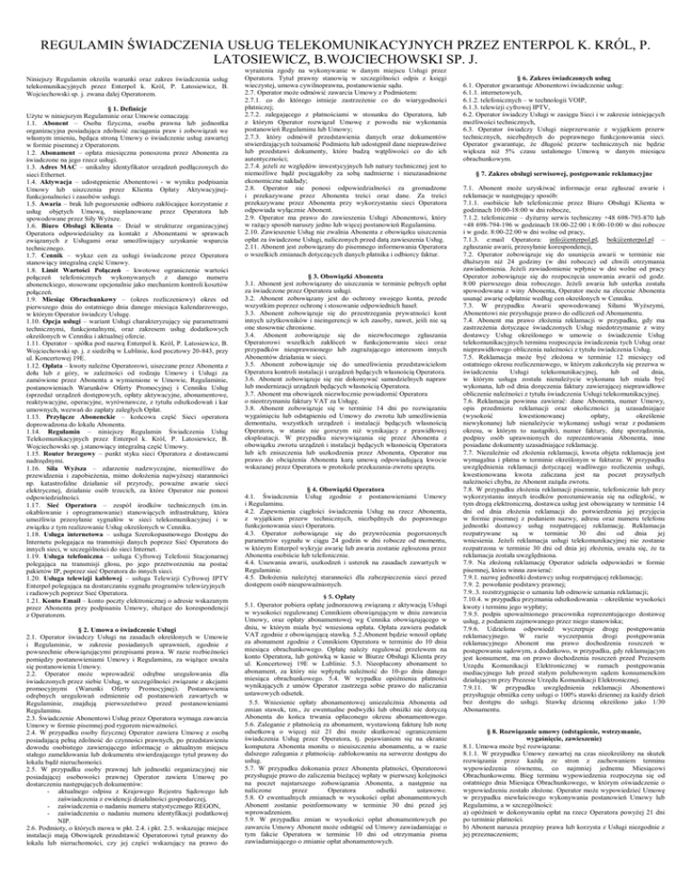 REGULAMIN ŚWIADCZENIA USŁUG TELEKOMUNIKACYJNYCH PRZEZ ENTERPOL K. KRÓL, P. LATOSIEWICZ, B.WOJCIECHOWSKI SP. J. Niniejszy Regulamin określa warunki oraz zakres świadczenia usług telekomunikacyjnych przez Enterpol k. Król, P. Latosiewicz, B. Wojciechowski sp. j. zwana dalej Operatorem. § 1. Definicje Użyte w niniejszym Regulaminie oraz Umowie oznaczają: 1.1. Abonent – Osoba fizyczna, osoba prawna lub jednostka organizacyjna posiadająca zdolność zaciągania praw i zobowiązań we własnym imieniu, będąca stroną Umowy o świadczenie usług zawartej w formie pisemnej z Operatorem. 1.2. Abonament – opłata miesięczna ponoszona przez Abonenta za świadczone na jego rzecz usługi. 1.3. Adres MAC – unikalny identyfikator urządzeń podłączonych do sieci Ethernet. 1.4. Aktywacja – udostępnienie Abonentowi - w wyniku podpisania Umowy lub uiszczenia przez Klienta Opłaty Aktywacyjnejfunkcjonalności i zasobów usługi. 1.5. Awaria – brak lub pogorszenie odbioru zakłócające korzystanie z usług objętych Umową, nieplanowane przez Operatora lub spowodowane przez Siły Wyższe. 1.6. Biuro Obsługi Klienta – Dział w strukturze organizacyjnej Operatora odpowiedzialny za kontakt z Abonentami w sprawach związanych z Usługami oraz umożliwiający uzyskanie wsparcia technicznego. 1.7. Cennik – wykaz cen za usługi świadczone przez Operatora stanowiący integralną część Umowy. 1.8. Limit Wartości Połączeń – kwotowe ograniczenie wartości połączeń telefonicznych wykonywanych z danego numeru abonenckiego, stosowane opcjonalnie jako mechanizm kontroli kosztów połączeń. 1.9. Miesiąc Obrachunkowy – (okres rozliczeniowy) okres od pierwszego dnia do ostatniego dnia danego miesiąca kalendarzowego, w którym Operator świadczy Usługę. 1.10. Opcja usługi – wariant Usługi charakteryzujący się parametrami technicznymi, funkcjonalnymi, oraz zakresem usług dodatkowych określonych w Cenniku i aktualnej ofercie. 1.11. Operator – spółka pod nazwą Enterpol k. Król, P. Latosiewicz, B. Wojciechowski sp. j. z siedzibą w Lublinie, kod pocztowy 20-843, przy ul. Koncertowej 19E. 1.12. Opłata – kwoty należne Operatorowi, uiszczane przez Abonenta z dołu lub z góry, w zależności od rodzaju Umowy i Usługi za zamówione przez Abonenta a wymienione w Umowie, Regulaminie, postanowieniach Warunków Oferty Promocyjnej i Cenniku Usług (sprzedaż urządzeń dostępowych, opłaty aktywacyjne, abonamentowe, reaktywacyjne, operacyjne, wyrównawcze, z tytułu odszkodowań i kar umownych, wezwań do zapłaty zaległych Opłat. 1.13. Przyłącze Abonenckie – końcowa część Sieci operatora doprowadzona do lokalu Abonenta. 1.14. Regulamin – niniejszy Regulamin Świadczenia Usług Telekomunikacyjnych przez Enterpol k. Król, P. Latosiewicz, B. Wojciechowski sp. j.stanowiący integralną część Umowy. 1.15. Router brzegowy – punkt styku sieci Operatora z dostawcami nadrzędnymi. 1.16. Siła Wyższa – zdarzenie nadzwyczajne, niemożliwe do przewidzenia i zapobieżenia, mimo dołożenia najwyższej staranności np. katastrofalne działanie sił przyrody, poważne awarie sieci elektrycznej, działanie osób trzecich, za które Operator nie ponosi odpowiedzialności. 1.17. Sieć Operatora – zespół środków technicznych (m.in. okablowanie i oprogramowanie) stanowiących infrastrukturę, która umożliwia przesyłanie sygnałów w sieci telekomunikacyjnej i w związku z tym realizowanie Usług określonych w Cenniku. 1.18. Usługa internetowa – usługa Szerokopasmowego Dostępu do Internetu polegająca na transmisji danych poprzez Sieć Operatora do innych sieci, w szczególności do sieci Internet. 1.19. Usługa telefoniczna – usługa Cyfrowej Telefonii Stacjonarnej polegająca na transmisji głosu, po jego przetworzeniu na postać pakietów IP, poprzez sieć Operatora do innych sieci. 1.20. Usługa telewizji kablowej – usługa Telewizji Cyfrowej IPTV Enterpol polegająca na dostarczaniu sygnału programów telewizyjnych i radiowych poprzez Sieć Operatora. 1.21. Konto Email – konto poczty elektronicznej o adresie wskazanym przez Abonenta przy podpisaniu Umowy, służące do korespondencji z Operatorem. § 2. Umowa o świadczenie Usługi 2.1. Operator świadczy Usługi na zasadach określonych w Umowie i Regulaminie, w zakresie posiadanych uprawnień, zgodnie z powszechnie obowiązującymi przepisami prawa. W razie rozbieżności pomiędzy postanowieniami Umowy i Regulaminu, za wiążące uważa się postanowienia Umowy. 2.2. Operator może wprowadzić odrębne uregulowania dla świadczonych przez siebie Usług, w szczególności związane z akcjami promocyjnymi (Warunki Oferty Promocyjnej). Postanowienia odrębnych uregulowań odmiennie od postanowień zawartych w Regulaminie, znajdują pierwszeństwo przed postanowieniami Regulaminu. 2.3. Świadczenie Abonentowi Usług przez Operatora wymaga zawarcia Umowy w formie pisemnej pod rygorem nieważności. 2.4. W przypadku osoby fizycznej Operator zawiera Umowę z osobą posiadającą pełną zdolność do czynności prawnych, po przedstawieniu dowodu osobistego zawierającego informację o aktualnym miejscu stałego zameldowania lub dokumentu stwierdzającego tytuł prawny do lokalu bądź nieruchomości. 2.5. W przypadku osoby prawnej lub jednostki organizacyjnej nie posiadającej osobowości prawnej Operator zawiera Umowę po dostarczeniu następujących dokumentów: - aktualnego odpisu z Krajowego Rejestru Sądowego lub zaświadczenia z ewidencji działalności gospodarczej, - zaświadczenia o nadaniu numeru statystycznego REGON, - zaświadczeniu o nadaniu numeru identyfikacji podatkowej NIP. 2.6. Podmioty, o których mowa w pkt. 2.4. i pkt. 2.5. wskazując miejsce instalacji mają Obowiązek przedstawić Operatorowi tytuł prawny do lokalu lub nieruchomości, czy jej części wskazujący na prawo do wyrażenia zgody na wykonywanie w danym miejscu Usługi przez Operatora. Tytuł prawny stanowi