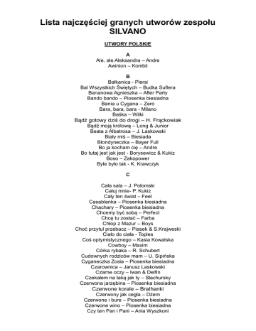 Lista najczęściej granych utworów zespołu SILVANO UTWORY POLSKIE A Ale, ale Aleksandra – Andre Awinion – Kombii B Bałkanica - Piersi Bal Wszystkich Świętych – Budka Suflera Bananowa Agnieszka – After Party Bando bando – Piosenka biesiadna Bania u Cygana – Zero Bara, bara, bara - Milano Baśka – Wilki Bądź gotowy dziś do drogi – H. Frąckowiak Bądź moją królową – Long & Junior Beata z Albatrosa – J. Laskowski Biały miś – Biesiada Blondyneczka – Bayer Full Bo ja kocham cię – Andre Bo tutaj jest jak jest - Borysewicz & Kukiz Boso – Zakopower Byle było tak - K. Krawczyk C Cała sala – J. Połomski Całuj mnie- P. Kukiz Cały ten świat – Feel Casablanka – Piosenka biesiadna Chachary – Piosenka biesiadna Chcemy być sobą – Perfect Chcę tu zostać – Farba Chłop z Mazur – Boys Choć przytul przebacz – Piasek & S.Krajweski Ciało do ciała - Toples Coś optymistycznego – Kasia Kowalska Cowboy – Maxim Córka rybaka – R. Schubert Cudownych rodziców mam – U. Sipińska Cyganeczka Zosia – Piosenka biesiadna Czarownica – Janusz Laskowski Czarne oczy – Iwan & Delfin Czekałem na taką jak ty – Stachursky Czerwona jarzębina – Piosenka biesiadna Czerwone korale – Brathanki Czerwony jak cegła – Dżem Czerwone i bure – Piosenka biesiadna Czerwone wino – Piosenka biesiadna Czy ten Pan i Pani – Ania Wyszkoni D Daj mi tę noc - Bolter Do końca moich dni – Stachursky Do kołyski - Dżem Dwadzieścia lat a może mniej – J. Lech Dwie bajki - Doda Dżaga – Doda E Ela (Złoty Deszcz) – D. Bomb F Facet to świnia – Big Cyc G Gaz, gaz – Big Dance Gdybym miał gitarę – Piosenka biesiadna Gdy zapłaczesz – Stachursky Gdzie jest Ola – Papa Dance Gdzie ten który powie mi - Brathanki Góralu czy ci nie żal – Piosenka biesiadna Głęboka studzienka - Piosenka biesiadna Guma – Big Cyc H Helenka – Long & Junior Hej bystra woda – Piosenka biesiadna Hej szalała, szalała – Krywań Hi Fi – Wanda i Banda Historia jednej znajomości – Czerwone Gitary I Inna dziewczyna - Boys J Ja chcę mieć żonę – Jorgus Jak anioła głos – Feel Jasnowłosa - Milano Jak w niebie – Stachursky Jedwab - Stachursky Jej dotyk – Mig Jestem obok ciebie – Universe Jesteś szalona – Boys Jest już ciemno- Feel Jeśli tylko chcesz – Borysewicz & Kukiz Jolka, Jolka pamiętasz – Budka Suflera K Kapitańskie tango – Alibabki Kawiarenki – Irena Jarocka Kochać cię – Kombi Kocham cię jak Irlandię – Kobranocka Kochana uwierz mi - Boys Kolorowa sukienka – Long & Junior Kolorowe Jarmarki – J. Laskowski Konik na biegunach – Urszula Kormorany – P. Sczepanik Kocham cię kochanie moje – Maanam Kołysanka – Sumptuastic L La Paloma – Instrumentalny Lato w Kołobrzegu - Skaner Lekcja miłości – Maxel Lornetka - Golec u Orkiestra Ł Ławka – F.N.S. M Magiczne słowa - Ziyo Małe szczęścia- R. Janson Maniuśka – Piosenka biesiadna Mniej niż zero – Lady Pank Matura – Czerwone Gitary Mary Lou – E. Presley Miasto budzi się – Paweł Kukiz Miód Malina - Mig Mix Fiesta – Piosenka biesiadna Małgośka – M. Rodowicz Małolata – Vabank Moja wolność – Skaner Moje jedyne marzenie – A. Jantar Mój jest ten kawałek podlogi – Mr Zoob Mój przyjacielu – K. Krawczyk My Słowianie – Donatan & Kleo Mydełko Fa – M.Kondrat faet M. Drozdowska Myślę o Tobie – Kombii Myśli i słowa - Bajm N Na jednego – Piosenka biesiadna Na zamku – As Na zawsze i na wieczność - Wilki Nadzieja – Skaner Najpiękniejsza – S. Krajewski Nastolatka – Vabank Nasze randez`vouse – Kombii Nie daj się - Doda Nie kłam że kochasz mnie – Ł. Zagrobelny, E. Flinta Nie płacz Ewka- Perfect Niech żyje bal – M. Rodowicz Niecierpliwi – R. Chojnacki & Piasek Niewiara – Piękni i Młodzi Nie daj życziu się – After Party Nie ma mocnych na Mariolę – Mig Nie mogę ci wiele dać – Perfect Nie zabieraj mi strun - Maxel Niedziela będzie dal nas – Niebiesko Czarni Nieodporny rozum – Ewelina Lisowska Nogi – Czarno Czarni Noc po ciężkim dniu - Bajm Nocna jazda – Q. Bass O Oczarowałaś mnie – Akcent O Hela – P. Kukiz O miła moja – Top One Od dziś – Paula Ona i Ja – Universe Ona jest taka cudowna – Piękni i Młodzi Ona lubi pomarańcze – After Party Ona tańczy dla mnie – Weekend Opolskie dziołchy – Czerwone Gitary Ore, ore – Piosenka biesiadna Ostatnia nocka – M.Maleńczuk P Panno Walerciu – Piosenka biesiadna Parostatek – K. Krawczyk Piękna Młoda - Tomo Piękniejsza – K.A.S.A Pociąg z daleka – R. Rynkowski Pod laskiem zielonym – Piosenka biesiadna Pokaż na co cię stać - Feel Pokolenie – Kombii Poszła Karolinka – Piosenka biesiadna Powiedz – Ich Troje Prawie do nieba – R. Chojnacki Pszczółka Maja sobie lata – Akcent Prawy do lewego – Kayah Promienie – Tarzan Boy Prócz ciebie nic – Kiljański & Kajah Prześliczna wiolonczelistka – Skaldowie Przez twe oczy zielone - Akcent Prywatki – W. Gąsowski Przyjaciel od zaraz – K. Paschalska Przez twe oczy zielone – Akcent Puste słowa – Milano R Radio hello – Eney Radość najpiękniejszych lat – Anna Jantar Rezerwa – Piosenka biesiadna Remedium – Maryla Rodowicz Rock & Roll – H. Frąckowiak Ruda tańczy jak szalona – Czadoman Rudy rydz – Helena Majdaniec Rudy się żeni – Big Cyc S Sąsiadka – Toples Seksualna – Q-Bass Sen się spełni – Kombii Serduszko puka w rytmie cha-cha – M. Koterbska Skrzydlate rence – Eney Słodkiego miłego życia – Kombi Słowa – G. Andrzejewicz Soft – Video feat A.Wyszkoni Statki na niebie -De Mono Suknie kolorowe – Lider Szansa - Doda Szczęśliwej drogi – R. Rynkowski Szalona Ruda – Dj Disco & Mc Polo Szła dzieweczka – Piosenka biesiadna Ś Ściernisko – Golec Orkiestra Ślad – Kombii Śniadanie do łóżka - Piasek Świat według Kiepskich – Big Cyc Świat się pomylił – P. Markowska