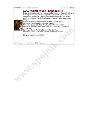 IMPREZY | Koncerty muzyczne 03 Lutego 2015 LARA FABIAN W USA i KANADZIE !!! m Z obywatelstwa Kanadyjka, z urodzenia Belgijka, z pochodzenia Włoszka śpiewa po francusku, włosku i angielsku. Czasami także po rosyjsku, portugalsku, hiszpańsku, grecku, niemiecku i hebrajsku. Sprzedała ponad 12 milionów płyt. Piękna kobieta, wspaniały głos. Nie przegap okazji! 21 marca - Borgata Event Center, Atlantic City, NJ, USA. 23 marca - Place Des Arts, Montreal, Kanada. 26 marca - Queen Elizabeth Theatre, Toronto, ON, Kanada. 28 marca - Seminole Hard Rock Hotel and Casino, Fort Lauderdale, Florida, USA. 31 marca - Saban Theatre, Beverly Hills, CA, USA. 2 kwietnia - River Rock Show Theatre, Richmond, Kanada. w w w .s po jn ik Les Productions Clandestine, USA - Kanada .c o Bilety do kupienia >>>TUTAJ