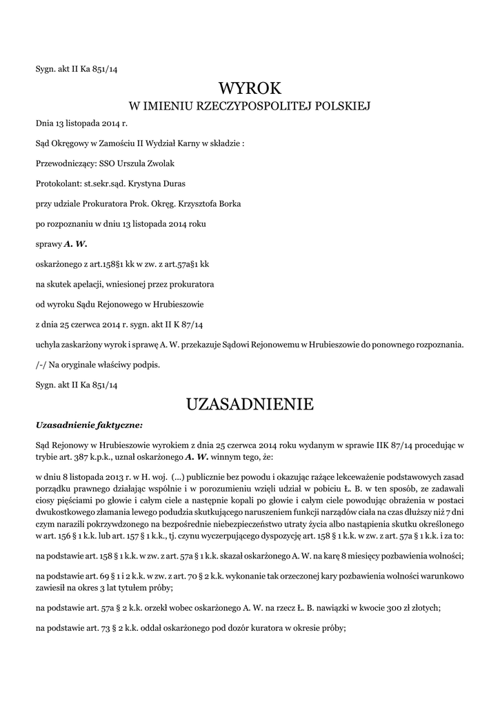 Sygn. akt II Ka 851/14 WYROK W IMIENIU RZECZYPOSPOLITEJ POLSKIEJ Dnia 13 listopada 2014 r. Sąd Okręgowy w Zamościu II Wydział Karny w składzie : Przewodniczący: SSO Urszula Zwolak Protokolant: st.sekr.sąd. Krystyna Duras przy udziale Prokuratora Prok. Okręg. Krzysztofa Borka po rozpoznaniu w dniu 13 listopada 2014 roku sprawy A. W. oskarżonego z art.158§1 kk w zw. z art.57a§1 kk na skutek apelacji, wniesionej przez prokuratora od wyroku Sądu Rejonowego w Hrubieszowie z dnia 25 czerwca 2014 r. sygn. akt II K 87/14 uchyla zaskarżony wyrok i sprawę A. W. przekazuje Sądowi Rejonowemu w Hrubieszowie do ponownego rozpoznania. /-/ Na oryginale właściwy podpis. Sygn. akt II Ka 851/14 UZASADNIENIE Uzasadnienie faktyczne: Sąd Rejonowy w Hrubieszowie wyrokiem z dnia 25 czerwca 2014 roku wydanym w sprawie IIK 87/14 procedując w trybie art. 387 k.p.k., uznał oskarżonego A. W. winnym tego, że: w dniu 8 listopada 2013 r. w H. woj. (...) publicznie bez powodu i okazując rażące lekceważenie podstawowych zasad porządku prawnego działając wspólnie i w porozumieniu wzięli udział w pobiciu Ł. B. w ten sposób, ze zadawali ciosy pięściami po głowie i całym ciele a następnie kopali po głowie i całym ciele powodując obrażenia w postaci dwukostkowego złamania lewego podudzia skutkującego naruszeniem funkcji narządów ciała na czas dłuższy niż 7 dni czym narazili pokrzywdzonego na bezpośrednie niebezpieczeństwo utraty życia albo nastąpienia skutku określonego w art. 156 § 1 k.k. lub art. 157 § 1 k.k., tj. czynu wyczerpującego dyspozycję art. 158 § 1 k.k. w zw. z art. 57a § 1 k.k. i za to: na podstawie art. 158 § 1 k.k. w zw. z art. 57a § 1 k.k. skazał oskarżonego A. W. na karę 8 miesięcy pozbawienia wolności; na podstawie art. 69 § 1 i 2 k.k. w zw. z art. 70 § 2 k.k. wykonanie tak orzeczonej kary pozbawienia wolności warunkowo zawiesił na okres 3 lat tytułem próby; na podstawie art. 57a § 2 k.k. orzekł wobec oskarżonego A. W. na rzecz Ł. B. nawiązki w kwocie 300 zł złotych; na podstawie art. 73 § 2 k.k. oddał oskarżonego pod dozór kuratora w okresie próby; na podstawie art. 624 § 1 k.p.k. zwolnił oskarżonego od obowiązku ponoszenia kosztów sądowych. Apelację od tego wyroku wywiódł Prokurator Rejonowy w Hrubieszowie. Na podstawie art. 425 § 1 i 2 k.p.k. oraz art. 444 k.p.k. zaskarżył wyrok w części dotyczącej orzeczenia o karze na niekorzyść oskarżonego A. W.. Powołując się na treść art. 438 pkt 1 i 2 k.p.k. wyrokowi temu zarzucił: 1). obrazę przepisów prawa materialnego, a mianowicie art. 69 § 4 k.k., poprzez nie wskazanie tego przepisu w podstawie zawieszenia orzeczonej wobec oskarżonego kary pozbawienia wolności, w sytuacji gdy przepis ten warunkuje zastosowanie dobrodziejstwa warunkowego zawieszenia kary pozbawienia wolności dla sprawców występku o charakterze chuligańskim; 2). obrazę przepisów postepowania, a mianowicie art. 387 § 1 i 2 k.p.k., polegającą na nie orzeczeniu wobec oskarżonego, obok innych rozstrzygnięć, również kary grzywny w wymiarze 50 stawek dziennych przy ustaleniu wysokości jednej stawki dziennej na kwotę 10 złotych, wbrew uzgodnionemu z oskarżonym i stronami, wnioskowi o wydanie wyroku skazującego bez przeprowadzania postępowania dowodowego w trybie art. 387 k.p.k., przewidującemu orzeczenie także i kary grzywny. Podnosząc te zarzuty skarżący na podstawie art. 437 § 1 i 2 k.p.k. wnosił o: uchylenie zaskarżonego orzeczenia i przekazanie sprawy do ponownego rozpoznania Sądowi Rejonowemu w Hrubieszowie. Uzasadnienie prawne: Sąd Okręgowy zważył, co następuje: Apelacja jest zasadna, chociaż rozbieżność pomiędzy wskazanym w niej zakresem zaskarżenia (w części dotyczącej orzeczenia o karze), a wnioskiem o uchylenie orzeczenia i przekazania sprawy do ponownego rozpoznania, powoduje konieczność dokonania analizy granic zaskarżenia, w celu prawidłowego określenia zakresu rozpoznania sprawy i ustalenia prawidłowej treści wyroku apelacyjnego, szczególnie, że apelacja pochodzi od podmiotu fachowego, jakim niewątpliwie jest prokurator. Na wstępie dywagacji odnoszący się do granic zaskarżenia wskazanych w apelacji, należy zauważyć, iż: granice środka odwoławczego są określone następującymi elementami: - jego kierunkiem; - zakresem zaskarżenia; - podniesionymi zarzutami, które apelację konkretyzują. Chociaż każdy z wymienionych powyżej elementów jest istotny dla określenia granic apelacji, to, zdaniem Sądu, najistotniejszym jest podniesiony zarzut, gdyż stanowi on jednocześnie rozwinięcie obu wcześniejszych elementów (kierunku i zakresu) w powiązaniu z zauważonymi i podnoszonymi uchybieniami, jakimi zdaniem skarżącego dotknięte jest kontestowane orzeczenie. Wniosek apelacyjny jest kompilacją wszystkich trzech elementów i winien z nich wprost wypływać. Nie ma jednak bezwzględnych reguł procesowych, które zabraniałyby uwzględnianie prawidłowych wniosków apelacyjnych w sytuacji, gdy wnioski te mają jednoznaczne oparcie w tym najistotniejszym elemencie – zarzucie, nawet w sytuacji gdy wskazane na wstępie apelacji jej kierunek i zakres są nieco węższe niż mające oparcie w zarzutach wnioski. Podsumowując powyższe rozważania należy przyjąć, iż apelacja wniesiona w niniejszej sprawie dotyczy całości zapadłego w sprawie wyroku. W odniesieniu do apelacji wniesionej w niniejszej sprawie, niewątpliwym jest, że podniesiony zarzut obrazy art. 387 § 1 i 2 k.p.k., a więc podstawy procesowej wydania orzeczenia jest na tyle doniosły, że niewątpliwie nie tylko mógł on mieć wpływ na treść zaskarżonego wyroku, a wpływ na ten wyrok bezwzględnie miał. Wyrok bowiem jest dotknięty istotną obrazą art. 387 § 1 i 2 k.p.k., której stwierdzenie skutkować może tylko i wyłącznie uchyleniem wyroku i przekazaniem sprawy w pełnym zakresie, Sądowi I instancji do ponownego rozpoznania. 