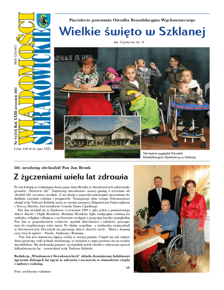 Pięciolecie powstania Ośrodka Rewalidacyjno-Wychowawczego Wielkie święto w Szklanej Nr 9 (255) Rok XXIII wrzesień 2011 ☞ Czytaj na str. 11 Cena 2,00 zł (w tym VAT) Tak będzie wyglądał Ośrodek Rehabilitacyjno-Opiekuńczy w Szklanej 102. urodziny obchodził Pan Jan Bronk Z życzeniami wielu lat zdrowia Po raz kolejny w rodzinnym domu pana Jana Bronka w Sierakowicach zabrzmiało gromkie „Dwieście lat!”. Najstarszy mieszkaniec naszej gminy 4 września obchodził 102. rocznicę urodzin. Z tej okazji z najserdeczniejszymi życzeniami do Jubilata zawitała rodzina i przyjaciele. Następnego dnia wizytę Solenizantowi złożył wójt Tadeusz Kobiela wraz ze swoim zastępcą Zbigniewem Fularczykiem i Teresą Skierka, kierownikiem Urzędu Stanu Cywilnego. Pan Jan urodził się w Karłowie 4 września 1909 r. jako jeden z piętnaściorga dzieci Józefa i Otylii Bronków. Rodzina Bronków była tradycyjną rodziną kaszubską, religijną i dbającą o zachowanie tradycji, a przy tym bardzo muzykalną. Pan Jan w gospodarstwie rodziców spędził dzieciństwo i młodość, pracując tam do trzydziestego roku życia. Po ślubie wspólnie z małżonką zamieszkali w Sierakowicach. Doczekali się pięciorga dzieci: dwóch córek – Marii i Joanny oraz trzech synów – Pawła, Andrzeja i Romana. – Pan Jan jest najstarszą żyjącą osobą w naszej gminie. Umysł ma jak najbardziej sprawny, ciało jednak niedomaga, w związku z czym porusza się na wózku inwalidzkim. Ma doskonałą pamięć, szczególnie jeżeli chodzi o zdarzenia sprzed kilkudziesięciu lat – powiedział wójt Tadeusz Kobiela. Redakcja „Wiadomości Sierakowickich” składa dostojnemu Jubilatowi życzenia dalszych lat życia w zdrowiu i szczęściu w atmosferze ciepła i miłości rodziny. AK Foto: archiwum rodzinne 2 WIADOMOŚCI SIERAKOWICKIE Dziesiąta sesja Rady Gminy Po przerwie wakacyjnej radni gminni zebrali się 6 września na kolejnej, dziesiątej już, sesji Rady Gminy. Wójt poinformował… 18 i 29 lipca w Gdańsku odbyło się spotkanie z Zarządem Dróg Wojewódzkich w sprawie wspólnej inwestycji polegającej na poprawie układu komunikacyjnego w obrębie dróg wojewódzkich 211 i 214 w Sierakowicach. Mowa o budowie świateł na skrzyżowaniu ulic Kartuskiej, Słupskiej i Lęborskiej w centrum wsi, jak też budowie planowanego ronda przy urzędzie gminy oraz budowy bezpiecznego przejścia dla pieszych obok wiaduktu kolejowego w stronę Wygody Sierakowskiej. Środki na realizację tych inwestycji w 75% będą pochodzić z Krajowej Rezerwy Wykonalności Regionalnego Programu Operacyjnego dla Województwa Pomorskiego. Pozostałe 25% sfinansują po połowie Gmina Sierakowice i samorząd Województwa Pomorskiego. Inwestycja byłaby realizowana w roku 2012 lub 2013. Jej szacunkowy koszt to ok. 11 mln zł. . 29 lipca odbył się konkurs na stanowisko dyrektora Zespołu Szkół w Gowidlinie, który nie zakończył się wyłonieniem kandydata. Zgłosiła się jedna osoba, pani Ewa Grucza, która przez ostatnie miesiące pełniła obowiązki dyrektora w placówce. – Każdy konkurs rozpoczyna się od sprawdzenia dokumentacji przedstawionej przez kandydatów – powiedział wójt Tadeusz Kobiela. – Komisja, w której zasiadali przedstawiciele samorządu, kuratorium, rady rodziców, związków zawodowych jednogłośnie odrzuciła kandydaturę na etapie przeglądania dokumentów. Okazało się, że pięć dokumentów nie spełniało wymogów prawnych. Niestety, nie można było dopuścić do przesłuchania jedynej kandydatki, ponieważ tak stanowią przepisy: jeśli dokumentacja jest niepełna, osoba podlega wykluczeniu. Na skutek tego postanowiłem powierzyć do końca czerwca 2012 roku pełnienie obowiązków dyrektora pani Aleksandrze Stark. Wójt poinformował radnych także, że kolejny konkurs na to stanowisko zostanie ogłoszony pod koniec maja lub w czerwcu przyszłego roku. . – 19 sierpnia miał miejsce przetarg na budowę skateparku, ale nie został rozstrzygnięty, gdyż nie zgłosił się żaden wykonawca – poinformował wójt. – Dwa tygodnie później ponowiliśmy przetarg i znowu nikt nie złożył oferty. Trwają w tej chwili negocjacje. Próbujemy rozmawiać z firmami, które mogłyby się tego podjąć, ale chętnych brakuje. Jeśli do końca września nie uda nam się znaleźć wykonawcy, trzeba będzie inwestycję przełożyć na przyszły rok. . Wójt poinformował także o rozstrzygniętym przetargu na rozbudowę Zespołu Szkół w Gowidlinie. Przetarg na realizację inwestycji wygrała firma Elwoz na kwotę 8.290.000 zł. Prace budowlane będą polegać na budowie nowego skrzydła dydaktycznego dla potrzeb gimnazjum oraz na remoncie istniejącej części szkoły. Pomoc finansowa dla jednostek samorządu terytorialnego Radni wyrazili zgodę na udzielenie pomocy finansowej jednostkom samorządu terytorialnego. Gmina Kartuzy zwróciła się z prośbą o wsparcie finansowe dla Muzeum Kaszubskiego w wysokości 1.000 zł na działalność statutową. Natomiast Powiatowi Kartuskiemu zostanie udzielona kwota w wysokości 136.000 zł na dodatkowe prace związane z budową drogi Sierakowice–Borucino. 9 (255) wrzesień 2011 W Mojuszu powstanie punkt przedszkolny Z dniem 1 listopada 2011 r. utworzony zostanie punkt przedszkolny przy Szkole Podstawowej w Mojuszu, którego organem prowadzącym jest Gmina Sierakowice. – Punkt przedszkolny w Mojuszu istnieje od prawie dwóch lat, ale do tej pory był prowadzony przez fundację Elementarz z Katowic – poinformował radnych Piotr Leszczyński, dyrektor ZEAS. – W ramach projektu prowadzonego przez fundację wyposażono pomieszczenia w Mojuszu pod istniejące przedszkole. Punkt przedszkolny spotkał się z bardzo dużym zainteresowaniem wśród mieszkańców Mojusza. W tej chwili uczęszcza tam 20 dzieci i warto, aby punkt działał dalej. Dzięki działalności punktu przedszkolnego zwiększy się dostęp do edukacji przedszkolnej dzieci w wie