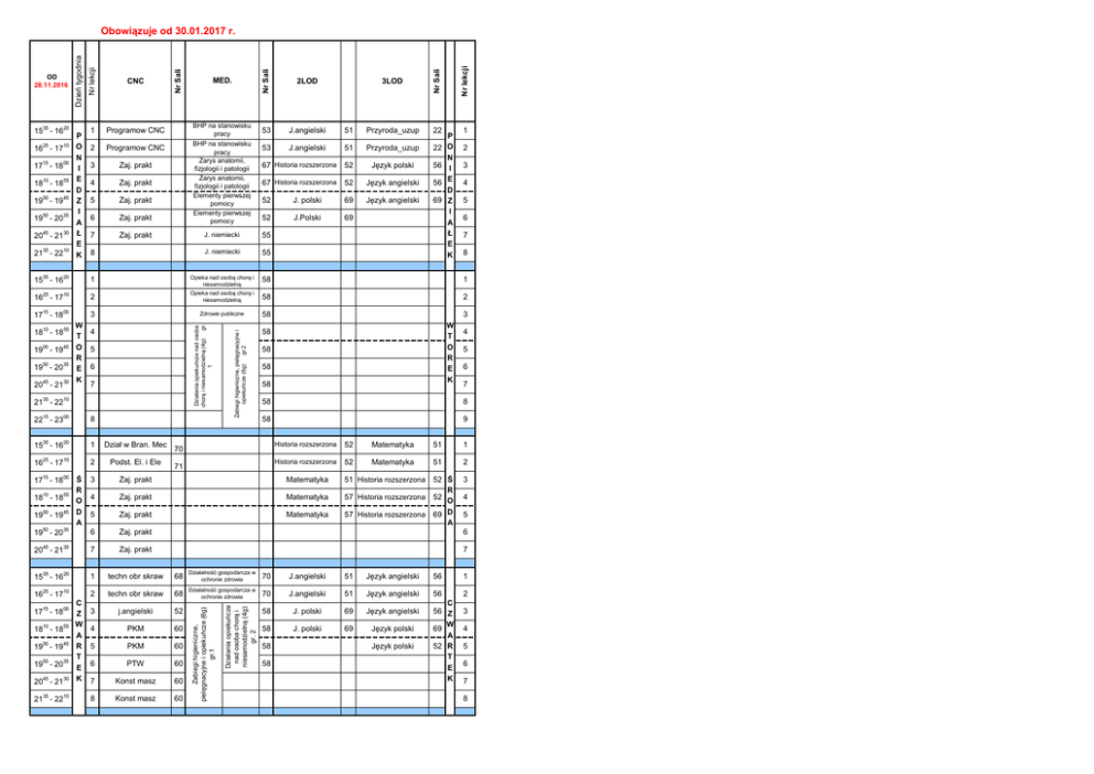 3LOD Nr Sali Nr lekcji 22 1 1 Programow CNC 2 Programow CNC 3 Zaj. prakt 4 Zaj. prakt 5 Zaj. prakt 6 Zaj. prakt BHP na stanowisku pracy BHP na stanowisku pracy Zarys anatomii, fizjologii i patologii Zarys anatomii, fizjologii i patologii Elementy pierwszej pomocy Elementy pierwszej pomocy 7 Zaj. prakt J. niemiecki 55 8 J. niemiecki 55 1535 - 1620 1 Opieka nad osobą chorą i niesamodzielną 58 1 1625 - 1710 2 Opieka nad osobą chorą i niesamodzielną 58 2 3 Zdrowie publiczne 58 10 15 00 16 - 17 17 - 18 1810 - 1855 00 19 - 19 45 1950 - 2035 2045 - 2130 35 21 - 22 15 17 - 18 10 00 W 1810 - 1855 T 1900 - 1945 O R 1950 - 2035 E K 2045 - 2130 4 5 6 7 53 J.angielski 51 Przyroda_uzup 53 J.angielski 51 Przyroda_uzup 67 Historia rozszerzona 52 Język polski 67 Historia rozszerzona 52 Język angielski 52 J. polski 69 Język angielski 52 J.Polski 69 P 22 O N 56 I 56 E D 69 Z I A Ł E K 2 3 4 5 6 7 8 3 W T O R E K 58 58 58 58 4 5 6 7 58 8 58 9 00 8 1535 - 1620 1 Dział w Bran. Mec 2 Podst. El. i Ele 3 Zaj. prakt Matematyka 4 Zaj. prakt Matematyka 5 Zaj. prakt Matematyka 6 Zaj. prakt 6 30 7 Zaj. prakt 7 1535 - 1620 1 techn obr skraw 68 Działalność gospodarcza w ochronie zdrowia 70 J.angielski 51 Język angielski 56 1 1625 - 1710 2 techn obr skraw 68 Działalność gospodarcza w ochronie zdrowia 70 J.angielski 51 Język angielski 56 2 58 J. polski 69 Język angielski 58 J. polski 69 Język polski 22 - 23 25 16 - 17 10 1715 - 1800 Ś R 1810 - 1855 O 1900 - 1945 D A 1950 - 2035 45 20 - 21 15 17 - 18 00 1810 - 1855 00 45 50 35 19 - 19 19 - 20 2045 - 2130 35 21 - 22 10 C Z W A R T E K 70 71 3 j.angielski 52 4 PKM 60 5 PKM 60 6 PTW 60 7 Konst masz 60 8 Konst masz 60 Zabiegi higieniczne, pielęgnacyjne i opiekuńcze (6g) gr.1 15 2LOD Działania opiekuńcze nad osoba chorą i niesamodzielną (4g) gr. 2 2135 - 2210 Zabiegi higieniczne, pielęgnacyjne i opiekuńcze (6g) gr.2 25 P O N I E D Z I A Ł E K Działania opiekuńcze nad osoba chorą i niesamodzielną (4g) gr. 1 1535 - 1620 MED. Nr Sali CNC OD 28.11.2016 Nr Sali Nr lekcji Dzień tygodnia Obowiązuje od 30.01.2017 r. 58 58 Historia rozszerzona 52 Matematyka 51 1 Historia rozszerzona 52 Matematyka 51 2 51 Historia rozszerzona 52 Ś R 57 Historia rozszerzona 52 O 57 Historia rozszerzona 69 D A Język polski C 56 Z W 69 A 52 R T E K 3 4 5 3 4 5 6 7 8