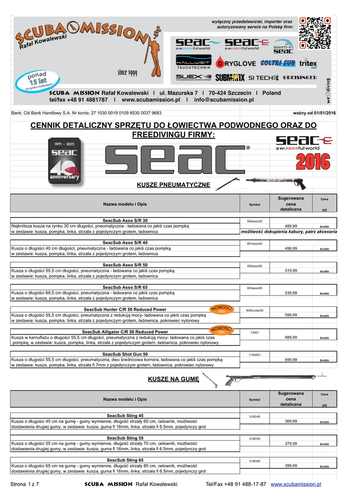 Bank: Citi Bank Handlowy S.A. Nr konta: 27 1030 0019 0109 8530 0037 9683 ważny od 01/01/2016 CENNIK DETALICZNY SPRZĘTU DO ŁOWIECTWA PODWODNEGO ORAZ DO FREEDIVINGU FIRMY: KUSZE PNEUMATYCZNE Nazwa modelu i Opis Symbol SeacSub Asso S/R 30 Najkrótsza kusza na rynku 30 cm długości, pneumatyczna - ładowana co jakiś czas pompką w zestawie: kusza, pompka, linka, strzała z pojedynczym grotem, ładownica Sugerowana cena detaliczna Cena [zł] 600asso30 489,99 brutto możliwość dokupienia kabury, patrz akcesoria! SeacSub Asso S/R 40 Kusza o długości 40 cm długości, pneumatyczna - ładowana co jakiś czas pompką w zestawie: kusza, pompka, linka, strzała z pojedynczym grotem, ładownica 601asso40 SeacSub Asso S/R 50 Kusza o długości 55,5 cm długości, pneumatyczna - ładowana co jakiś czas pompką w zestawie: kusza, pompka, linka, strzała z pojedynczym grotem, ładownica 499,99 brutto 519,99 brutto 539,99 brutto 599,99 brutto 889,99 brutto 899,99 brutto 602asso50 SeacSub Asso S/R 65 Kusza o długości 69,5 cm długości, pneumatyczna - ładowana co jakiś czas pompką w zestawie: kusza, pompka, linka, strzała z pojedynczym grotem, ładownica 603asso65 SeacSub Hunter C/R 50 Reduced Power Kusza o długości 55,5 cm długości, pneumatyczna z redukcją mocy- ładowana co jakiś czas pompką w zestawie: kusza, pompka, linka, strzała z pojedynczym grotem, ładownica, pokrowiec nylonowy SeacSub Alligator C/R 50 Reduced Power Kusza w kamuflażu o długości 55,5 cm długości, pneumatyczna z redukcją mocy- ładowana co jakiś czas pompką, w zestawie: kusza, pompka, linka, strzała z pojedynczym grotem, ładownica, pokrowiec nylonowy SeacSub Shot Gun 50 Kusza o długości 55,5 cm długości, pneumatyczna, dwu średnicowa komora, ładowana co jakiś czas pompką w zestawie: kusza, pompka, linka, strzała fi 7mm z pojedynczym grotem, ładownica, pokrowiec nylonowy 405hunter50 13001 1150001 KUSZE NA GUMĘ Nazwa modelu i Opis Symbol SeacSub Sting 45 Kusza o długości 45 cm na gumę - gumy wymienne, długość strzały 60 cm, celownik, możliwość dostawienia drugiej gumy, w zestawie: kusza, guma fi 16mm, linka, strzała fi 6.5mm, pojedynczy grot SeacSub Sting 55 Kusza o długości 55 cm na gumę - gumy wymienne, długość strzały 70 cm, celownik, możliwość dostawienia drugiej gumy, w zestawie: kusza, guma fi 16mm, linka, strzała fi 6.5mm, pojedynczy grot SeacSub Sting 65 Kusza o długości 65 cm na gumę - gumy wymienne, długość strzały 85 cm, celownik, możliwość dostawienia drugiej gumy, w zestawie: kusza, guma fi 16mm, linka, strzała fi 6.5mm, pojedynczy grot Strona 1 z 7 Scuba Mission Rafał Kowalewski Sugerowana cena detaliczna Cena [zł] 3180/45 369,99 brutto 379,99 brutto 399,99 brutto 3180/55 3180/65 Tel/Fax +48 91 488-17-87 www.scubamission.pl kusze na gumę cd... SeacSub Ghost 50 013000 529,99 Kusza o długości 50 cm na gumę X-Powerfull, gumy wymienne, długość strzały 85 cm, celownik, możliwość dostawienia drugiej gumy, w zestawie: kusza, guma fi 17,5mm, linka, strzała fi 6.25mm- 17-4PH, pojedynczy grot, mocowanie do opcjonalnego kołowrotka brutto SeacSub Condor 50 - z możliwością indywidualizacji 013000 629,99 Kusza o długości 50 cm na gumę X-Powerfull, gumy wymienne, długość strzały 85 cm, celownik, możliwość brutto dostawienia drugiej gumy, standardowa głowica, wąskie podparcie tylne, wykonana z antykorozyjnego aluminium AL6060, czerwona rączka, w zestawie: kusza, guma fi 17,5mm XP, kevlarowa żyłka, strzała fi 6.25mm- 17-4PH, pojedynczy grot, mocowanie do opcjonalnego kołowrotka, opcja indywidualizacji SeacSub Condor 60 - z możliwością indywidualizacji 017000 649,99 Kusza o długości 60 cm na gumę X-Powerfull, gumy wymienne, długość strzały 95 cm, celownik, możliwość brutto dostawienia drugiej gumy, standardowa głowica, wąskie podparcie tylne, wykonana z antykorozyjnego aluminium AL6060, czerwona rączka, w zestawie: kusza, guma fi 17,5mm XP, kevlarowa żyłka, strzała fi 6.25mm- 17-4PH, pojedynczy grot, mocowanie do opcjonalnego kołowrotka, opcja indywidualizacji akcesoria do rozbudowy - indywidualizacji kusz Condor: głowica o średnicy fi 28mm do wyboru: GUN28, X-Fire, X-Fire One, Twin szerokie podparcie tylne: Standard Sternal Rest kolor rączki: biała, zielona, żółta kołowrotek Gun Reel 30, przewidziany na 30 m linki GŁ SSR HC RGR 99,99 49,99 59,99 185,99 brutto brutto brutto brutto KUSZE NA SPRĘŻYNE Nazwa modelu i Opis Symbol SeacSub Polpone Kusza o długości 60 cm na sprężyne - długość strzały 60 cm, centralnie umieszczona rękojeść w zestawie: kusza, linka, strzała z grotem Sugerowana cena detaliczna Cena [zł] 26001/50 339,99 brutto GROTY Nazwa modelu i Opis Symbol SeacSub Grot pojedyńczy Pojedyńczy grot, z pojedyńczyl listkiem, wykonany ze stali nierdzewnej Sugerowana cena detaliczna Cena [zł] 122 SeacSub Grot pojedyńczy MIG Pojedyńczy grot, z podwójnym listkiem i zwężonym profilem, wykonany ze stali nierdzewnej 35,99 brutto 49,99 brutto 55,99 brutto 35,99 brutto 45,99 brutto 49,99 brutto 45,99 brutto 49,99 brutto 55,99 brutto 59,99 brutto 128 MIG SeacSub Grot pojedyńczy Concorde Pojedyńczy grot, z podwójnym wydłużonym listkiem, wykonany ze stali nierdzewnej 139 SeacSub Grot 3 zębny Grot 3 zębny, wykonany ze stali nierdzewnej i nylonu z wbudowaną ładownicą 118/3 SeacSub Grot 3 zębny stalowy Grot 3 zębny, wykonany ze stali nierdzewnej, o wzmocnionej konstrukcji heavy duty 33001/3 SeacSub Grot 3 zębny SPECIAL Grot 3 zębny, o wydłużonych zębach, wykonany ze stali nierdzewnej i nylonu z wbudowaną ładownicą SeacSub Grot 4 zębny Grot 4 zębny, wykonany ze stali nierdzewnej i nylonu z wbudowaną ładownicą 109/C 118/4 SeacSub Grot 5 zębny Grot 5 zębny, wykonany ze stali nierdzewnej i nylonu z wbudowaną ładownicą 105 SeacSub Grot 5 zębny stalowy Grot 5 zębny, wykonany ze stali nierdzewnej, o wzmocnionej konstrukcji heavy duty 33001/5 SeacSub Grot 5 zębny 