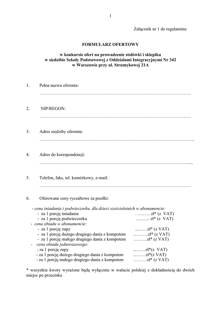 1 Załącznik nr 1 do regulaminu FORMULARZ OFERTOWY w konkursie ofert na prowadzenie stołówki i sklepiku w siedzibie Szkoły Podstawowej z Oddziałami Integracyjnymi Nr 342 w Warszawie przy ul. Strumykowej 21A 1. Pełna nazwa oferenta: ………………………………………………………………………………………… 2. NIP/REGON: ………………………………………………………………………………………… 3. Adres siedziby oferenta: …………………………………………………………………………………………... 4. Adres do korespondencji: ………………………………………………………………………………………...... 5. Telefon, faks, tel. komórkowy, e-mail: ………………………………………………………………………………………… 6. Oferowane ceny ryczałtowe za posiłki: - cena śniadania i podwieczorku dla dzieci sześcioletnich w abonamencie: - za 1 porcję śniadania . ….….. zł* (z VAT) - za 1 porcję podwieczorku …..….. zł* (z VAT) - cena obiadu w abonamencie: - za 1 porcję zupy ...……zł* (z VAT) - za 1 porcję dużego drugiego dania z kompotem .………zł* (z VAT) - za 1 porcję małego drugiego dania z kompotem ………zł* (z VAT) - cena obiadu jednorazowego: - za 1 porcję zupy ...……zł*(z VAT) - za 1 porcję dużego drugiego dania z kompotem ...……zł*(z VAT) - za 1 porcję małego drugiego dania z kompotem ………zł* (z VAT) * wszystkie kwoty wyrażone będą wyłącznie w walucie polskiej z dokładnością do dwóch miejsc po przecinku 2 7. Przykładowe menu (śniadanie, jeden zestaw obiadowy i podwieczorek) na 10 dni, zgodnie z warunkami określonymi w pkt. 8.8., pkt. 8.9., pkt. 8.11. i pkt. 8.12. regulaminu. śniadanie jeden zestaw obiadowy podwieczorek Dzień 1: ……………………….. ..…………………………… ………………………… ……………………….. …………………………….. ………………………… ……………………….. …………………………….. …………………………. ……………………….. …………………………….. …………………………. ……………………….. ……………………………... …………………………. Dzień 2: ……………………….. ..…………………………… ………………………… ……………………….. …………………………….. ………………………… ……………………….. …………………………….. ………………………… ……………………….. …………………………….. ………………………… ……………………….. …………………………….. ………………………… ……………………….. ..…………………………… ………………………… ……………………….. …………………………….. ………………………… ……………………….. …………………………….. ………………………… ……………………….. …………………………….. ………………………… ………………………. …………………………….. ………………………… ……………………….. ..…………………………… …………………………. ……………………….. …………………………….. …………………………. ………………………... …………………………….. ………………………….. ………………………... …………………………….. ………………………….. ………………………... …………………………….. ………………………….. Dzień 3: Dzień 4: 3 Dzień 5: ……………………….. ..…………………………… …………………………. ……………………….. …………………………….. …………………………. ……………………….. …………………………….. …………………………. ………………………. …………………………….. …………………………. ………………………. …………………………….. …………………………. ……………………….. ..…………………………… ………………………….. ……………………….. …………………………….. ………………………….. ……………………….. ……………………………. ………………………….. ……………………….. …………………………….. ………………………….. ……………………….. …………………………….. ………………………….. ……………………….. ..…………………………… …………………………. ……………………….. …………………………….. …………………………. ………………………. ……………………………. ………………………….. ………………………. …………………………….. ………………………….. ……………………… ……………………………... ………………………….. Dzień 6: Dzień 7: Dzień 8: ……………………….. ..…………………………… ………………………… ……………………….. …………………………….. ………………………… ……………………….. …………………………….. ………………………… ……………………….. …………………………….. ………………………… ……………………….. …………………………….. ………………………… ……………………….. ..…………………………… ………………………… ……………………….. ……………………