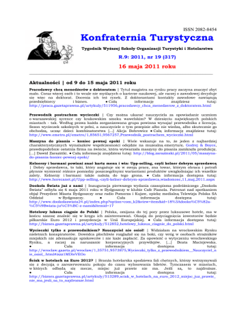 ISSN 2082-8454 Konfraternia Turystyczna Tygodnik Wyższej Szkoły Organizacji Turystyki i Hotelarstwa R.9: 2011, nr 19 (317) 16 maja 2011 roku __________________________________________________________________________ Aktualności | od 9 do 15 maja 2011 roku Pracodawcy chcą menedżerów z doktoratem | Tytuł magistra na rynku pracy zaczyna znaczyć zbyt mało. Coraz więcej osób i to wcale nie myślących o karierze naukowej, ale raczej o zawodowej decyduje się więc na doktorat. Docenia ich też rynek. Z doktorantami kontakty zawodowe nawiązują przedsiębiorcy i biznes. ● Całą informację znajdziesz tutaj: http://praca.gazetaprawna.pl/artykuly/511956,pracodawcy_chca_menedzerow_z_doktoratem.html Przewodnik postrachem wycieczki | Czy można ukarać nauczyciela za opowiadanie uczniom o warszawskiej syrence czy krakowskim smoku wawelskim? W dziesięciu największych polskich miastach - tak. Według prawa każda zorganizowana grupa powinna wynająć przewodnika z licencją. Sezon wycieczek szkolnych w pełni, a nauczyciele o tym przepisie albo nie wiedzą, albo skutecznie go obchodzą, ucząc dzieci kombinatorstwa [...] Alicja Bobrowicz ● Całą informację znajdziesz tutaj: http://www.emetro.pl/emetro/1,85651,9567257,Przewodnik_postrachem_wycieczki.html Maszyna do pisania – koniec pewnej epoki | Wiele wskazuje na to, że jeden z najbardziej charakterystycznych wynalazków współczesności odejdzie na muzealną emeryturę. Godrej & Boyce, prawdopodobnie ostatnia firma na świecie, która wytwarzała maszyny do pisania zamknęła produkcję. […] Dawid Zarazińki. ● Całą informację znajdziesz tutaj: http://blog.zarazinski.pl/2011/05/maszynado-pisania-koniec-pewnej-epoki/ Kelnerzy i barmani powinni znać kartę menu i win: Upp-selling, czyli kelner dobrym sprzedawcą | Dobry sprzedawca, to taki, który angażuje się w swoją pracę, zna towar, którym obraca i potrafi płynnie wymienić różnice pomiędzy poszczególnymi wariantami produktów uwzględniając ich wszelkie zalety. Kelnerzy i barmani także należą do tego grona. ● Cała informacja dostępna tutaj: http://www.horecanet.pl/Upp-selling,-czyli-kelner-dobrym-sprzedawca,wiadomosc,11,maj,2011.aspx Dookoła Świata już z nami | Inauguracja pierwszego wydania czasopisma podróżniczego „Dookoła Świata” odbyła się 6 maja 2011 roku w Bydgoszczy w klubie Cafe Pianola. Patronat nad spotkaniem objął Prezydent Miasta Bydgoszczy oraz radio Pomorza i Kujaw, opiekę medialną Telewizja Polska SA Oddział w Bydgoszczy. ● Cała informacja dostępna tutaj: http://www.dookolaswiata24.pl/index.php?option=com_k2&view=item&id=18%3Adooko%C5%82a%C5%9Bwiata-ju%C5%BC-z-nami&Itemid=17 Hotelowy luksus ciągnie do Polski | Polska, omijana do tej pory przez luksusowe hotele, ma w końcu szansę znaleźć się w kręgu ich zainteresowań. Okazją do przyciągnięcia inwestorów będzie piłkarskie Euro 2012 i prezydencja w Unii Europejskiej. ● Cała informacja dostępna tutaj: http://biznes.gazetaprawna.pl/artykuly/512852,hotelowy_luksus_ciagnie_do_polski.html Wycieczki tylko z przewodnikiem? Nauczyciel nie osioł! | Widziałam na wrocławskim Rynku nieletnich konspiratorów. Dowódca płochliwie rozglądał się na boki, czy wróg w osobach strażników miejskich nie zdemaskuje spiskowców i nie każe zapłacić. Za opowieść o wytyczeniu wrocławskiego Rynku, a raczej za naruszanie korporacyjnych przywilejów. [...] Beata Maciejewska. ● Cała informacja dostępna tutaj: http://wroclaw.gazeta.pl/wroclaw/1,35751,9573875,Wycieczki_tylko_z_przewodnikiem__Nauczyciel_n ie_osiol_.html#ixzz1MDteVEOo Ścisk w hotelach na Euro 2012? | Branża hotelarska spodziewa fali chętnych, którzy wstrzymywali się z decyzją o zarezerwowaniu pokoju do czasu wylosowania biletów. Tymczasem w miastach, w których odbędą się mecze, miejsc już prawie nie ma. Jeśli są, to najdroższe. ● Cała informacja dostępna tutaj: http://biznes.gazetaprawna.pl/artykuly/513289,scisk_w_hotelach_na_euro_2012_miejsc_juz_prawie_ nie_ma_jesli_sa_to_najdrozsze.html Wyprodukują sobie przyszłych pracowników? Kierunki studiów szyte na miarę wielkiego biznesu | Na dziesięciu studentów studiów stacjonarnych w Polsce przypada jeden student studiów podyplomowych. W USA ten odsetek jest trzy-, a nawet czterokrotnie wyższy. Ale ta różnica już wkrótce może zniknąć. Polskie uczelnie coraz chętniej wchodzą we współpracę z biznesem. Powstają specjalistyczne cykle nauczania na studiach podyplomowych sprofilowane na zapotrzebowanie konkretnych firm. ● Cała informacja dostępna tutaj: http://praca.gazetaprawna.pl/artykuly/513288,wyprodukuja_sobie_pracownikow_kierunki_studiow_s zyte_na_miare_wielkiego_biznesu.html Globus wrócił na swoje miejsce | Na dachu budynku na rogu Brackiej i Al. Jerozolimskich znowu pojawił się charakterystyczny globus. To replika neonu, który został zdemontowany w połowie marca ze względu na zły stan techniczny. ● Cała informacja dostępna tutaj: http://www.tvnwarszawa.pl/informacje,news,globus-wraca-na-swoje-miejsce,199366.html KONFERENCJE NAUKOWE I BRANŻOWE – zapowiedzi Problemy rozwoju turystyki na obszarach wiejskich: doświadczenia europejskie międzynarodowa konferencja naukowa, Biała Waka (Litwa), 14-18 września 2011 roku Celem konferencji jest prezentacja wyników badań naukowych oraz praktycznych doświadczeń dotyczących rozwoju turystyki na obszarach wiejskich w Europie, integracja środowiska naukowców i praktyków oraz wskazanie możliwości dalszych poszukiwań badawczych, dotyczących turystycznego rozwoju obszarów niezurbanizowanych. W ramach zakresu problemowego planowane jest uwzględnienie następujących obszarów: ● ogólne zagadnienia dotyczące rozwoju turystyki, ● potencjał turystyczny regionu, ● produkt regionalny i jego promocja, ● osiągnięcia i bariery w rozwoju agroturystyki, ● komunikowanie i doradztwo w rozwoju agroturystyki, ● partnerstwo na rzecz rozwo
