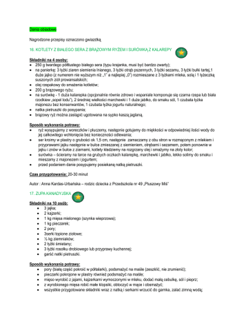 Dania obiadowe Nagrodzone przepisy oznaczono gwiazdką 16. KOTLETY Z BIAŁEGO SERA Z BRĄZOWYM RYŻEM I SURÓWKĄ Z KALAREPY Składniki na 4 osoby: • 250 g twardego półtłustego białego sera (typu krajanka, musi być bardzo zwarty); • na panierkę: 3 łyżki ziaren siemienia lnianego, 3 łyżki otrąb pszennych, 3 łyżki sezamu, 3 łyżki bułki tartej,1 duże jajko (z numerem nie wyższym niż „1” a najlepiej „0”) rozmieszane z 3 łyżkami mleka, solą i 1 łyżeczką suszonych ziół prowansalskich; • olej rzepakowy do smażenia kotletów; • 200 g brązowego ryżu; • na surówkę - 1 duża kalarepka (opcjonalnie równie zdrowo i wspaniale komponuje się czarna rzepa lub biała rzodkiew „sopel lodu”), 2 średniej wielkości marchewki i 1 duże jabłko, do smaku sól, 1 czubata łyżka majonezu bez konserwantów, 1 czubata łyżka jogurtu naturalnego; • natka pietruszki do posypania; • brązowy ryż można zastąpić ugotowana na sypko kaszą jaglaną. Sposób wykonania potrawy: • ryż wysypujemy z woreczków i płuczemy, następnie gotujemy do miękkości w odpowiedniej ilości wody do jej całkowitego wchłonięcia bez konieczności odlewania; • ser kroimy w plastry o grubości ok 1,5 cm, następnie zamaczamy z obu stron w rozmąconym z mlekiem i przyprawami jajku następnie w bułce zmieszanej z siemieniem, otrębami i sezamem, potem ponownie w jajku i znów w bułce z ziarnami, kotlety kładziemy na rozgrzany olej i smażymy na złoty kolor; • surówka – ścieramy na tarce na grubych oczkach kalarepkę, marchewki i jabłko, lekko solimy do smaku i mieszamy z majonezem i jogurtem; • przed podaniem danie posypujemy posiekaną natką pietruszki. Czas przygotowania: 20-30 minut Autor : Anna Kardas-Urbańska – rodzic dziecka z Przedszkola nr 49 „Pluszowy Miś” 17. ZUPA KANADYJSKA Składniki na 10 osób: • 3 jajka; • 2 kajzerki; • 1 kg mięsa mielonego (szynka wieprzowa); • 1 kg pieczarek; • 2 pory; • 3serki topione ziołowe; • ½ kg ziemniaków; • 2 łyżki śmietany; • 3 łyżki rosołku drobiowego lub przyprawy kuchennej; • garść natki pietruszki. Sposób wykonania potrawy: • pory (białą część pokroić w półtalarki), podsmażyć na maśle (zeszklić, nie zrumienić); • pieczarki pokrojone w plastry również podsmażyć na maśle; • mięso wyrobić z jajami, kajzerkami wymoczonymi w mleku, dodać małą cebulkę, sól i pieprz; • z wyrobionego mięsa robić małe klopsiki, obtoczyć w mące i obsmażyć; • wszystkie przygotowane składniki wraz z natką i serkami wrzucić do garnka, zalać zimną wodą; • • po 15 minutach gotowania dodać pokrojone ziemniaki i gotować dalsze 15 minut; pod koniec dodać sól, pieprz i doprawić śmietaną. Czas przygotowania: 1 godzina. Przygotowanie dzień wcześniej klopsików znacznie skraca czas przygotowania. Autor : Danuta Szydło – pracownik Przedszkola nr 97 „Leśna Polanka” 18. FRYKADELKI INDYCZE Z RODZYNKAMI I MIGDAŁAMI W SOSIE CURRY Składniki na 6 osób: • 500 g mielonego mięsa z indyka; • 1 sucha kajzerka; • 2 cebule; • 20 g rodzynek; • 10 g płatków migdałowych; • 1 jajko; • 5 g przyprawy curry; • 500 ml wywaru z warzyw; • 200 ml śmietany kremówki; • 5 g mąki; • natka pietruszki; • sól, pieprz, cukier; • olej do smażenia. Sposób wykonania potrawy: • mięso dokładnie wymieszać z namoczoną i odciśniętą kajzerką, z jajem, posiekaną cebulą, połową rodzynek i połową płatków migdałowych sola i pieprzem; • z masy uformować nieduże owalne kotlety. obsmażyć je na rozgrzanym oleju i przełożyć do garnka; • posypać curry, dodać pozostałe rodzynki i płatki migdałowe; • śmietanę wymieszać z mąką, rozprowadzić wywarem warzywnym, doprawić curry, cukrem oraz solą i pieprzem; • wlać do frykadelek i dusić kilka minut na małym ogniu; • przed podaniem posypać posiekaną natką pietruszki; • podawać z ryżem parboiled; • surówka: mix sałat z kiełkami w jogurcie. Czas przygotowania: ok. 1 godziny Autor : Marzena Kolińska – pracownik Przedszkola nr 268 „Słoneczny Promyk” 19. WOŁOWE PULPETY Z KASZĄ KUSKUS I SURÓWKĄ Składniki na 10 osób: Składniki do pulpetów: • 70 dkg mięsa wołowego bez kości; • 20 dkg cebuli; • 20 dkg marchewki; • 10 dkg selera; • 10 dkg pietruszki; • 70 ml oleju do smażenia; • • • • • 10 dkg bułki tartej 5 dkg mąki; 1 jajo; szczypta soli, majeranku, pieprzu ziołowego; 1 ząbek czosnku. Składniki na surówkę: 1 kg selera; 1 kg marchwi; 50 dkg jabłek (szara reneta); odrobina cukru i sczypta soli. Składniki na kaszę: • 50 dkg kaszy kuskus Składniki na kompot: • 1 kg mrożonych owoców; • 10 dkg cukru; • woda. Sposób wykonania potrawy: • • • • • mięso wołowe mielimy; • cebulę, marchew, pietruszkę i seler gotujemy w 1 szklance wody przez 10-15 minut; • do zmielonego mięsa dokładamy jajo, połowę bułki tartej, szczyptę soli, szczyptę majeranku, szczyptę pieprzu ziołowego, roztarty ząbek czosnku i dokładnie mieszamy; • formujemy okrągłe pulpety i każdy obtaczamy w mące i bułce tartej; • smażymy na oleju; • warzywa miksujemy blenderem razem z wodą w której się gotowały; • do warzyw wkładamy usmażone pulpety i gotujemy na małym ogniu przez 10 minut. pulpety są gotowe do podania; • kaszę kuskus przygotowujemy zgodnie z zaleceniami producenta; • seler, marchewkę i jabłka do surówki ścieramy na tarce jarzynowej. doprawiamy odrobiną cukru i szczyptą s • mieszamy; • owoce na kompot zalewamy wodą i chwilę gotujemy; • wsypujemy cukier i mieszamy. Czas przygotowania: ok. 45 minut Autor : Barbara Winnicka – pracownik Przedszkola nr 287 im. „Piotrusia Pana” 20. ZUPA Z SOCZEWICY Składniki na 6 osób: • 360 g (dwie szklanki) czerwonej soczewicy; • 400 g (1 pęczek) selera naciowego; • 120 g (1 duża sztuka) cebuli; • 250 g (szklanka) kro